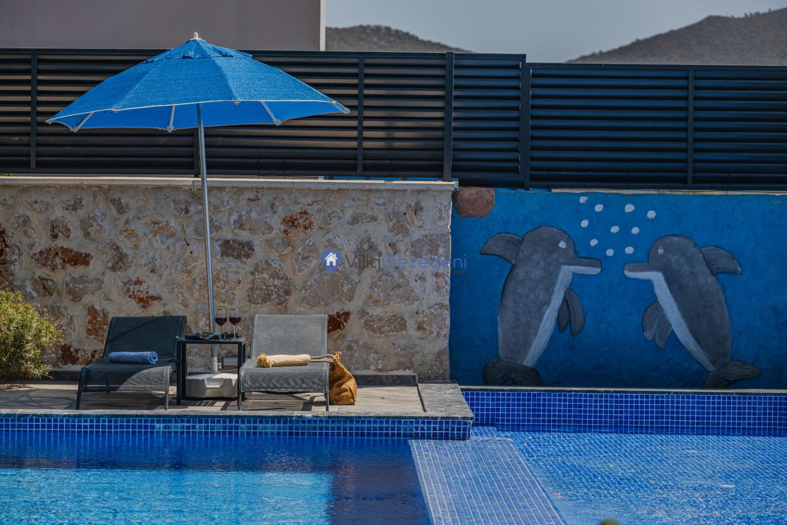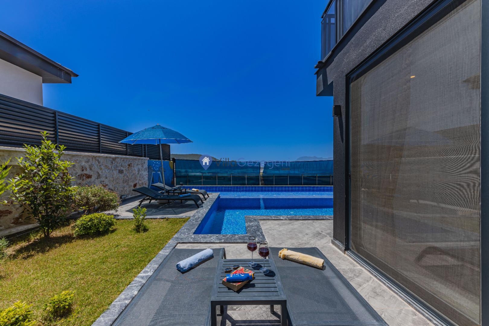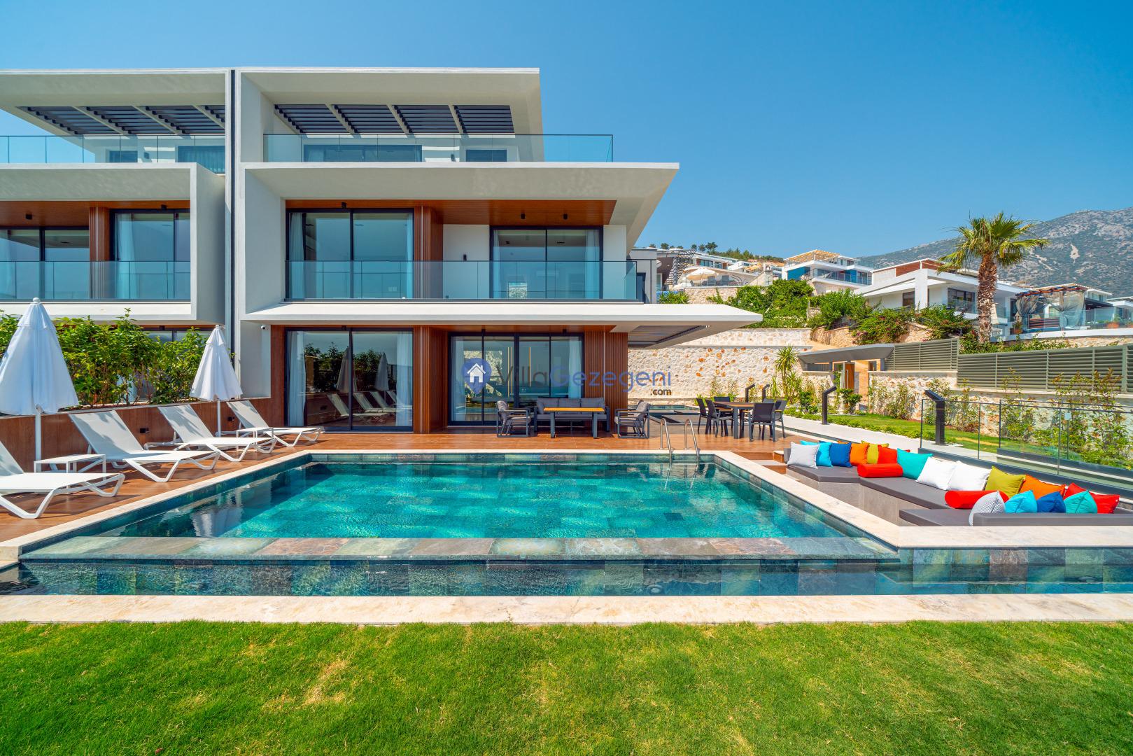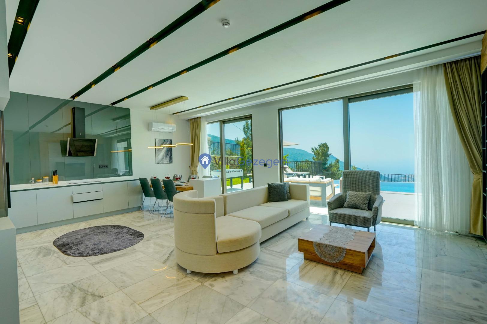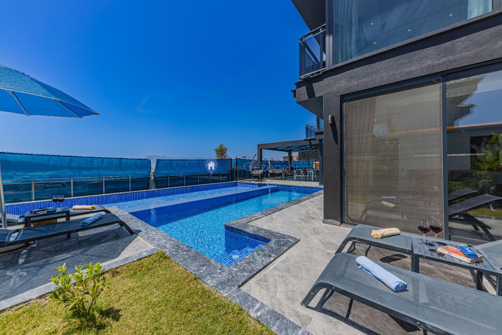 Kalkan'ın Kalamar mevkiisinde bulunan 3 odalı 6 kişilik lüks tasarıma sahip deniz manzaralı kiralık villa