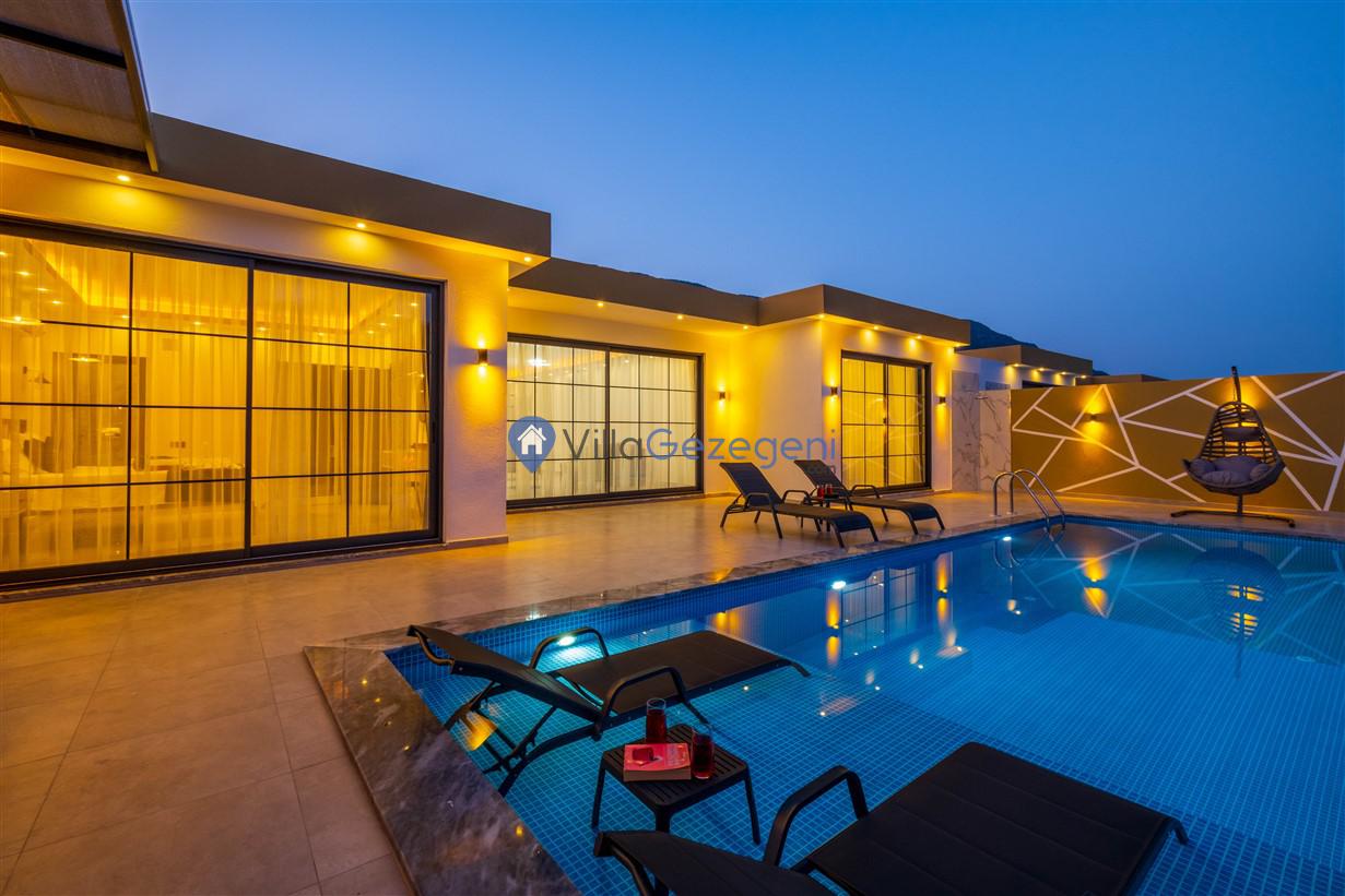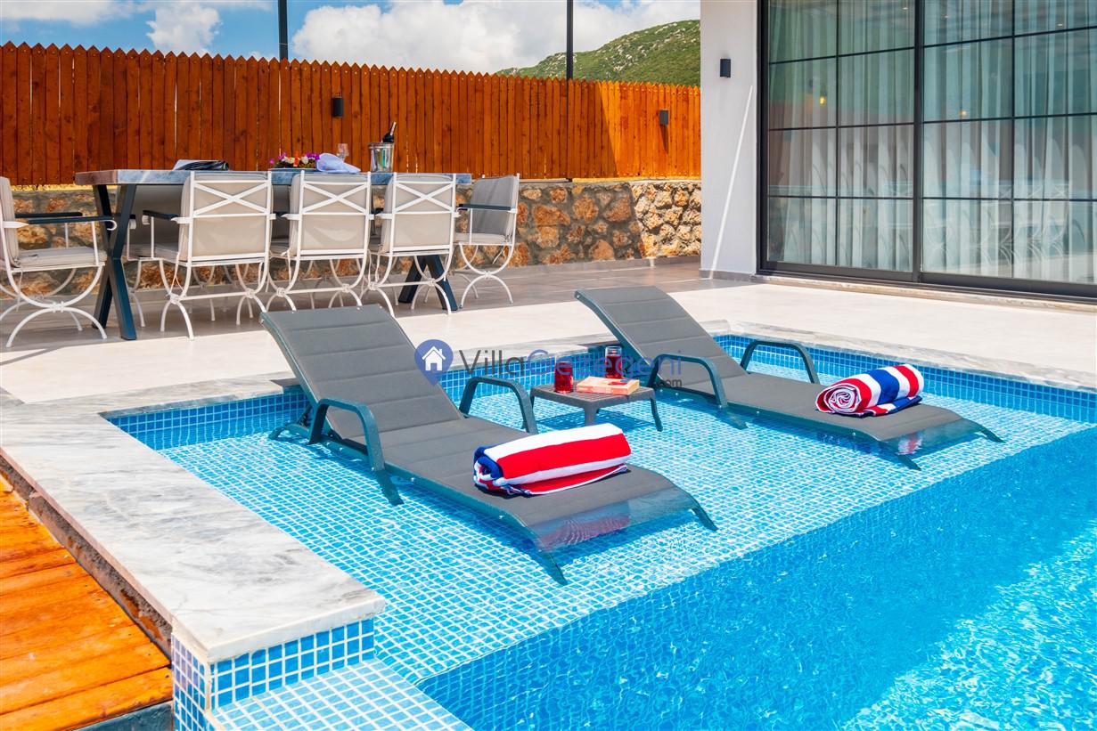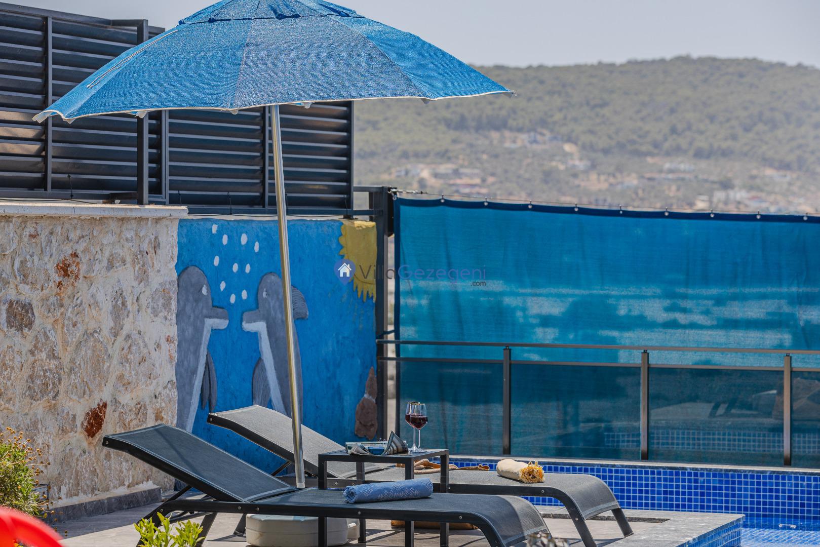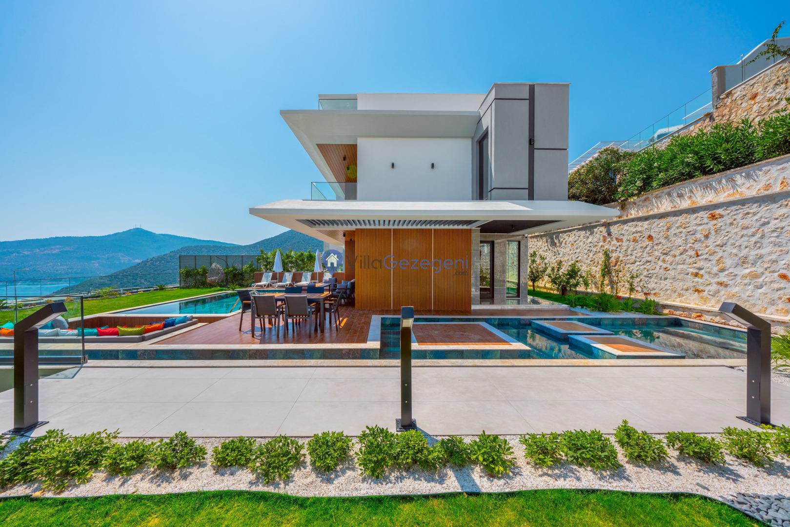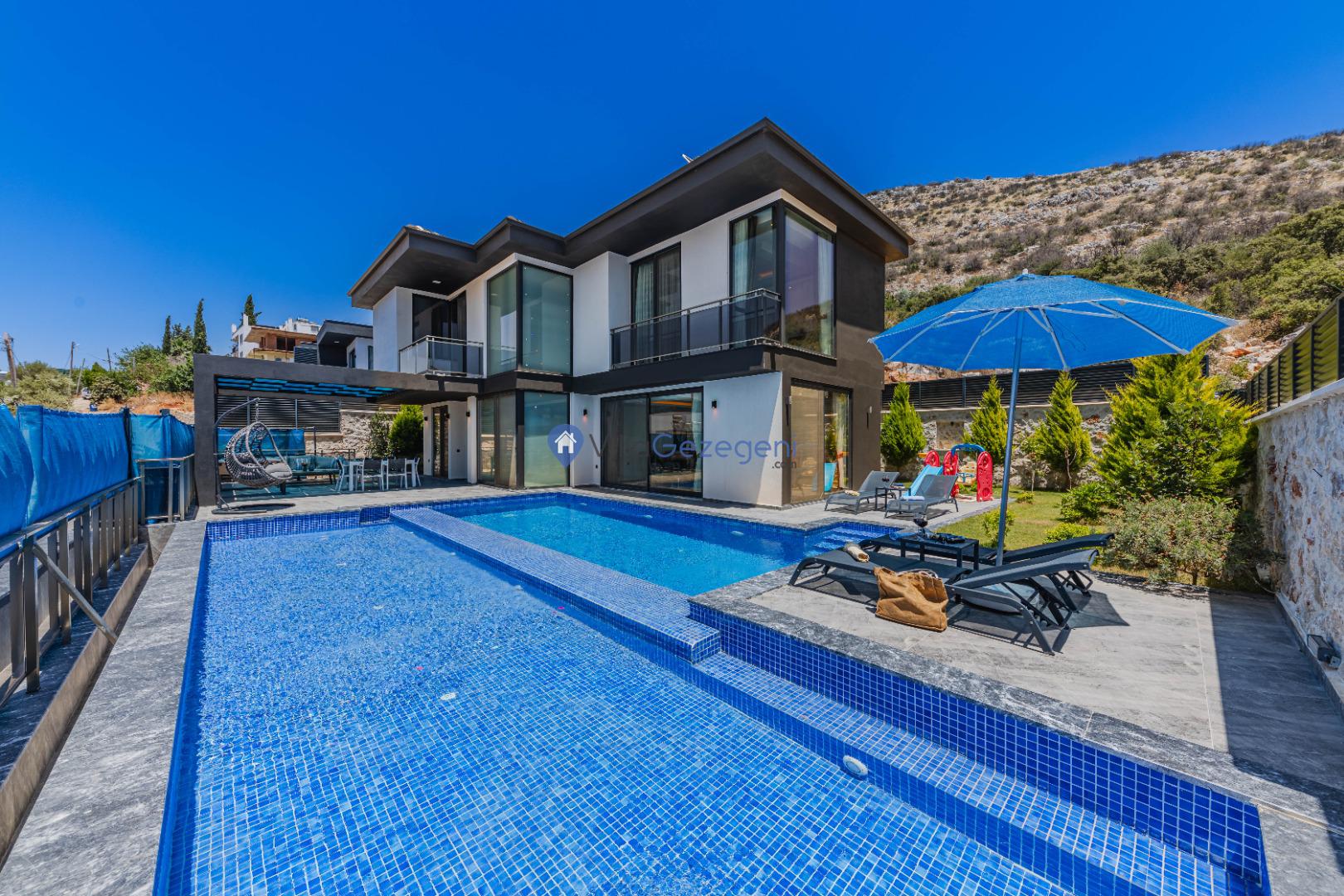 Kalkan'ın Kalamar mevkiisinde bulunan 3 odalı 6 kişilik lüks tasarıma sahip deniz manzaralı kiralık villa