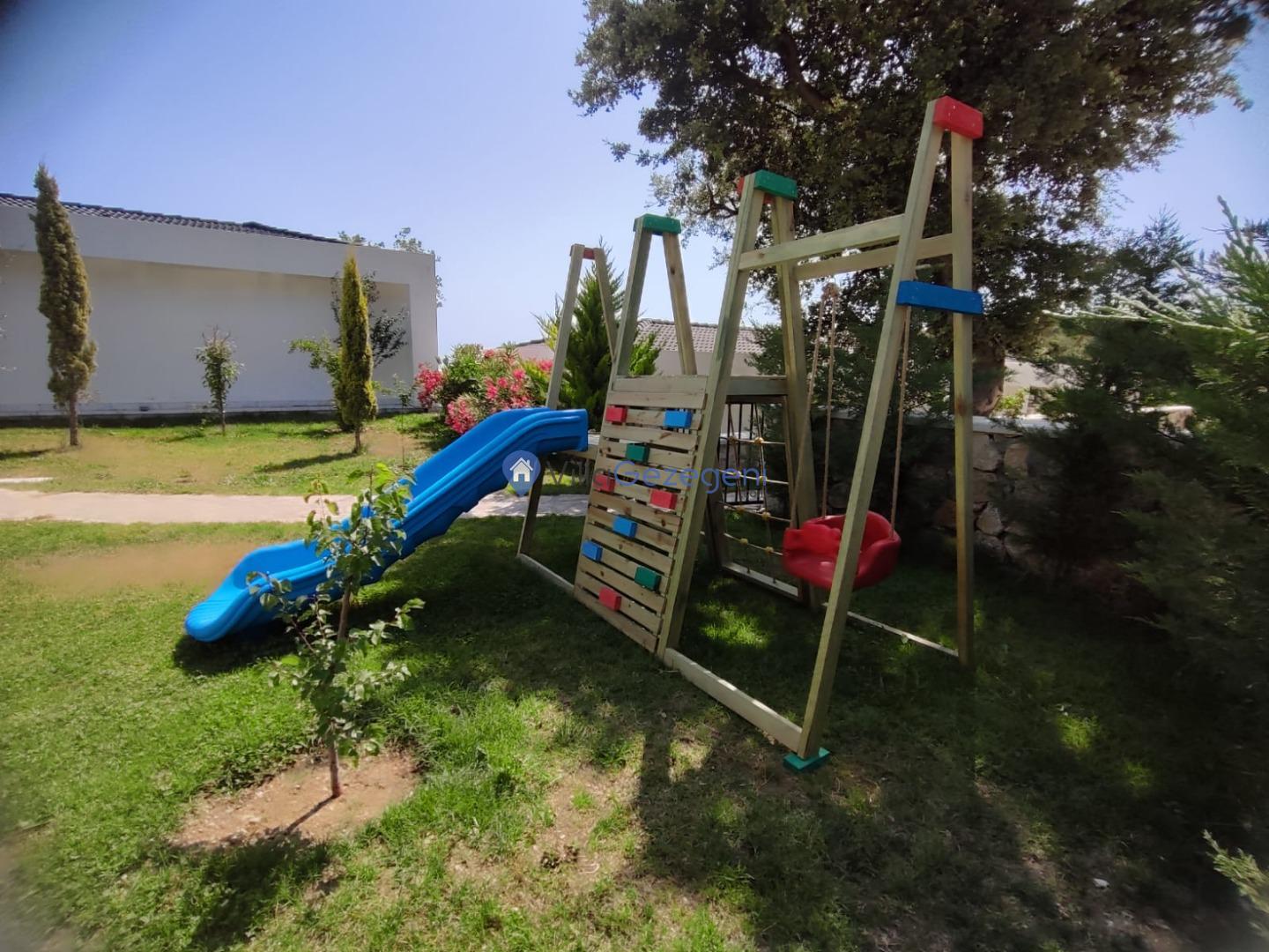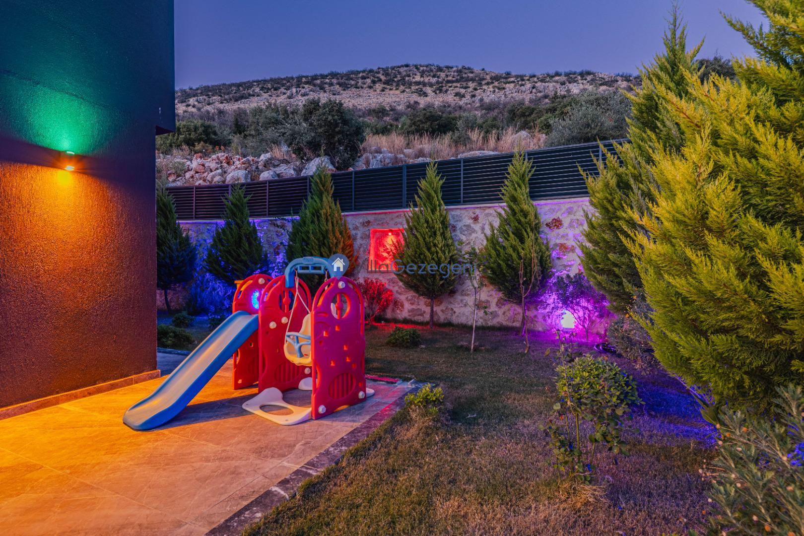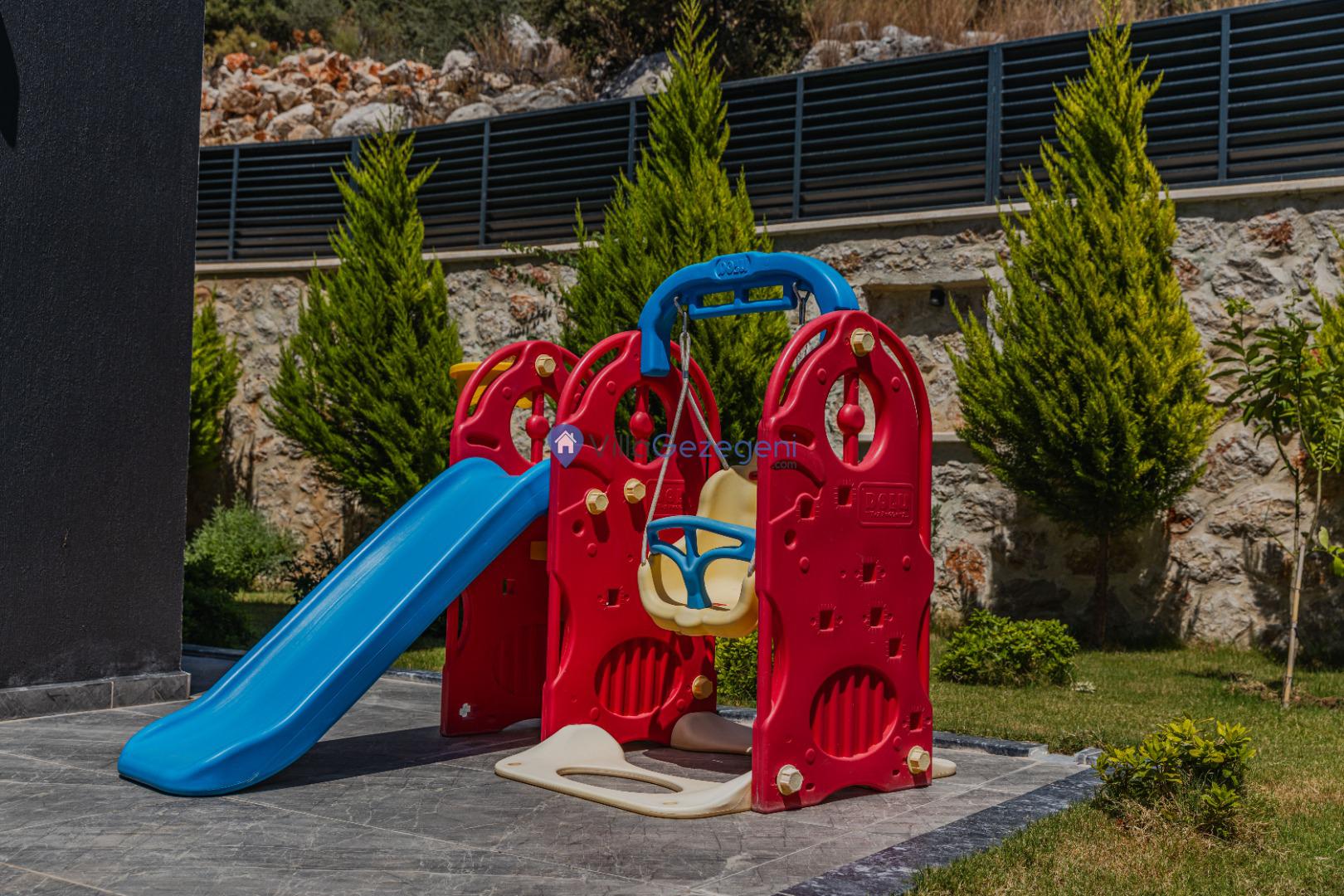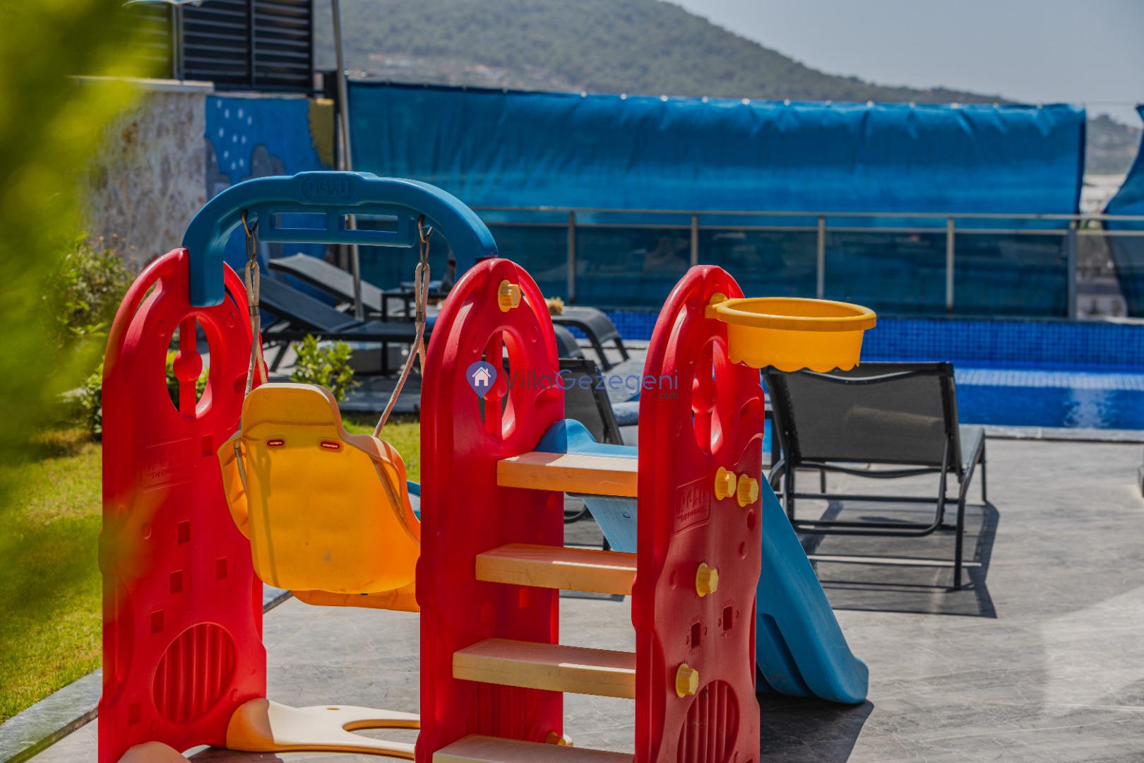 Bahçesinde çocuklar için oyun alanı bulunan deniz manzaralı korunaklı villa