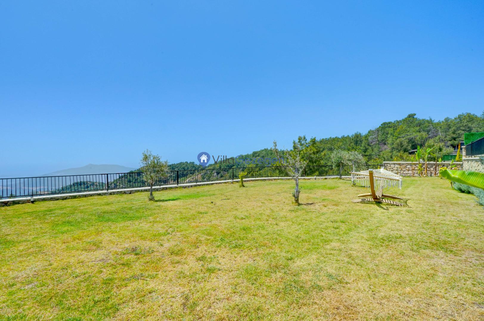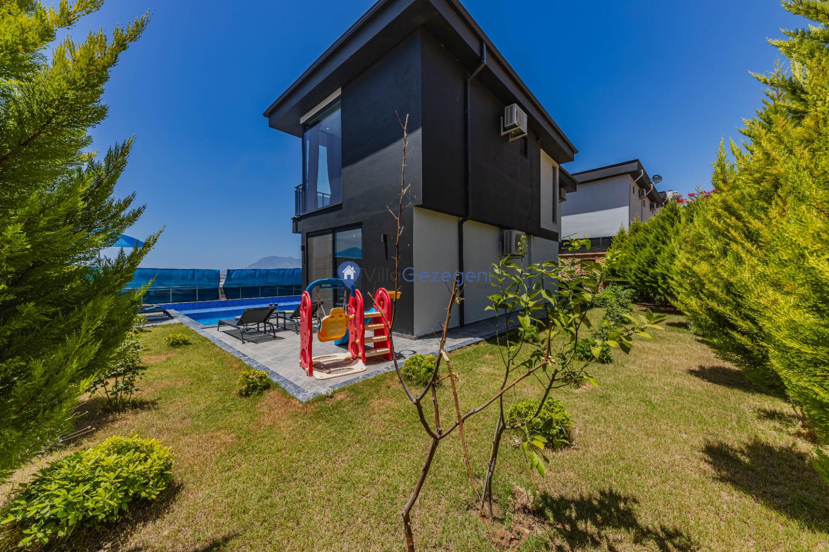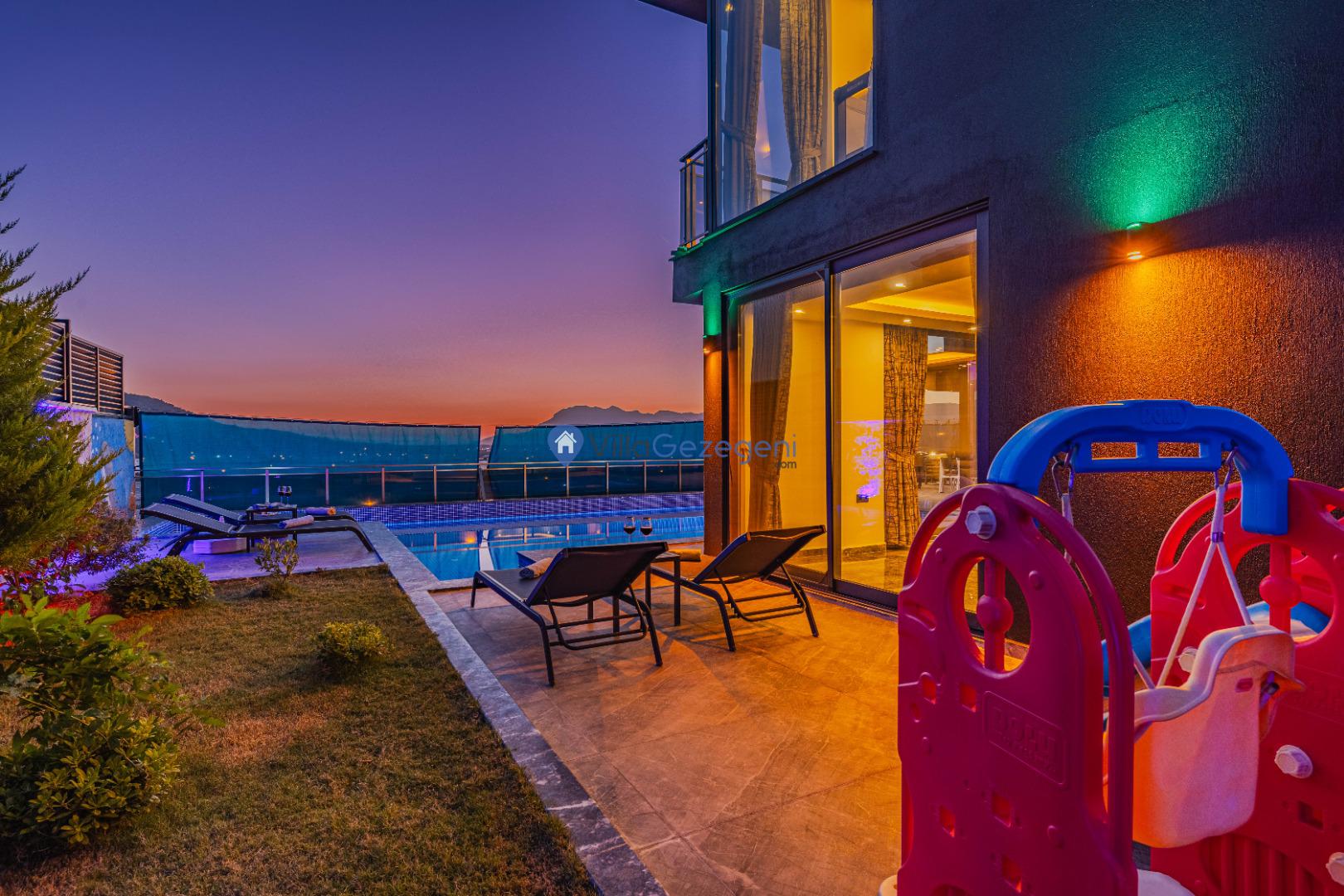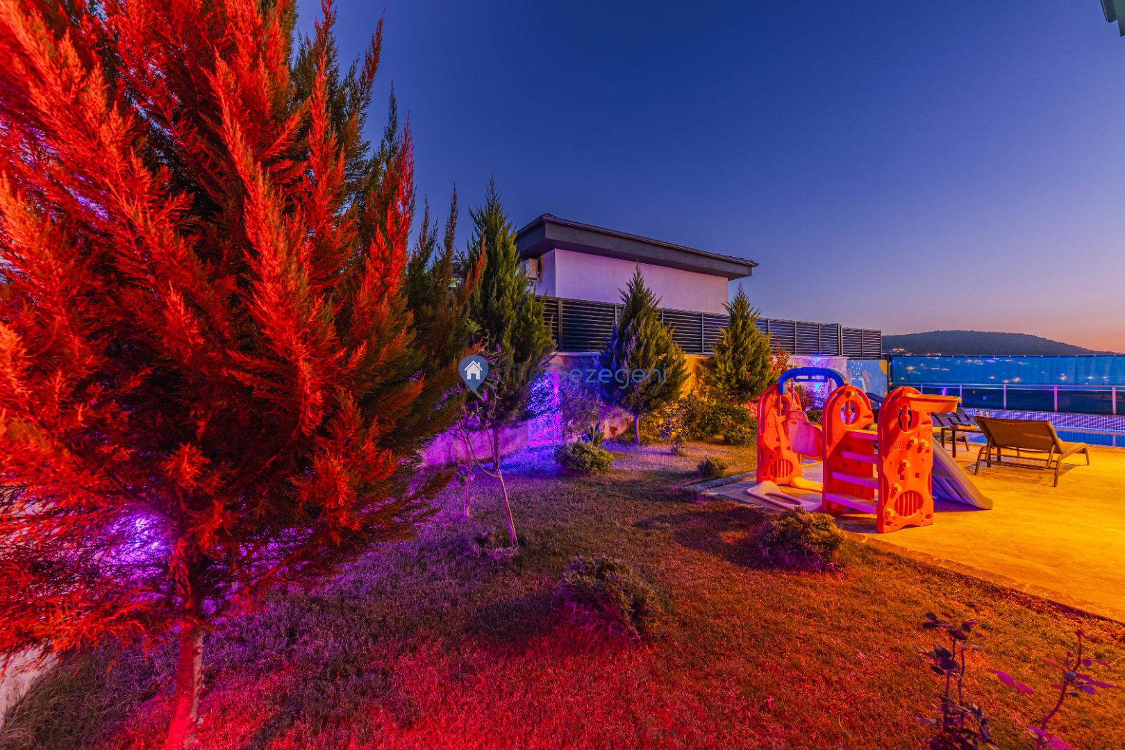 Bahçesinde çocuklar için oyun alanı bulunan deniz manzaralı korunaklı villa