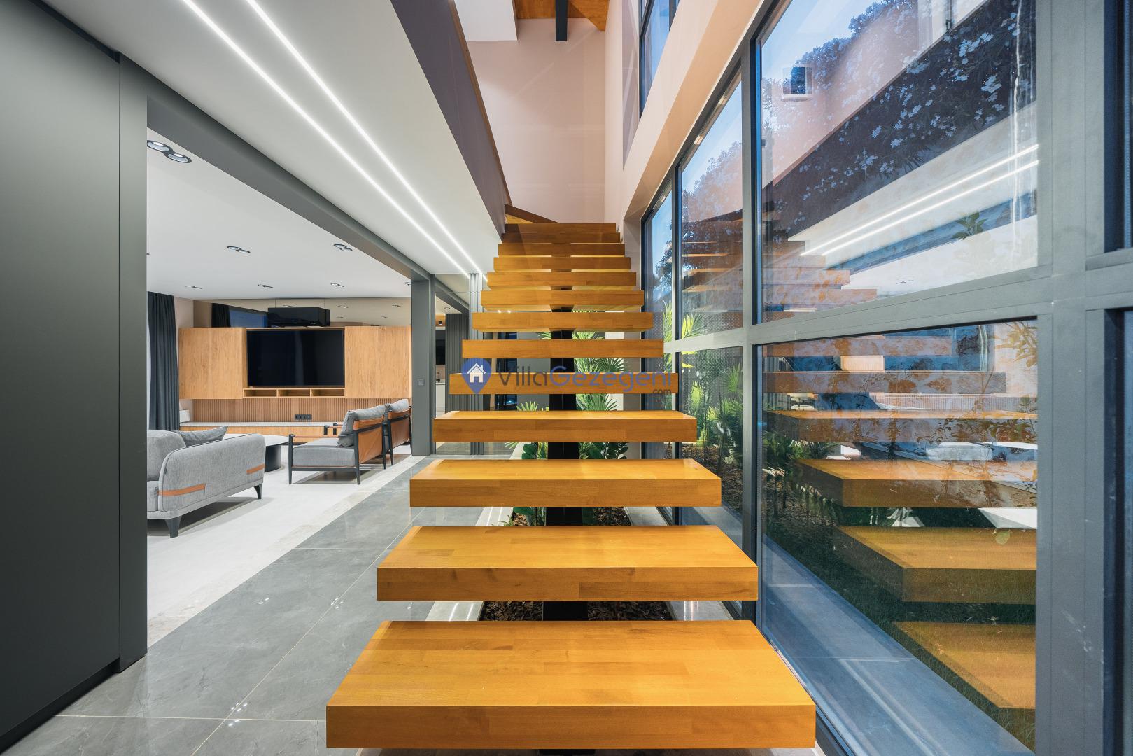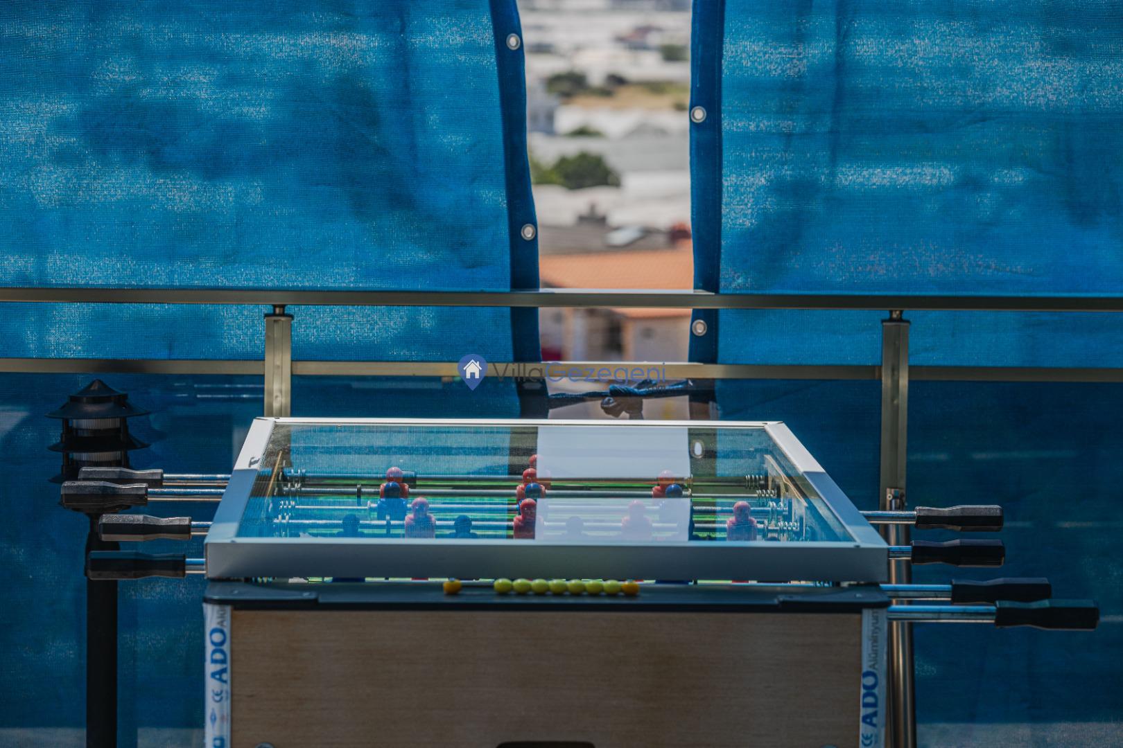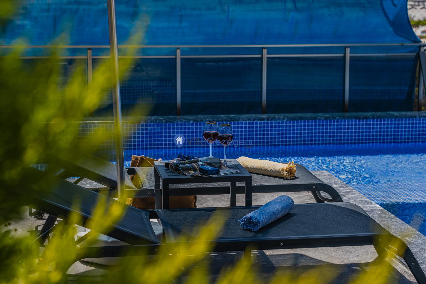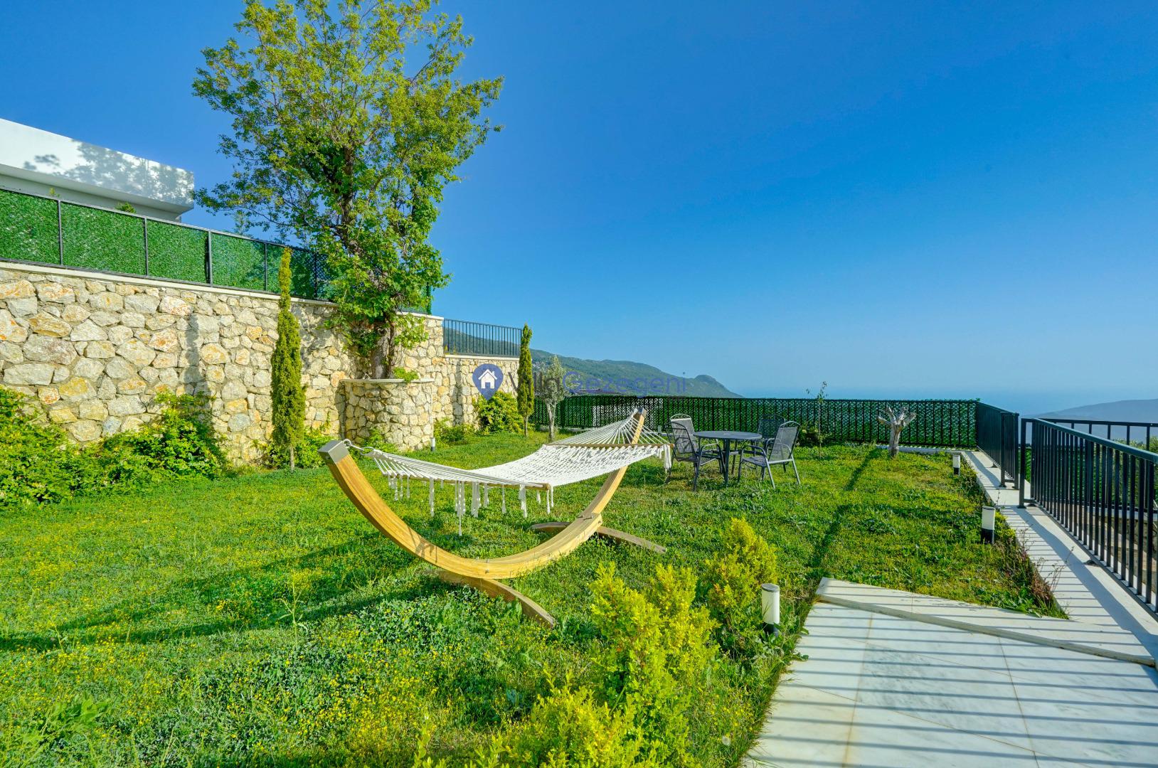 Bahçesinde çocuklar için oyun alanı bulunan deniz manzaralı korunaklı villa