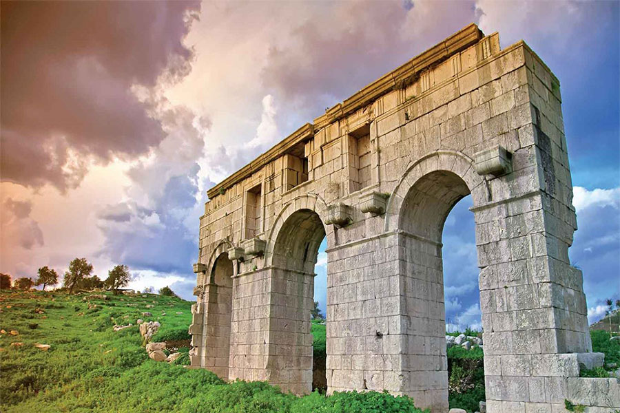 Gelemiş Köyü’nden 2 kilometre sonra yol kenarında Patara’daki kalıntıların en görkemlilerinden biri olan Roma Zafer Takı görülmektedir. Zafer Takı, M.S. 1. yüzyıl sonlarında yaptırılmıştır. Tepeye doğru görülebilen kalıntılar arasında Bizans bazilikası ve kutsal alanlar bulunmaktadır. Tiyatro tepenin yamacındadır. Tiyatronun yaslandığı tepede büyük bir sarnıç ile bir anıt mezar bulunmaktadır.