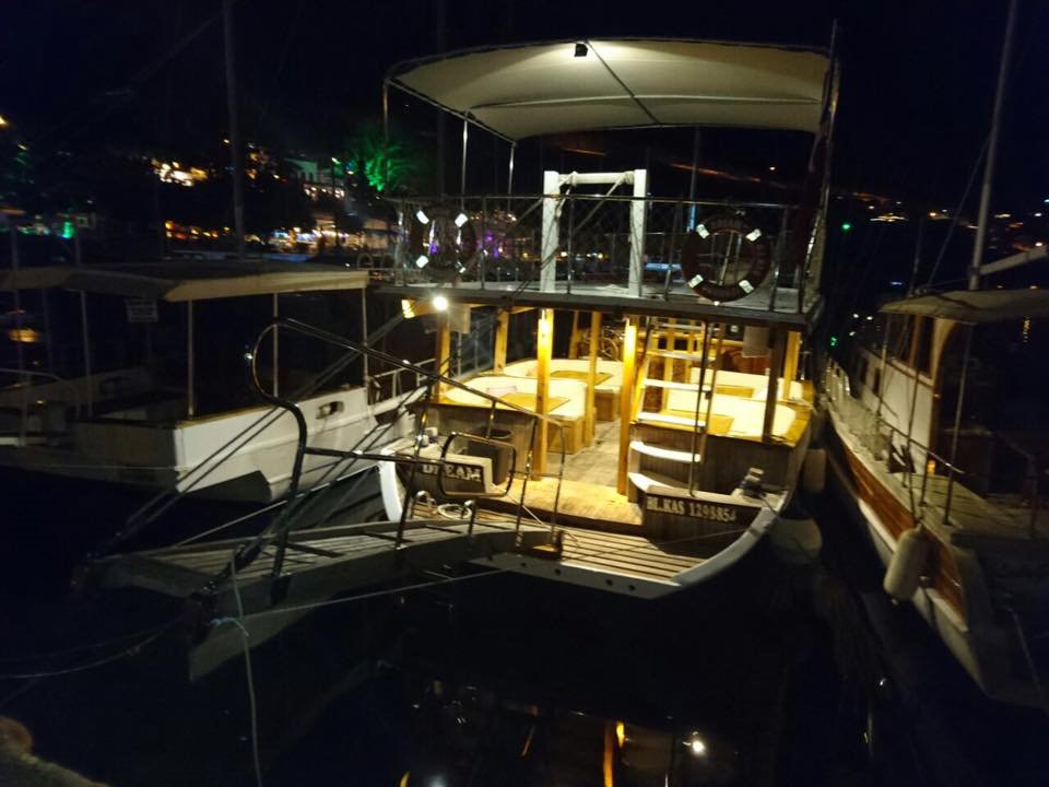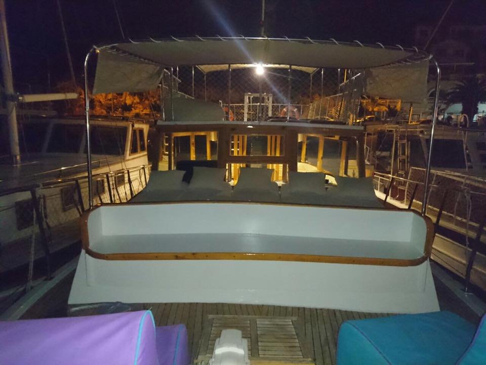 12 kişilik kapasiteye sahip olan bu şık tasarımlı ve lüks guletimizin ön tarafında seyir zamanı oturabileceğiniz oturma grubu bulunmaktadır.Güneşlenme alanı sadece ön tarafında bulunan bu teknemizin 1 adet WC'si mevcuttur.Arka tarafında aynı anda 12 kişinin yemek yiyebilceği büyük bir yemek masası ve keyifli oturma alanları ile sandalyeler bulunmaktadır.Kaptanın enfes mutfağında çıkan lezzetleri tadarken bu keyifli oturma yerlerinde mavinin tadını çıkarabilirsiniz.