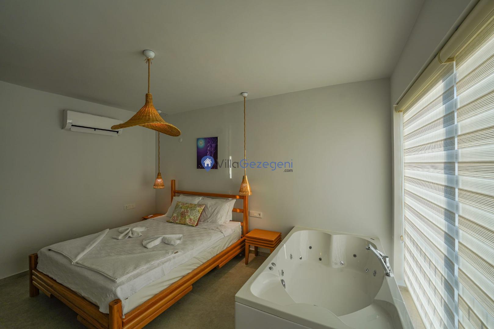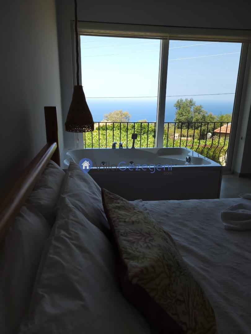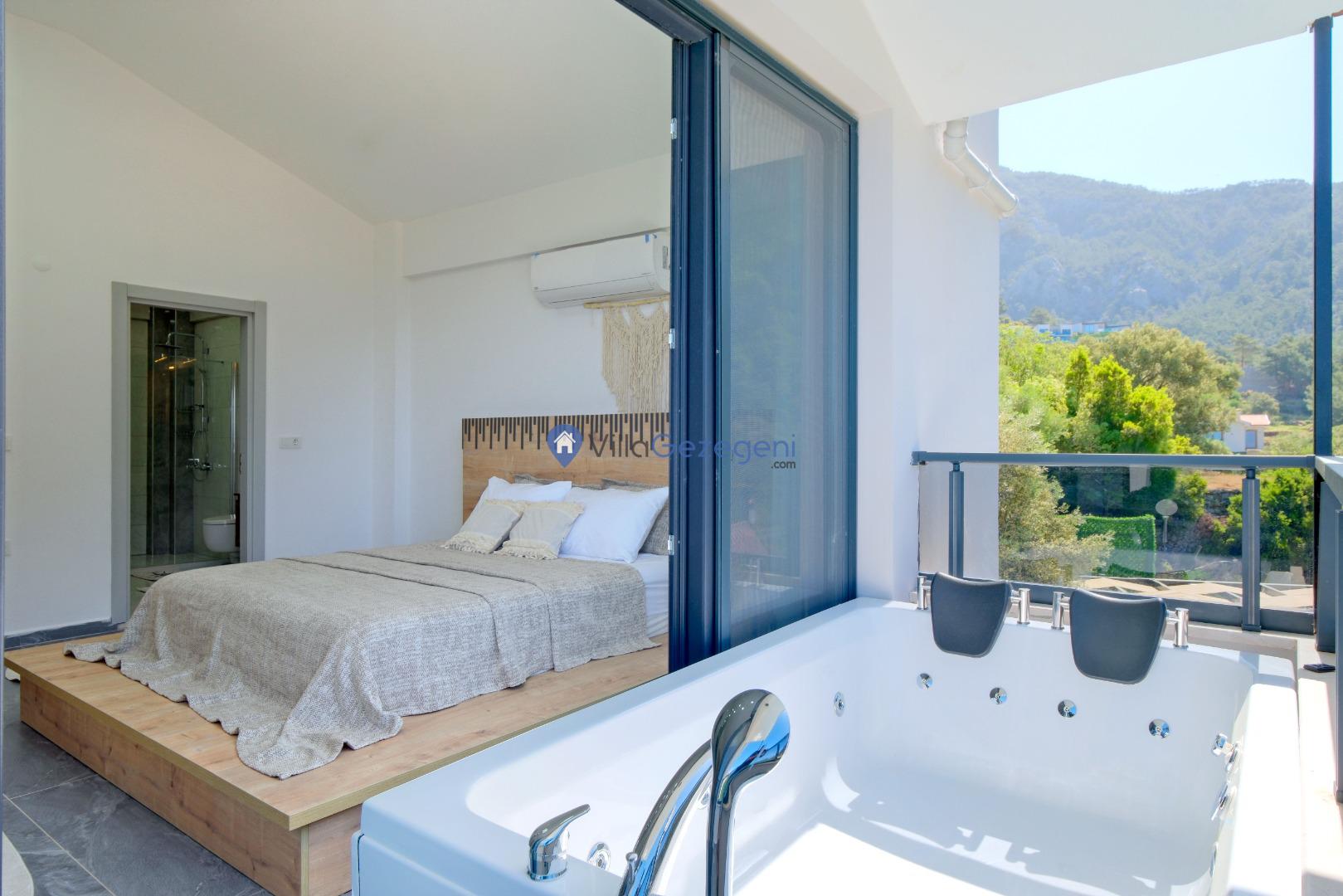 Fethiye Faralya bölgesinde yer alan tek yatak odalı 2 kişilik doğa içerisinde deniz manzaralı kiralık balayı villası.