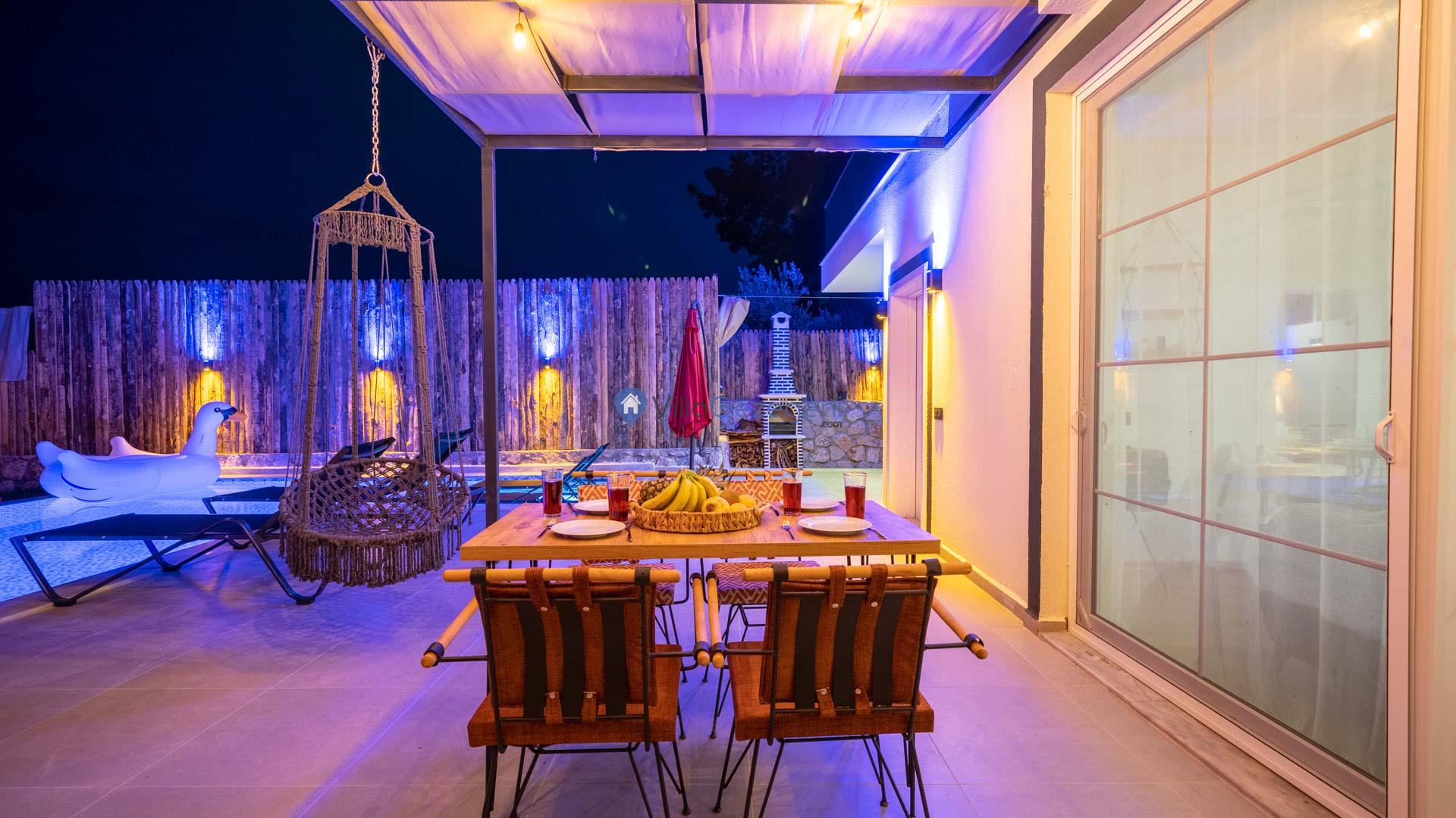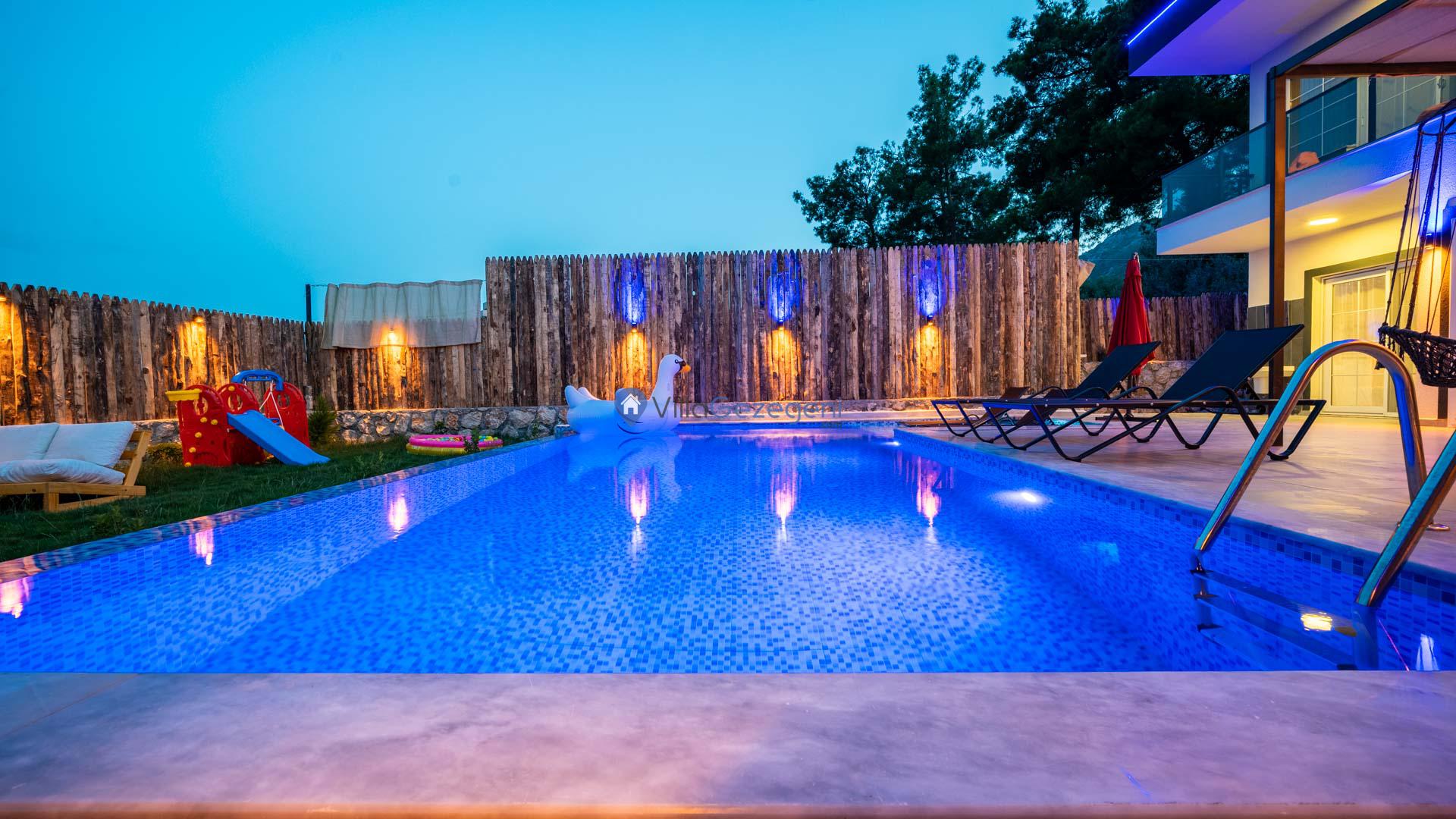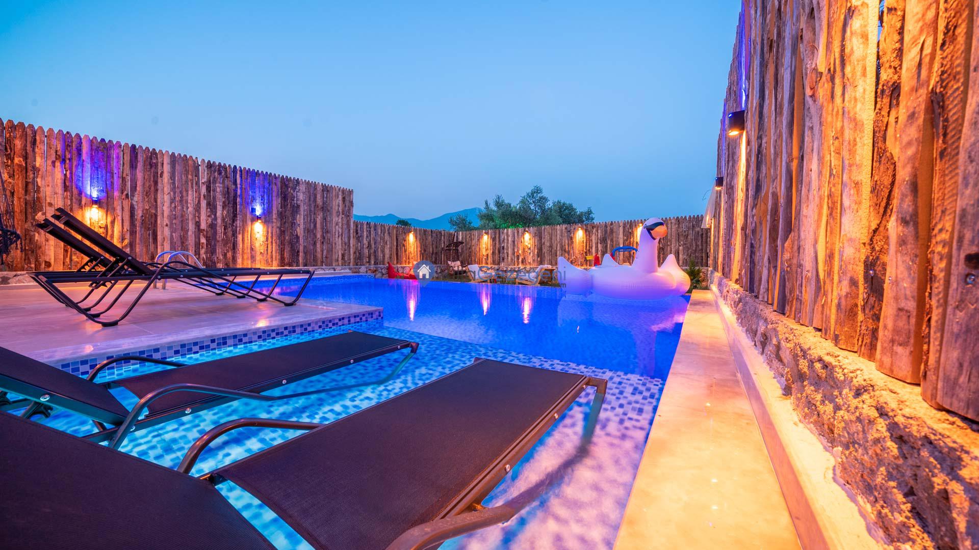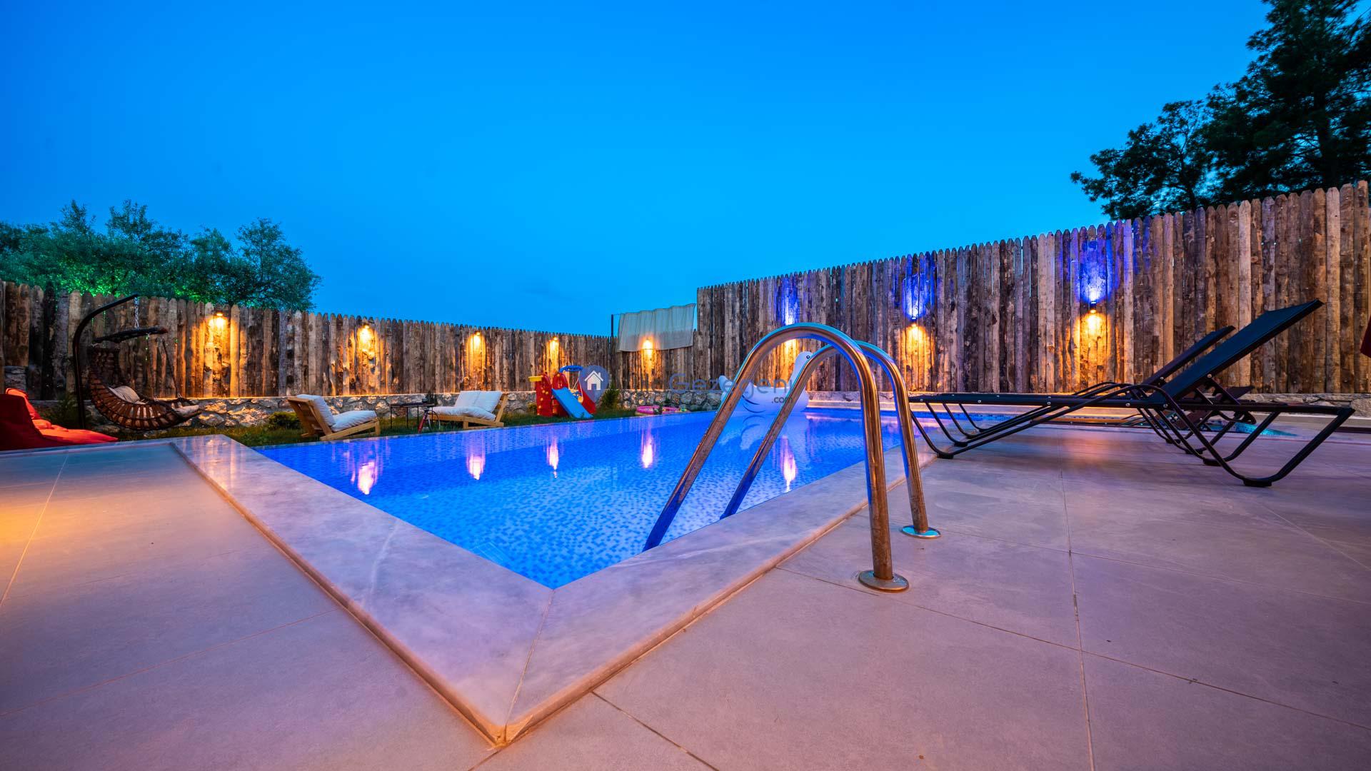 Akşam vakti açılan büyüleyici ışık sistemleri ile akşam havuz keyfinin sefası durmadan devam edebilirsiniz. Çünkü biliyoruz ki temiz, hijyenik ve bakteri barındırmayan havuzlarımızla, yüzmeye doyamayacaksınız. Ayrıca valizlerinize güneş kremlerinizi koymayı unutmayın. Villa bahçemizde yer alan şezlonglarda güneşlenme keyfini kaçırmak istemezsiniz.