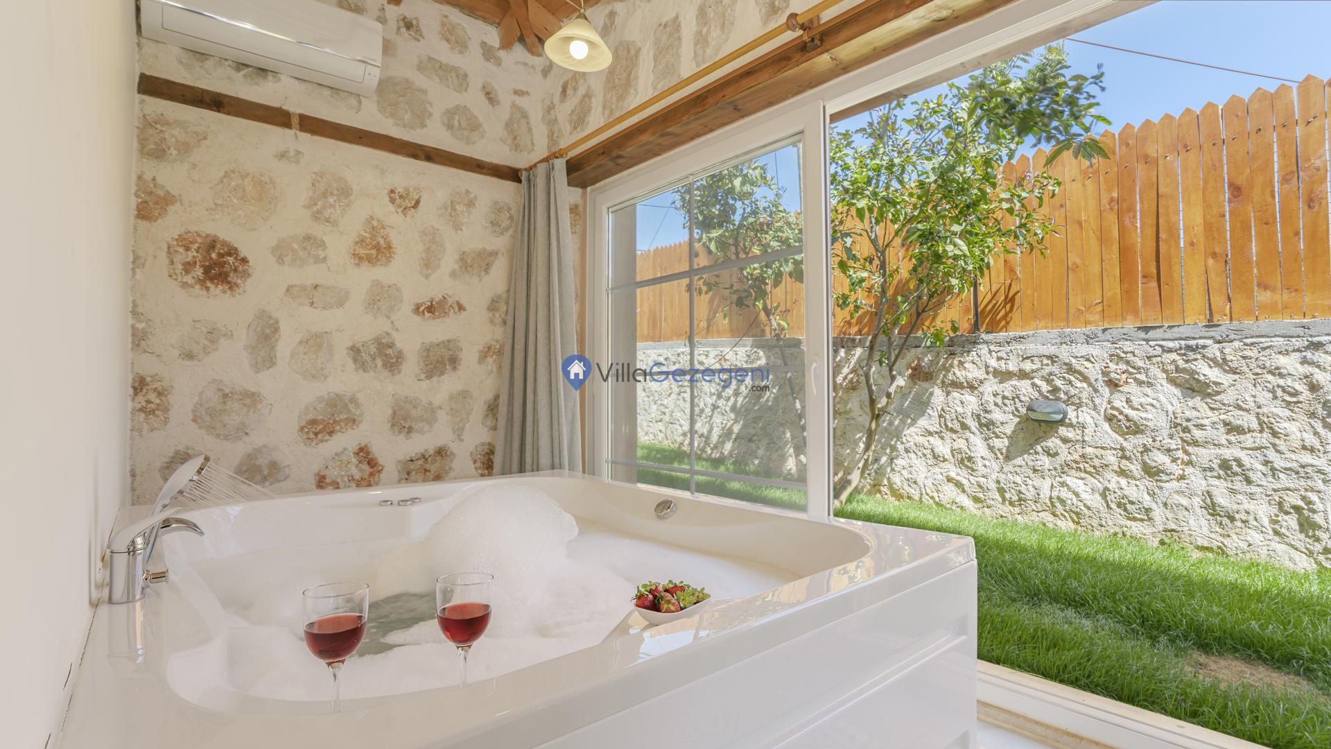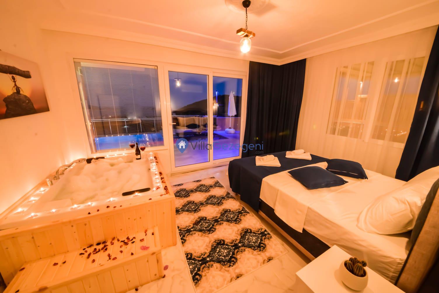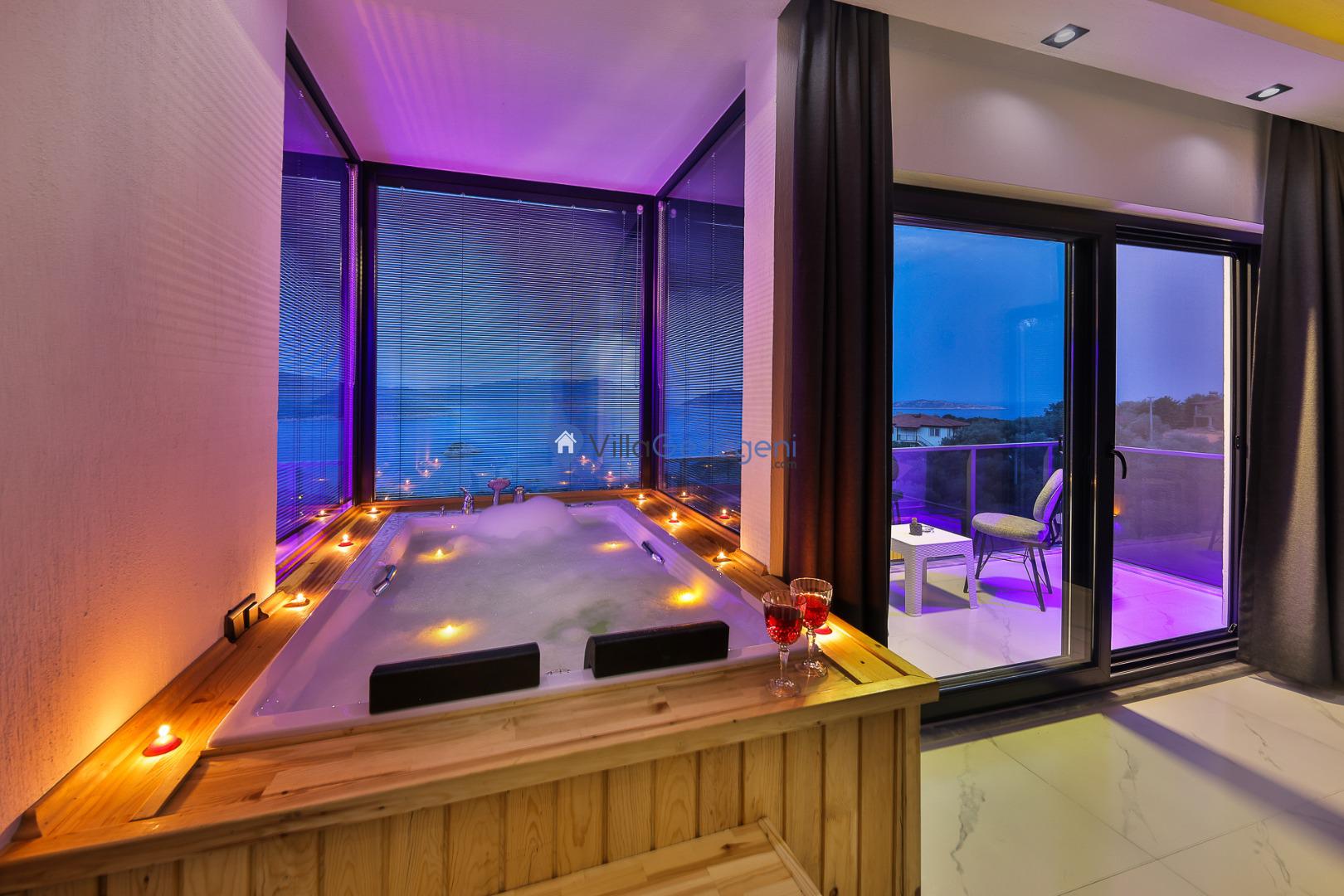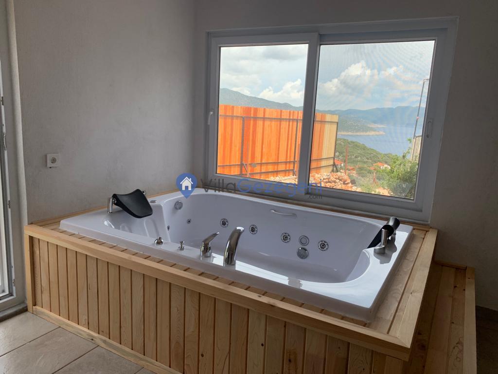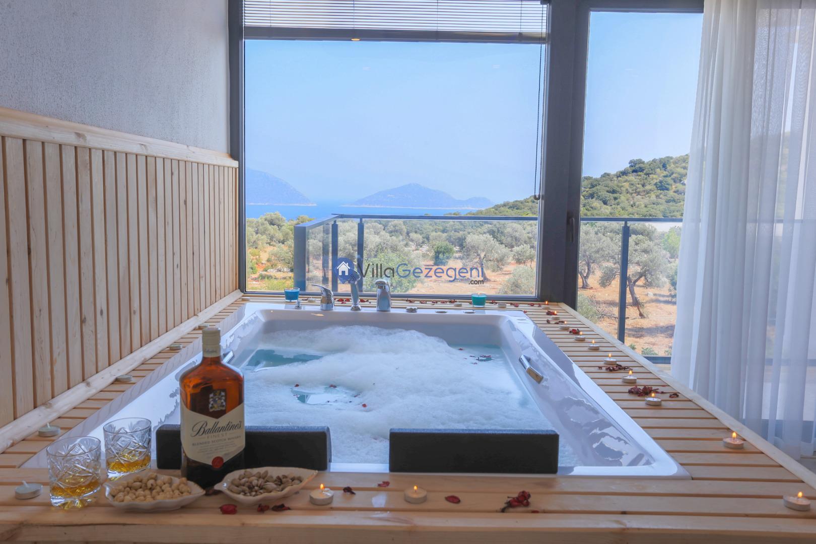 Kaş Bayındır'da bulunan 2 yatak odalı deniz manzaralı ve jakuzili kiralık balayı villası