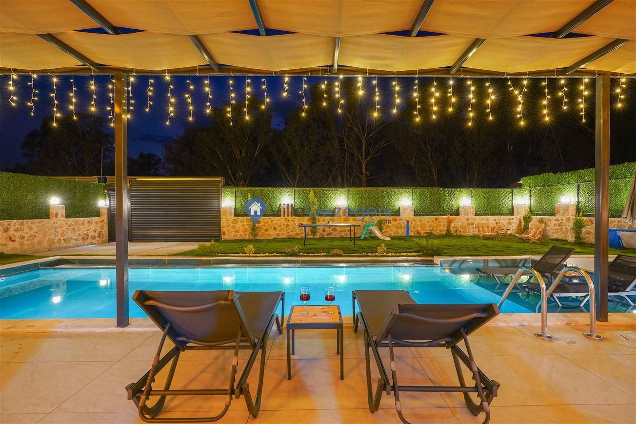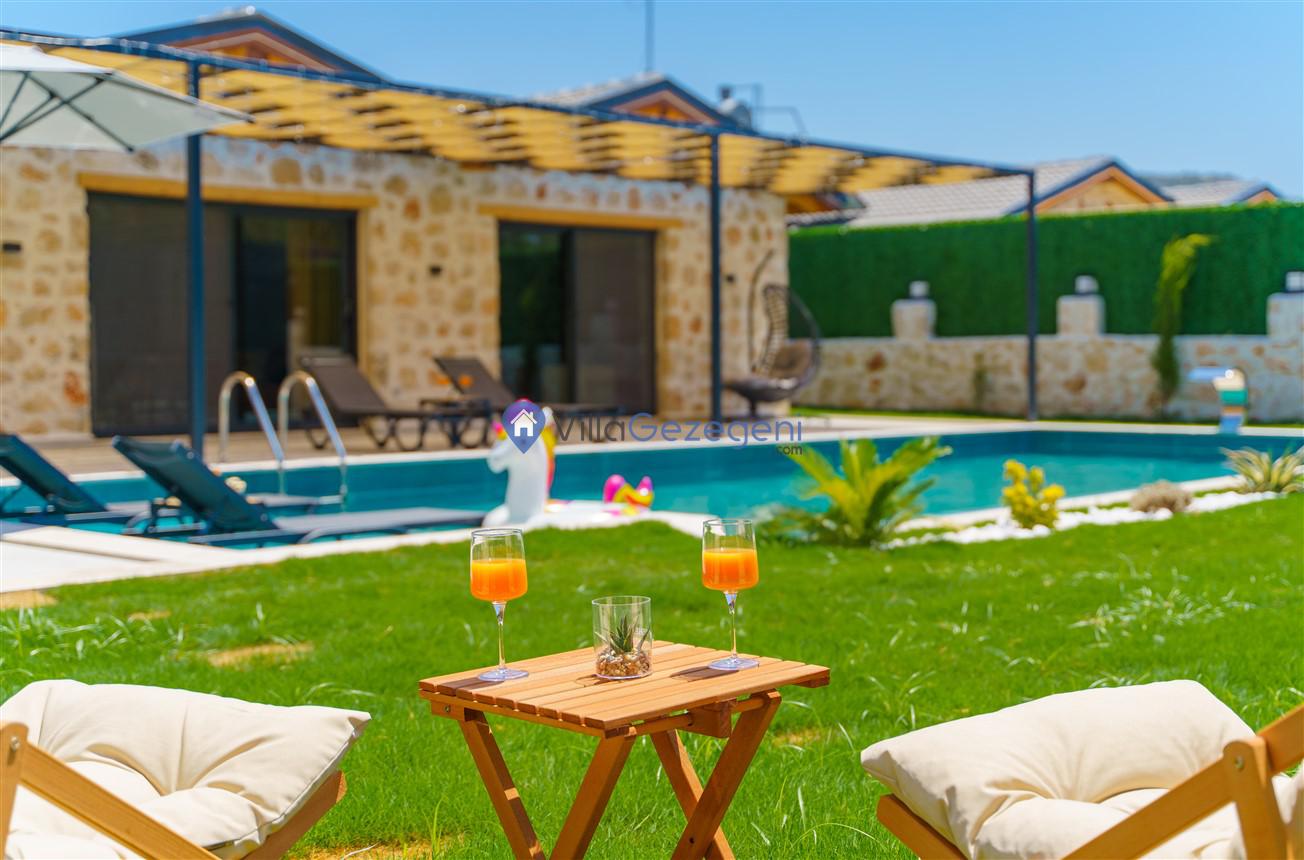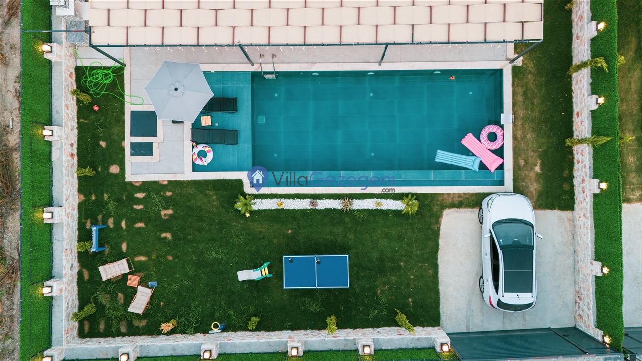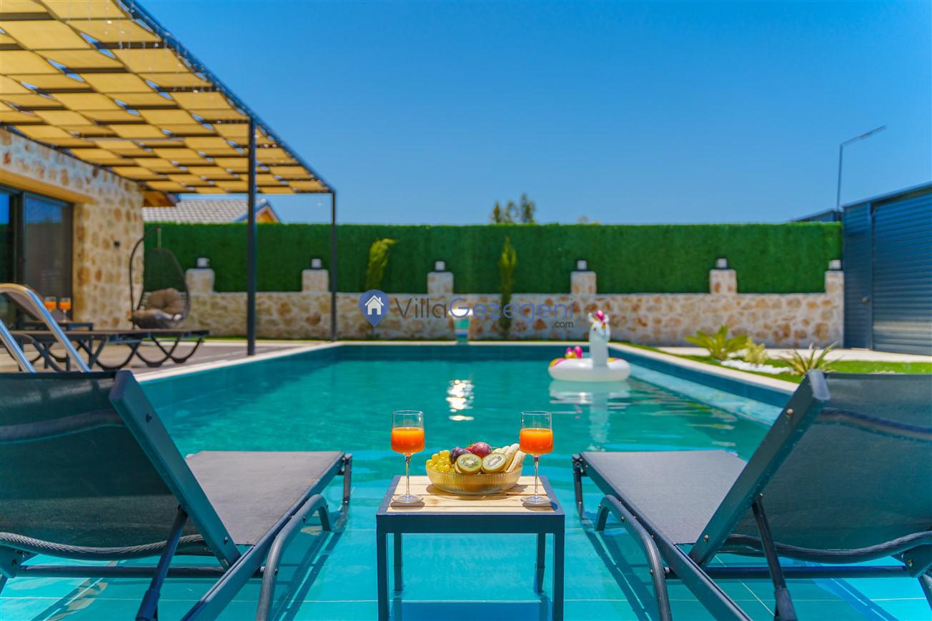 Villamızın genel konsept ve özelliklerinden tekrar bahsedecek olursak; villamızın 2 adet müstakil açık ve kapalı özel havuzu bulunmaktadır. ferah bir bahçeye sahip olan villamız rahatlığı ön planda tutan 3 adet yatak odası, 4 yatak, 3 banyo, hareket alanı geniş bir mutfak ve 6 kişinin geniş aralıklarla rahatlıkla oturabileceği koltuklara sahip salonu bulunmaktadır.