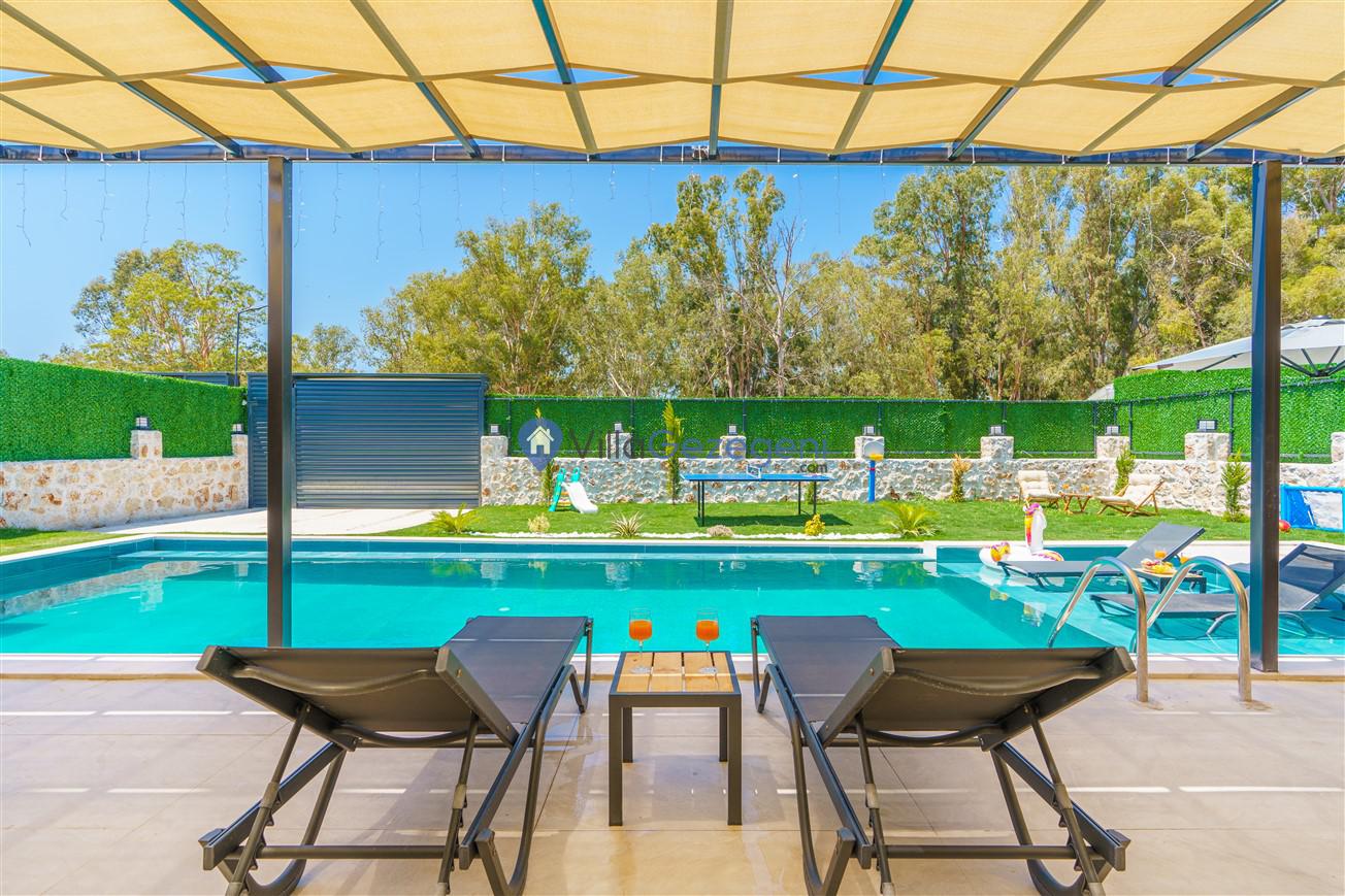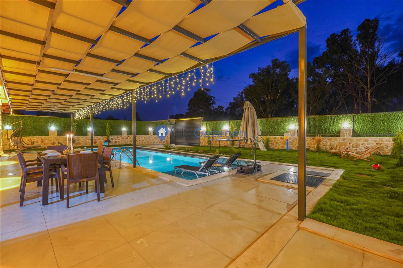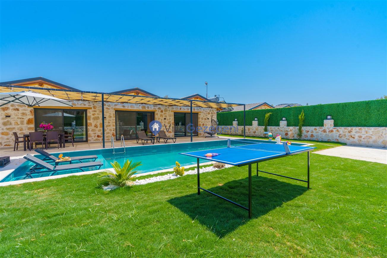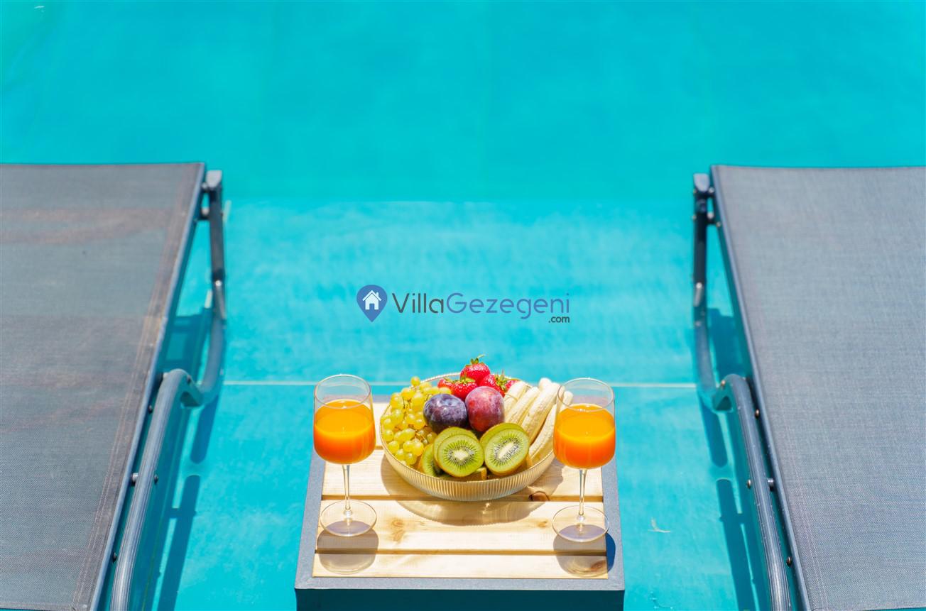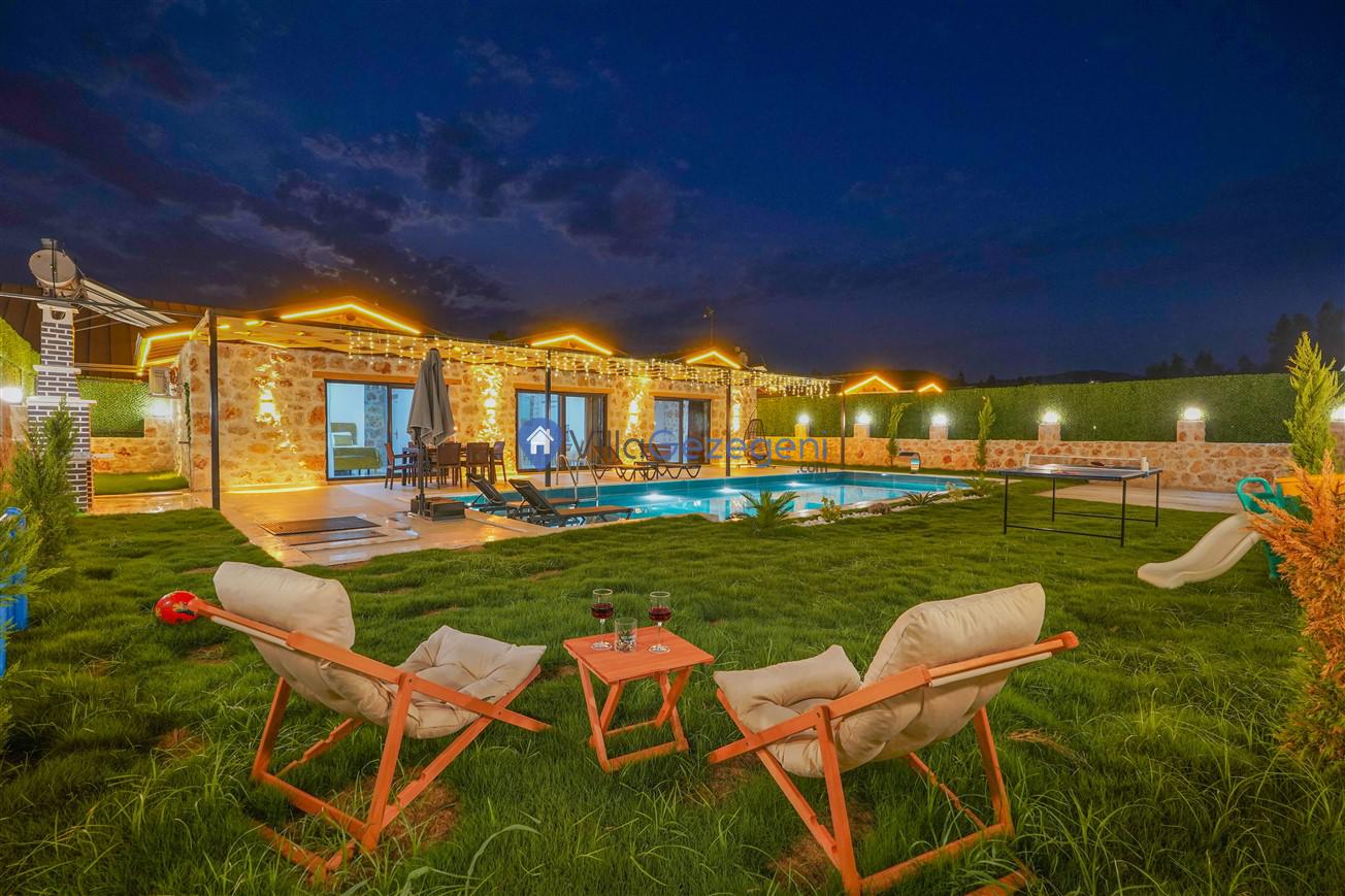 Villamızın genel konsept ve özelliklerinden tekrar bahsedecek olursak; villamızın 2 adet müstakil açık ve kapalı özel havuzu bulunmaktadır. ferah bir bahçeye sahip olan villamız rahatlığı ön planda tutan 3 adet yatak odası, 4 yatak, 3 banyo, hareket alanı geniş bir mutfak ve 6 kişinin geniş aralıklarla rahatlıkla oturabileceği koltuklara sahip salonu bulunmaktadır.