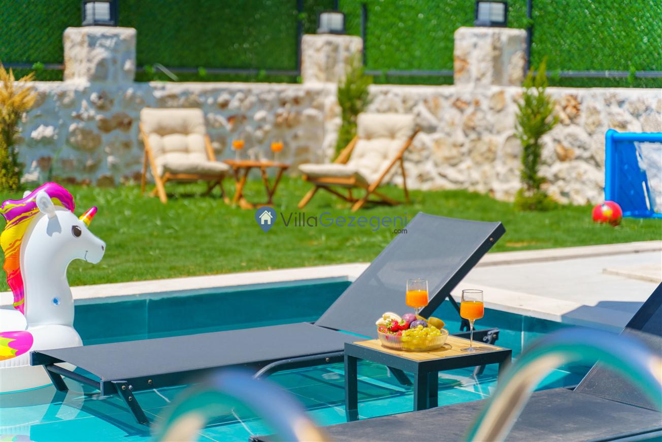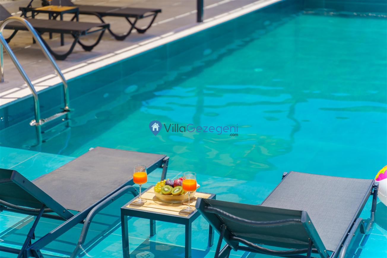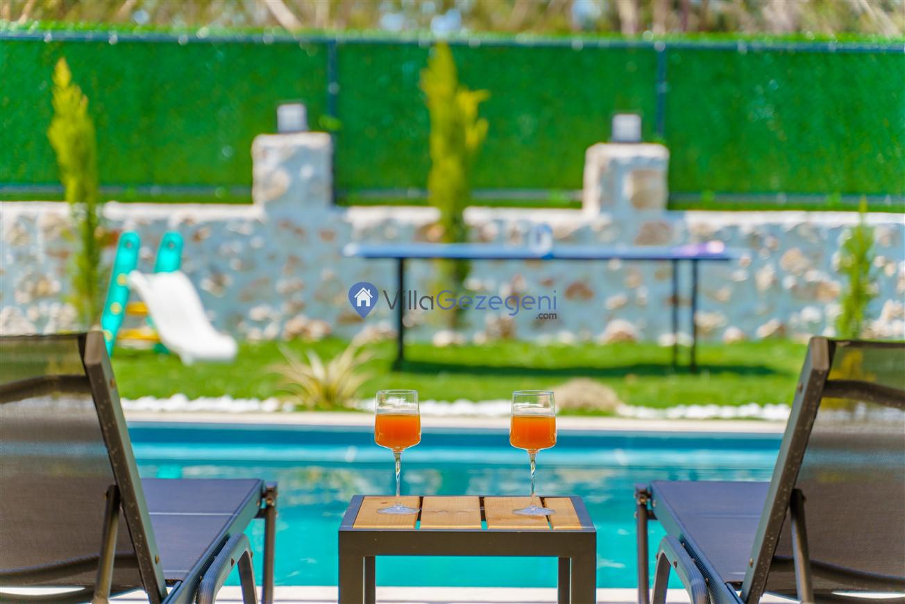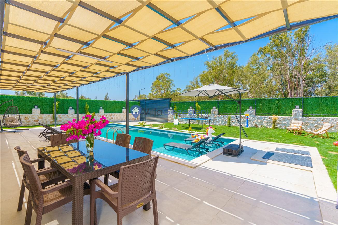 Villamızın genel konsept ve özelliklerinden tekrar bahsedecek olursak; villamızın 2 adet müstakil açık ve kapalı özel havuzu bulunmaktadır. ferah bir bahçeye sahip olan villamız rahatlığı ön planda tutan 3 adet yatak odası, 4 yatak, 3 banyo, hareket alanı geniş bir mutfak ve 6 kişinin geniş aralıklarla rahatlıkla oturabileceği koltuklara sahip salonu bulunmaktadır.