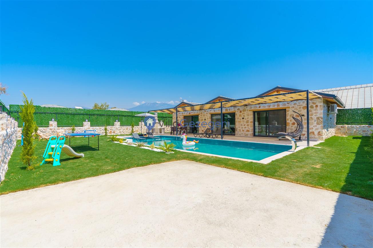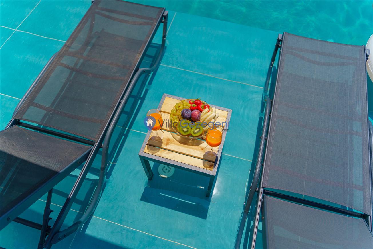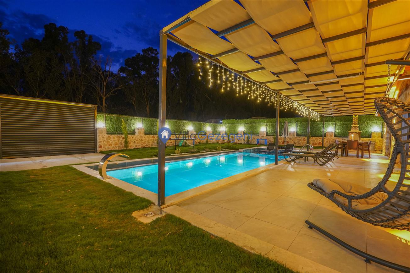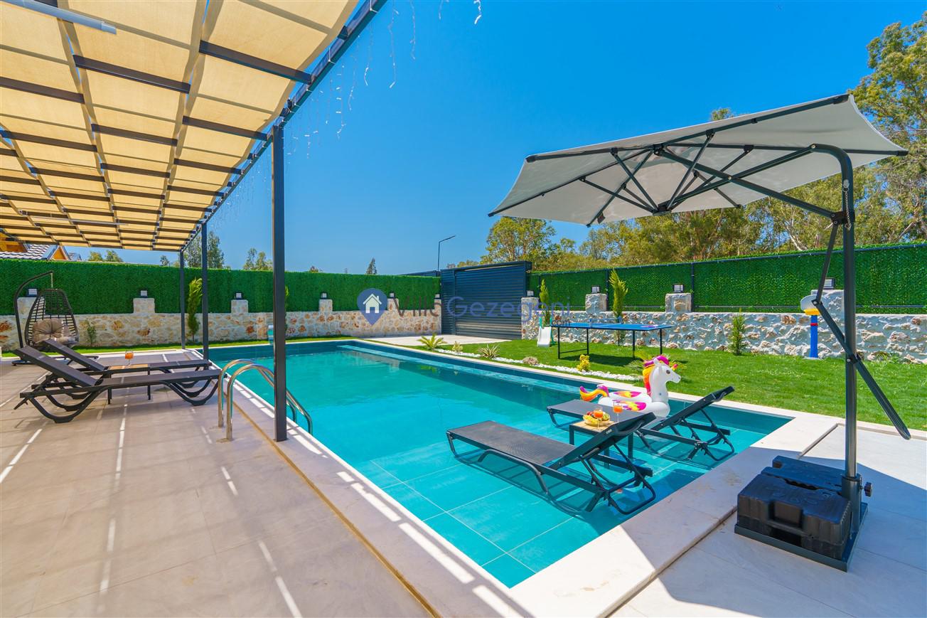 Villamızın genel konsept ve özelliklerinden tekrar bahsedecek olursak; villamızın 2 adet müstakil açık ve kapalı özel havuzu bulunmaktadır. ferah bir bahçeye sahip olan villamız rahatlığı ön planda tutan 3 adet yatak odası, 4 yatak, 3 banyo, hareket alanı geniş bir mutfak ve 6 kişinin geniş aralıklarla rahatlıkla oturabileceği koltuklara sahip salonu bulunmaktadır.