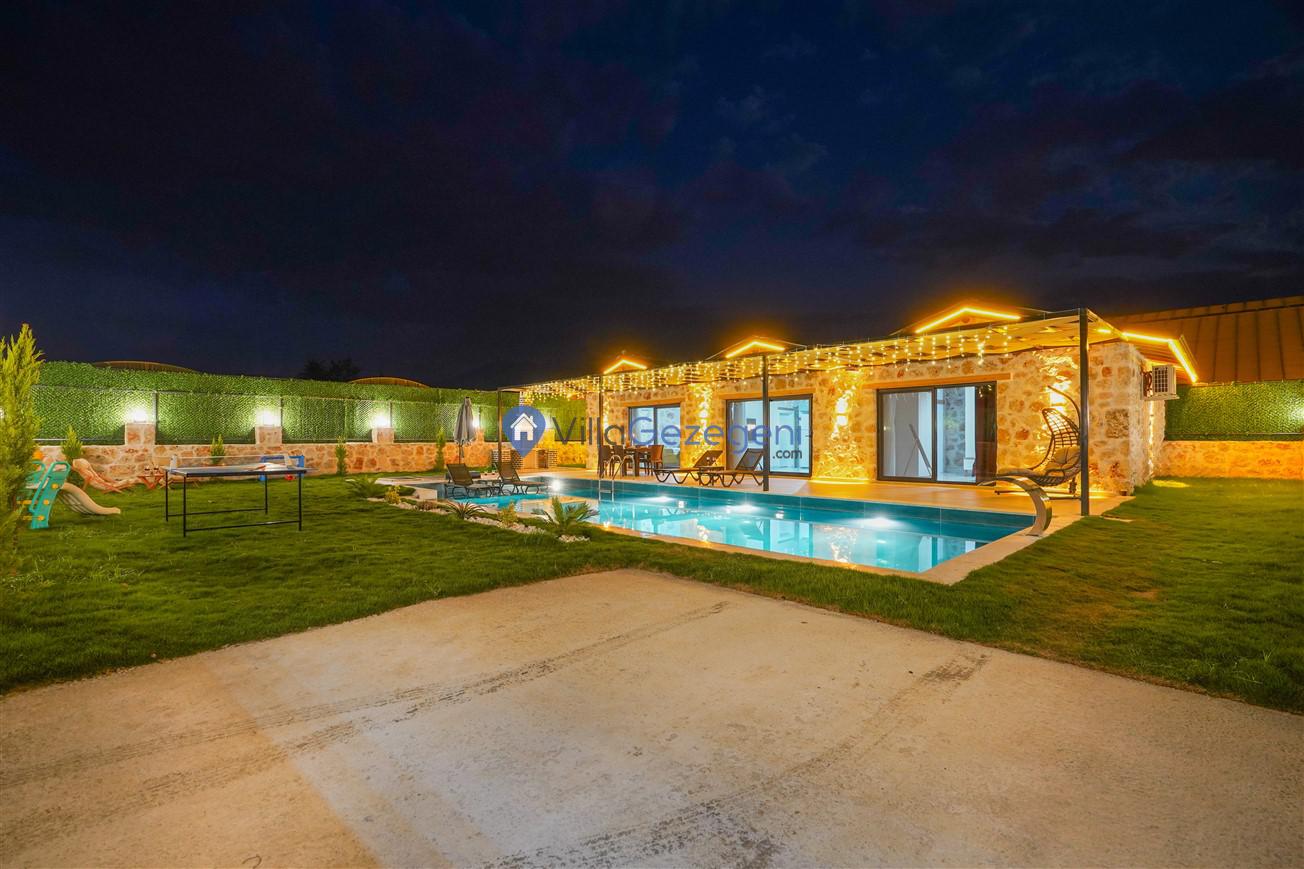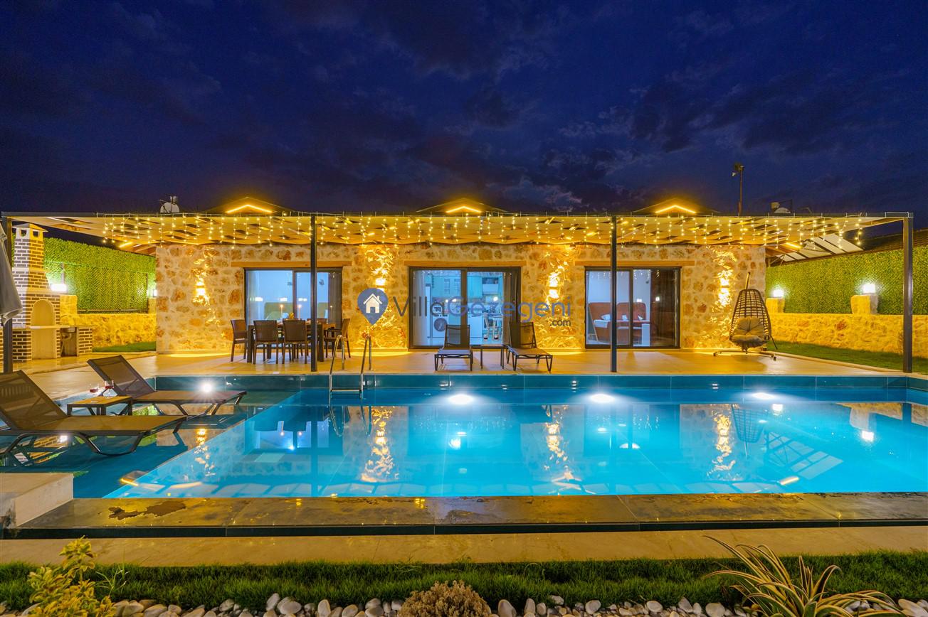 Kaş/Kalkan/Patara bölgesinde yer alan 2 yatak odalı 4 kişi kapasiteli doğa içerisinde havuz korunaklı jakuzili kiralık tatil villası.