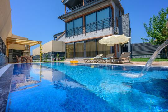 Villamızın genel konsept ve özelliklerinden tekrar bahsedecek olursak; villamızın 1 adet müstakil özel havuzu bulunmaktadır. Ortalama bir bahçeye sahip olan villamız rahatlığı ön planda tutan 4 adet yatak odası, 5 yatak, 4 banyo, hareket alanı geniş bir mutfak ve 8 kişinin geniş aralıklarla rahatlıkla oturabileceği koltuklara sahip salonu bulunmaktadır.