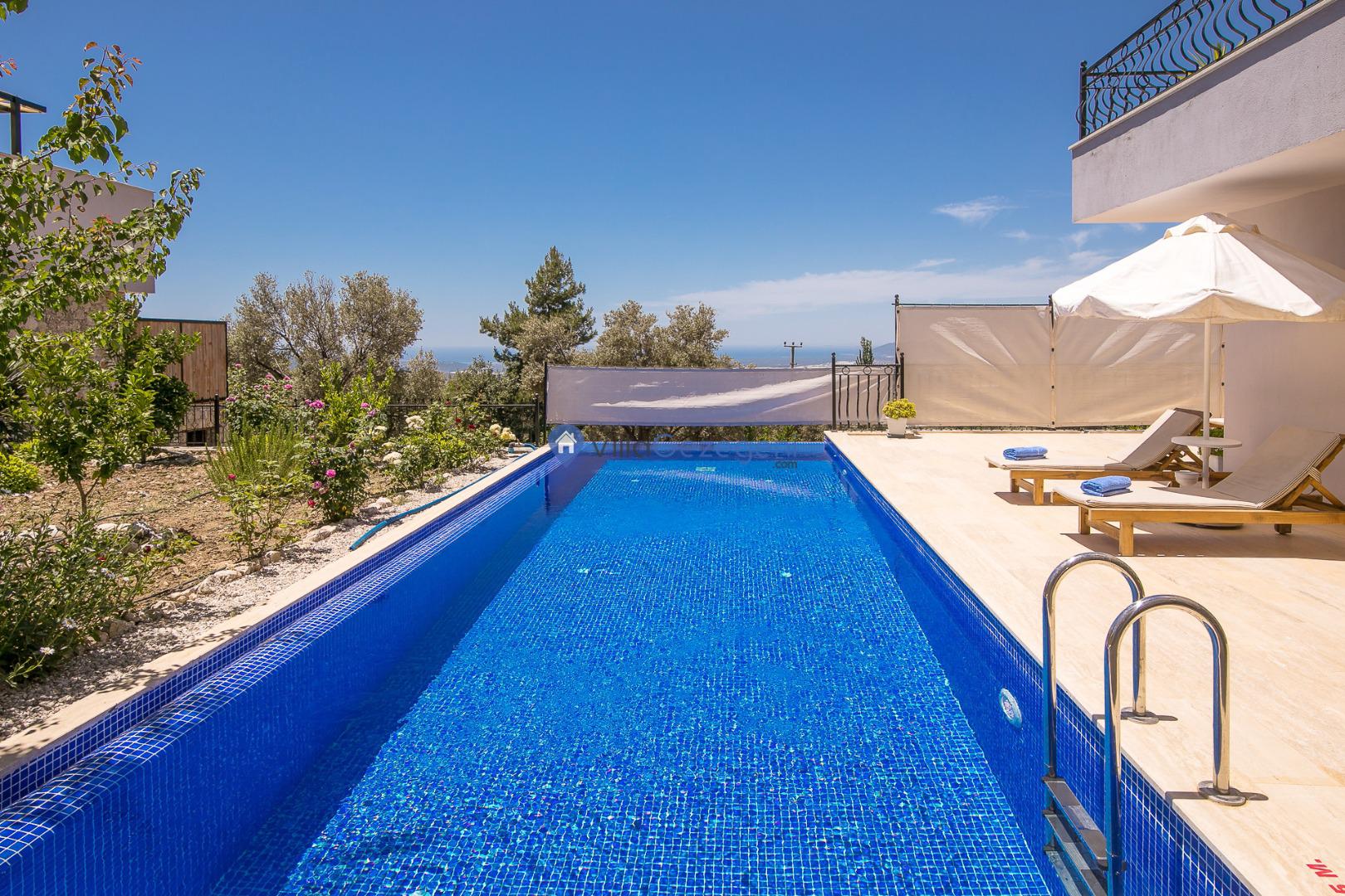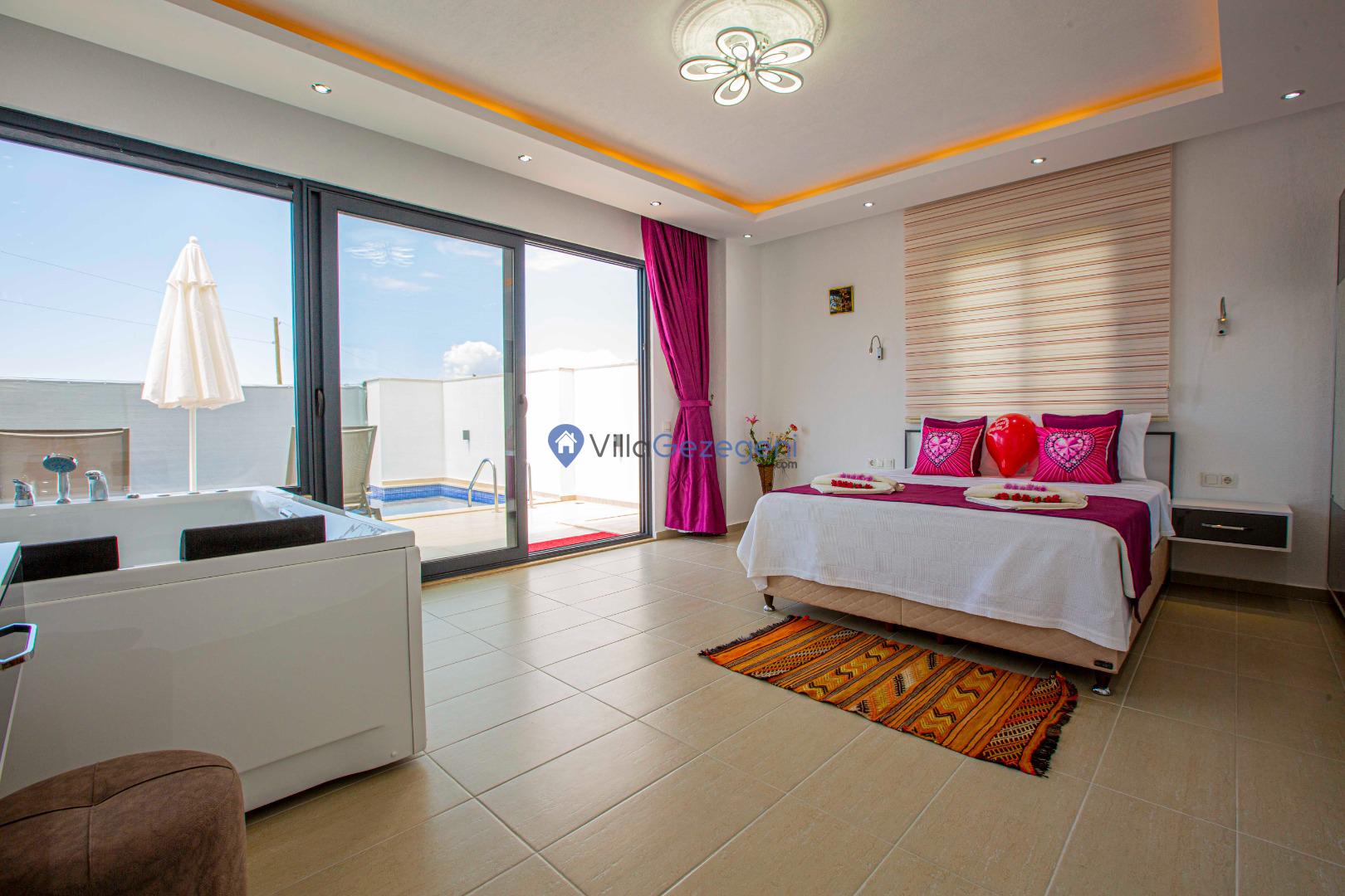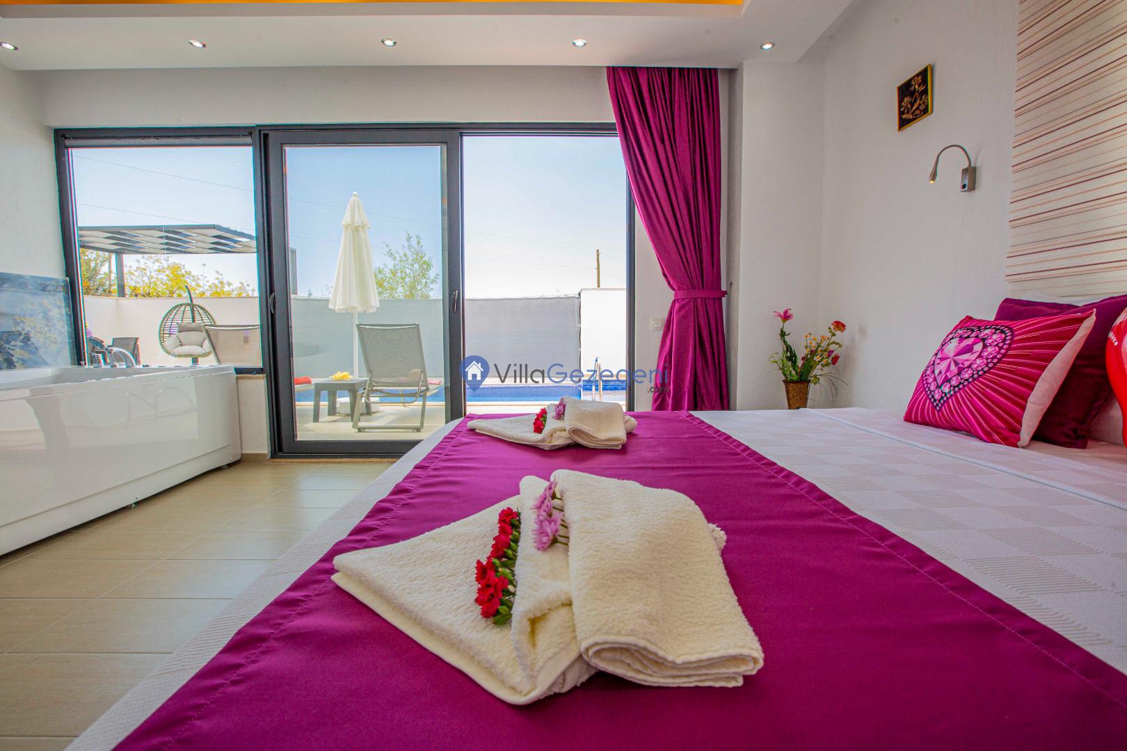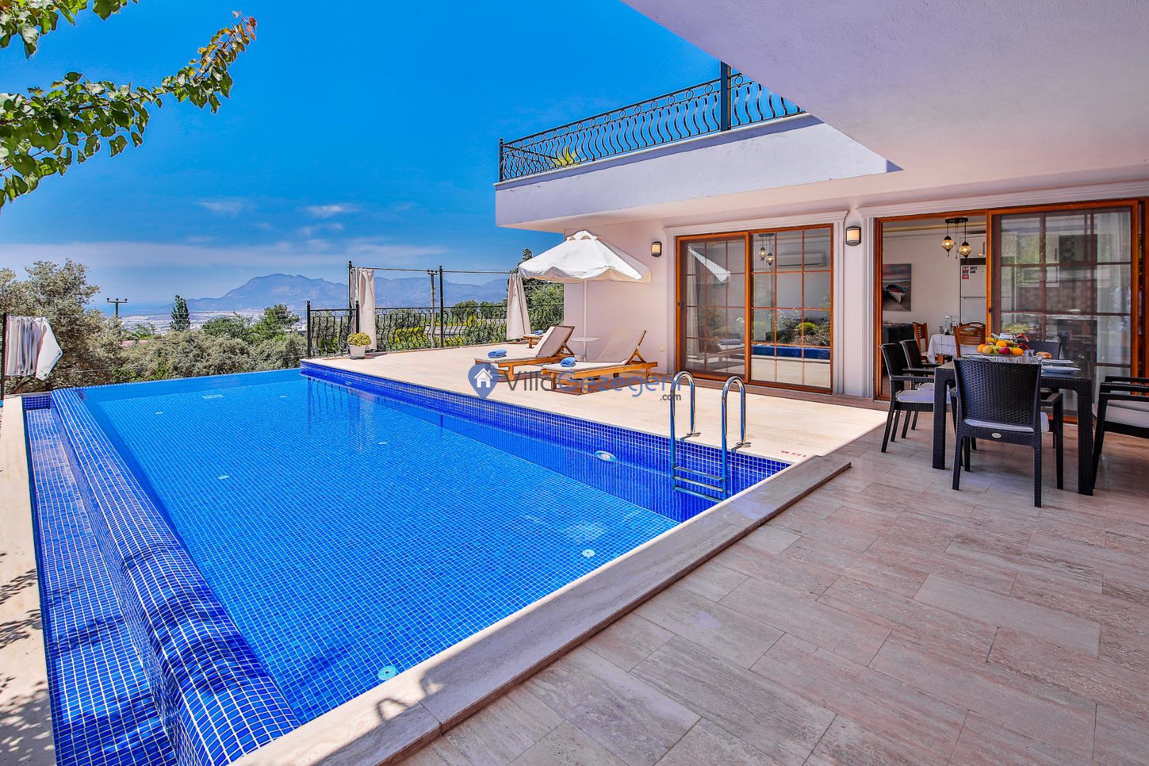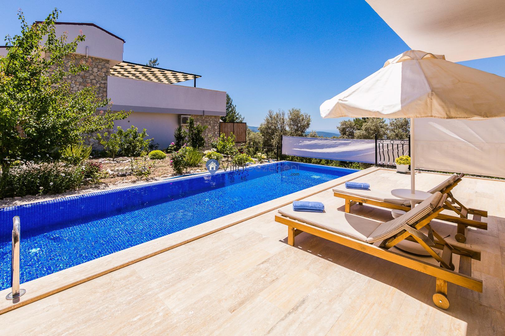 Villa Nil Exclusive; 2 yatak odalı, lüks, deniz manzaralı, havuzu korunaklı, jakuzili, doğa içerisinde muhafazakar kiralık aile ve balayı villası.