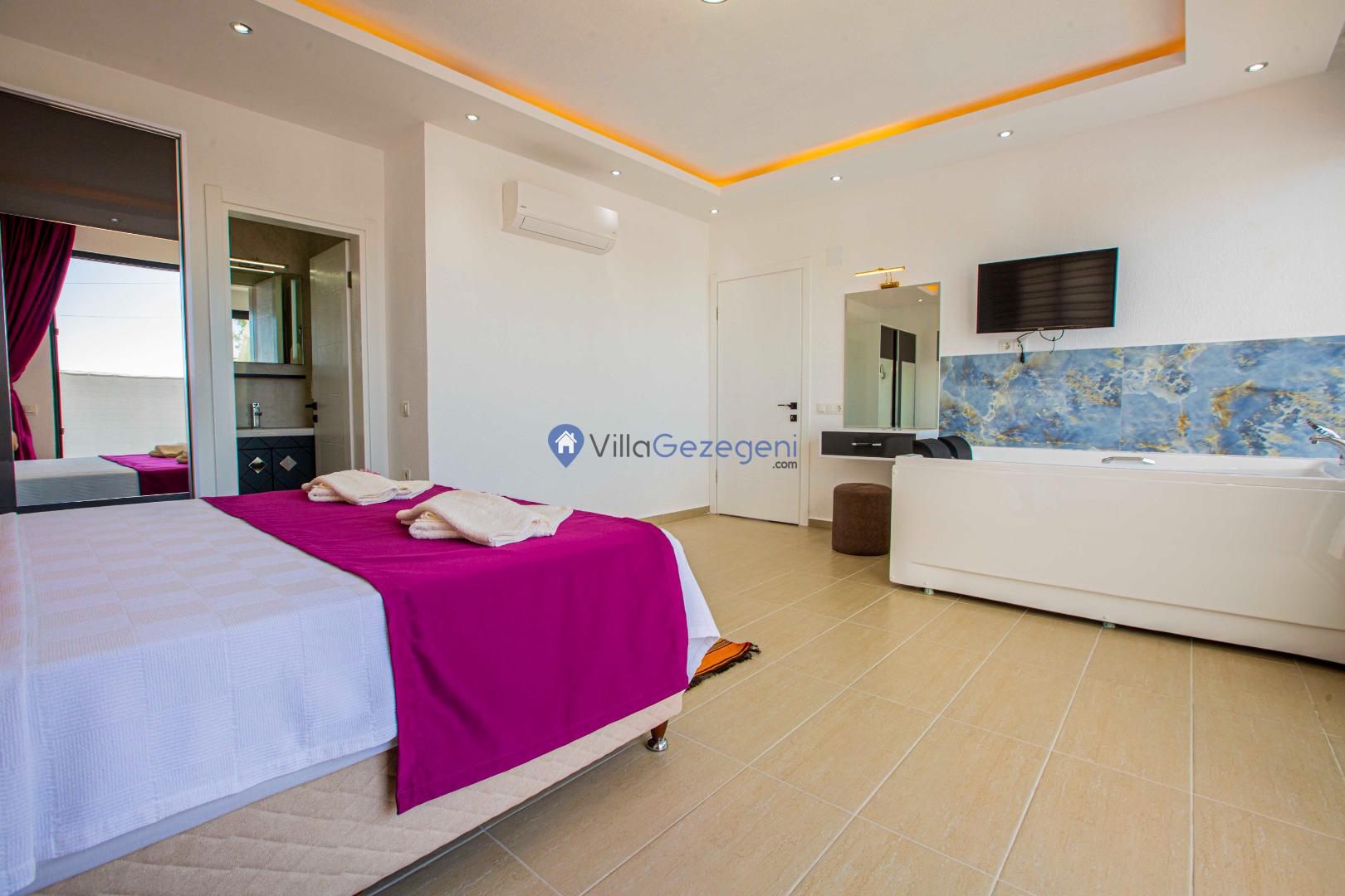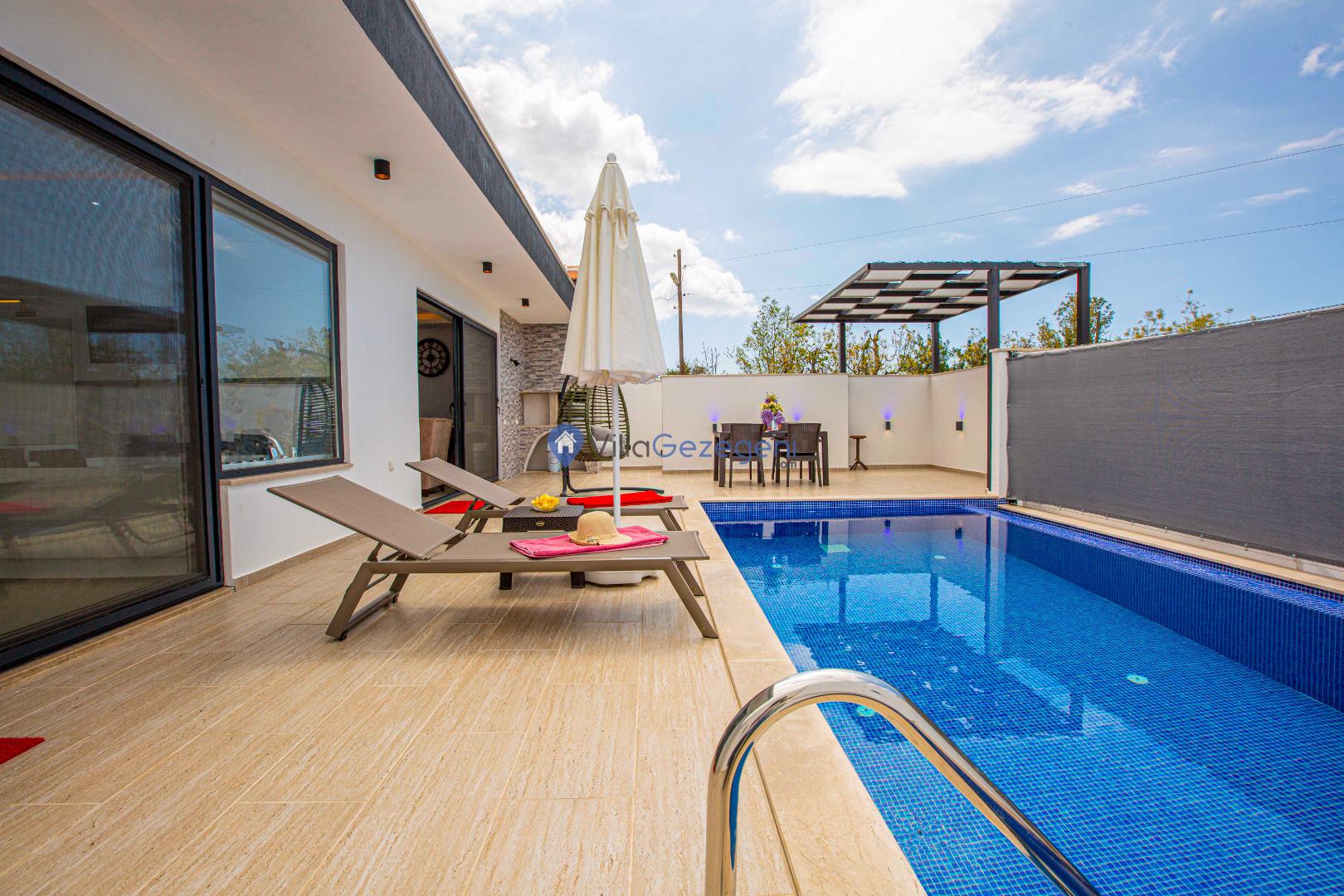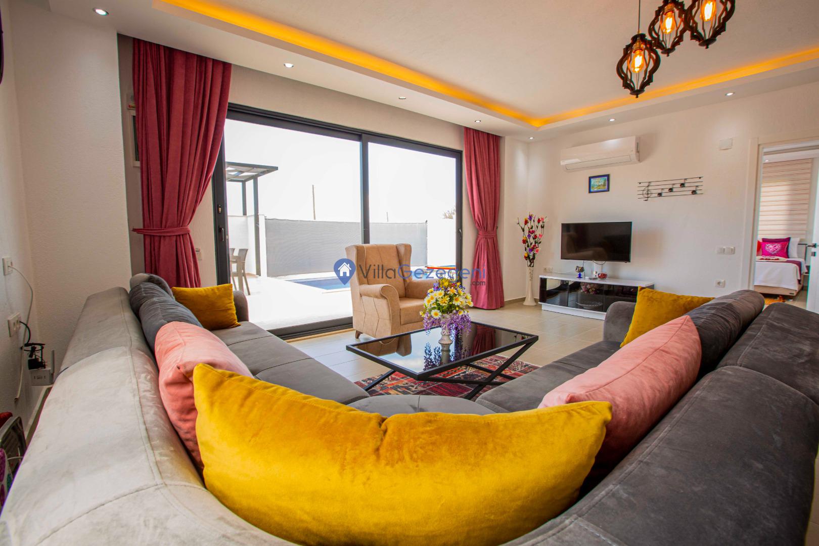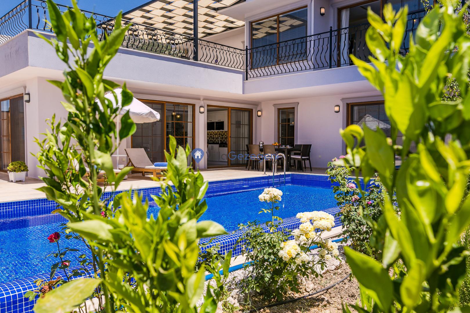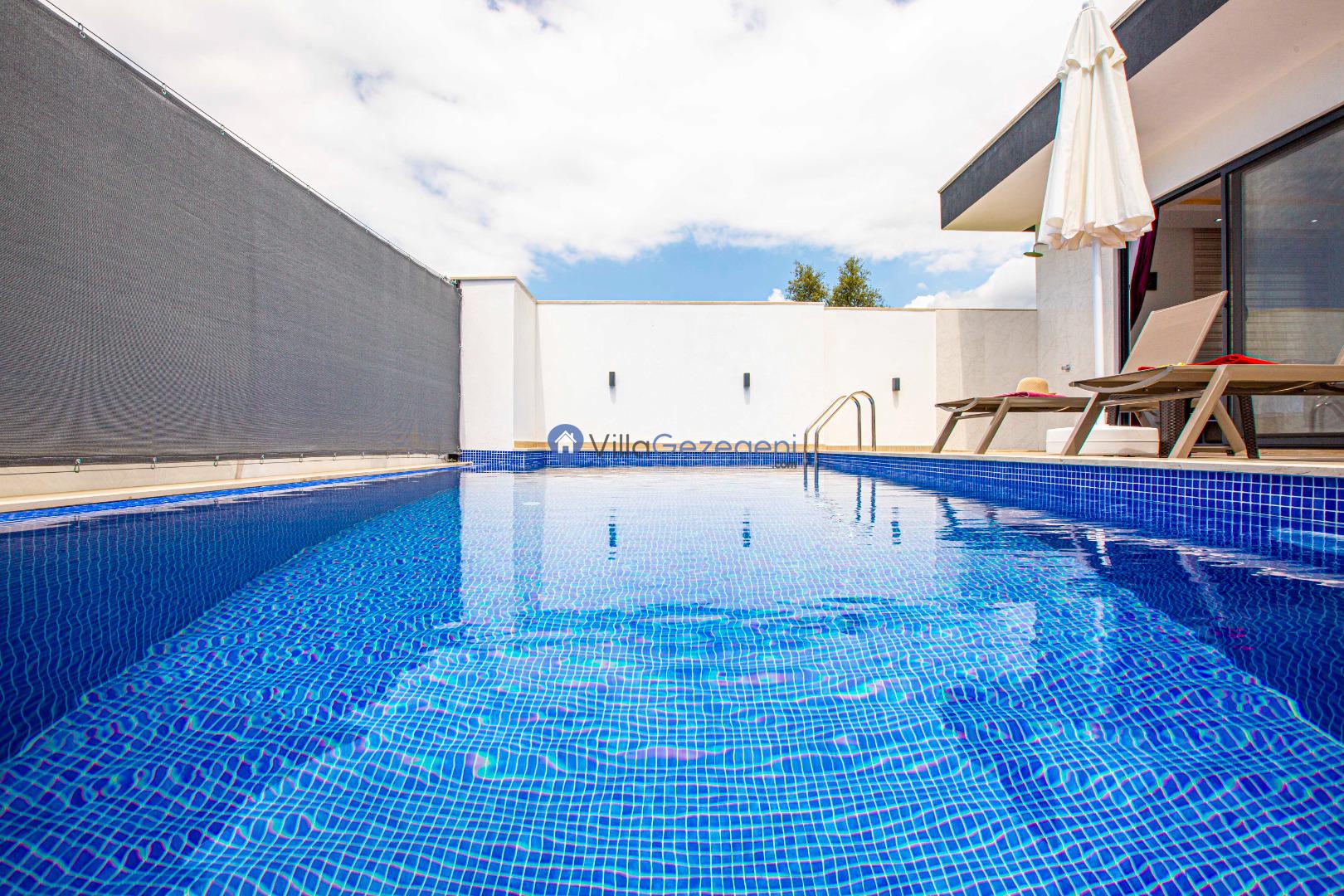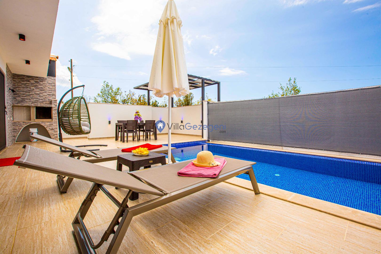 Villa Nil Exclusive; 2 yatak odalı, lüks, deniz manzaralı, havuzu korunaklı, jakuzili, doğa içerisinde muhafazakar kiralık aile ve balayı villası.