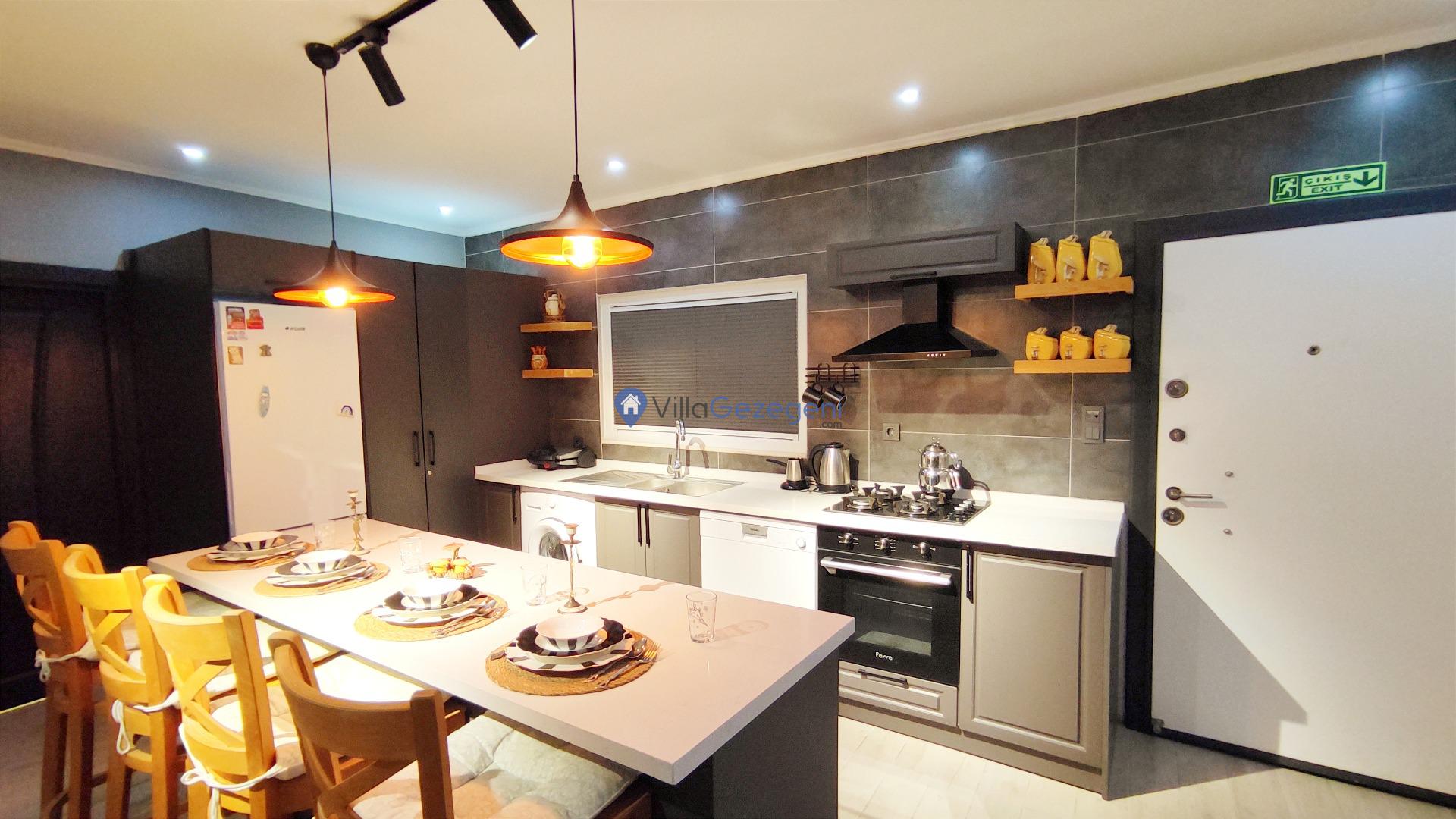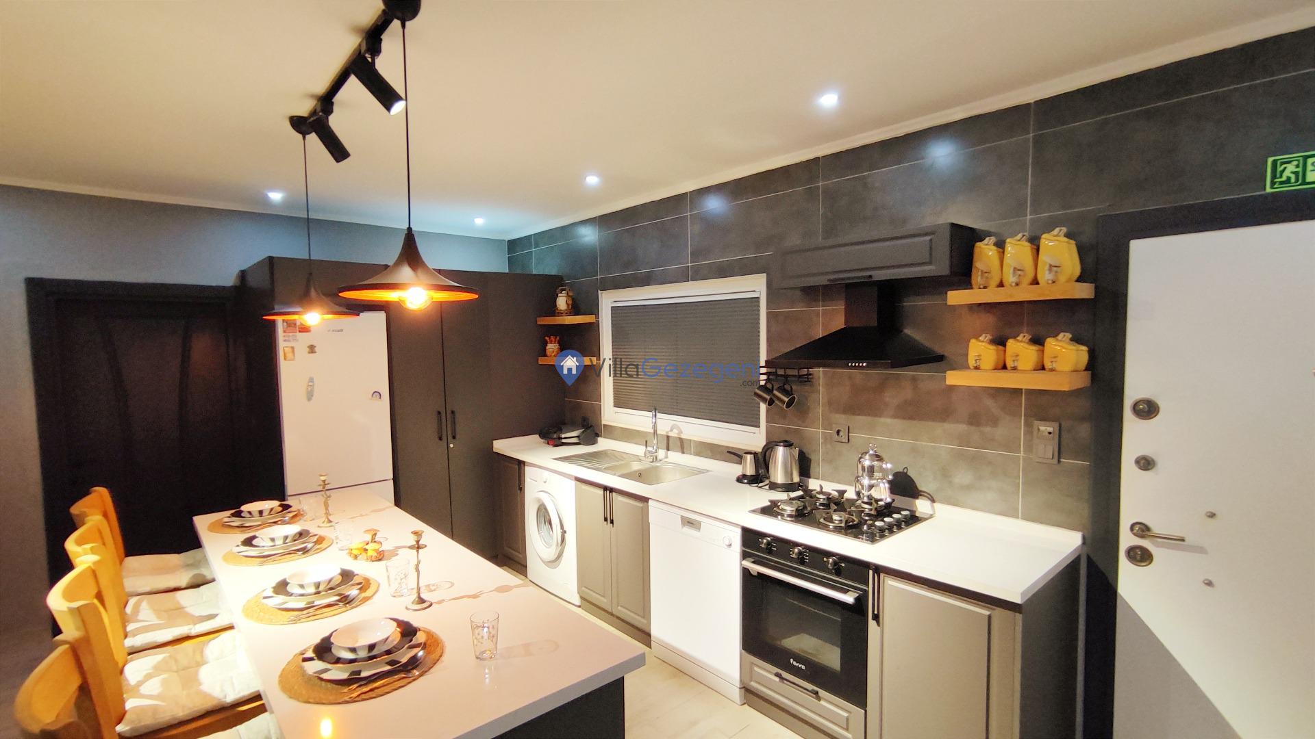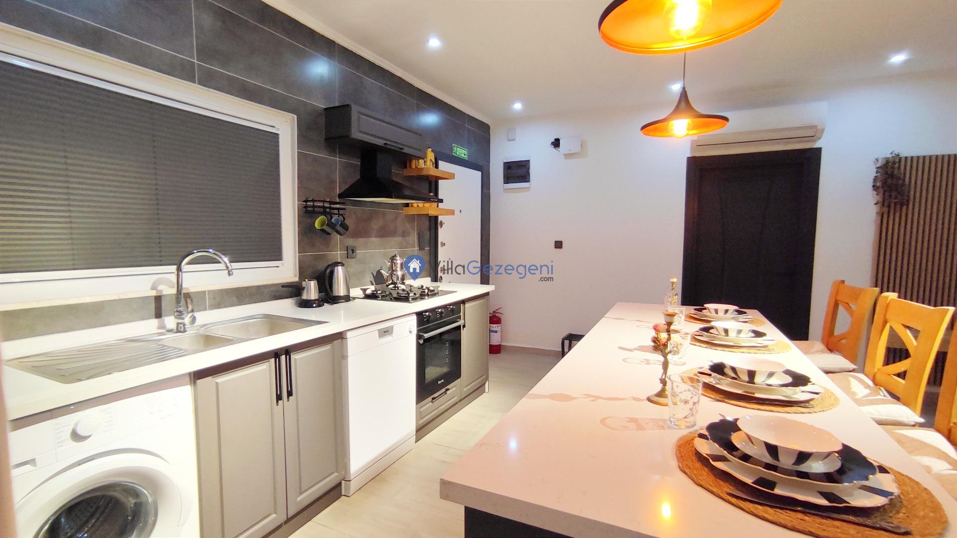 Villamız günlük hayatta sık kullanılan; Mikrodalga fırın, ankastre fırın, buzdolabı, çamaşır makinası, bulaşık makinesi, elektrikli su ısıtıcı kettle, ankastre 4’lü ocak, 10 kişilik yemek takımı, kaşık ve çatal takımı, tencere ve tava takımı, bardaklar yer almaktadır. İhtiyacınız durumunda villamızda bulunmayan malzemeler hakkında bizle iletişime geçebilir ve yardım isteyebilirsiniz.