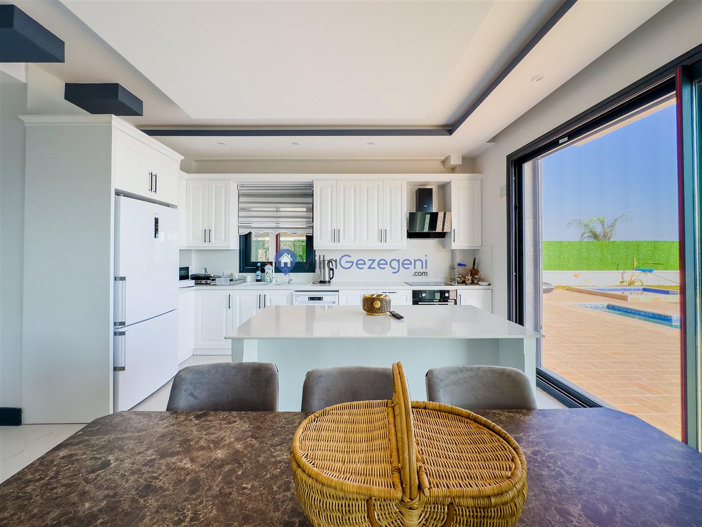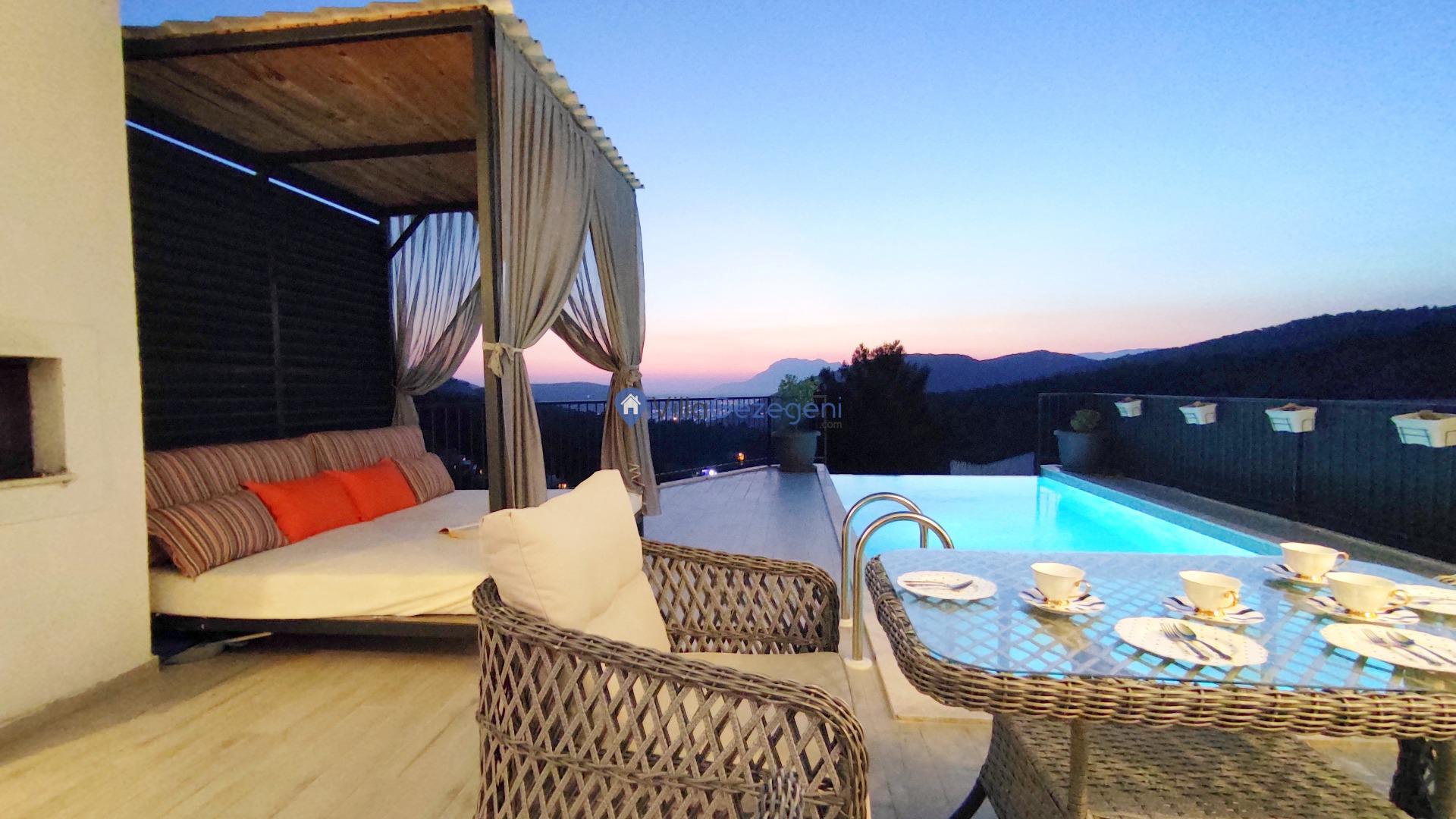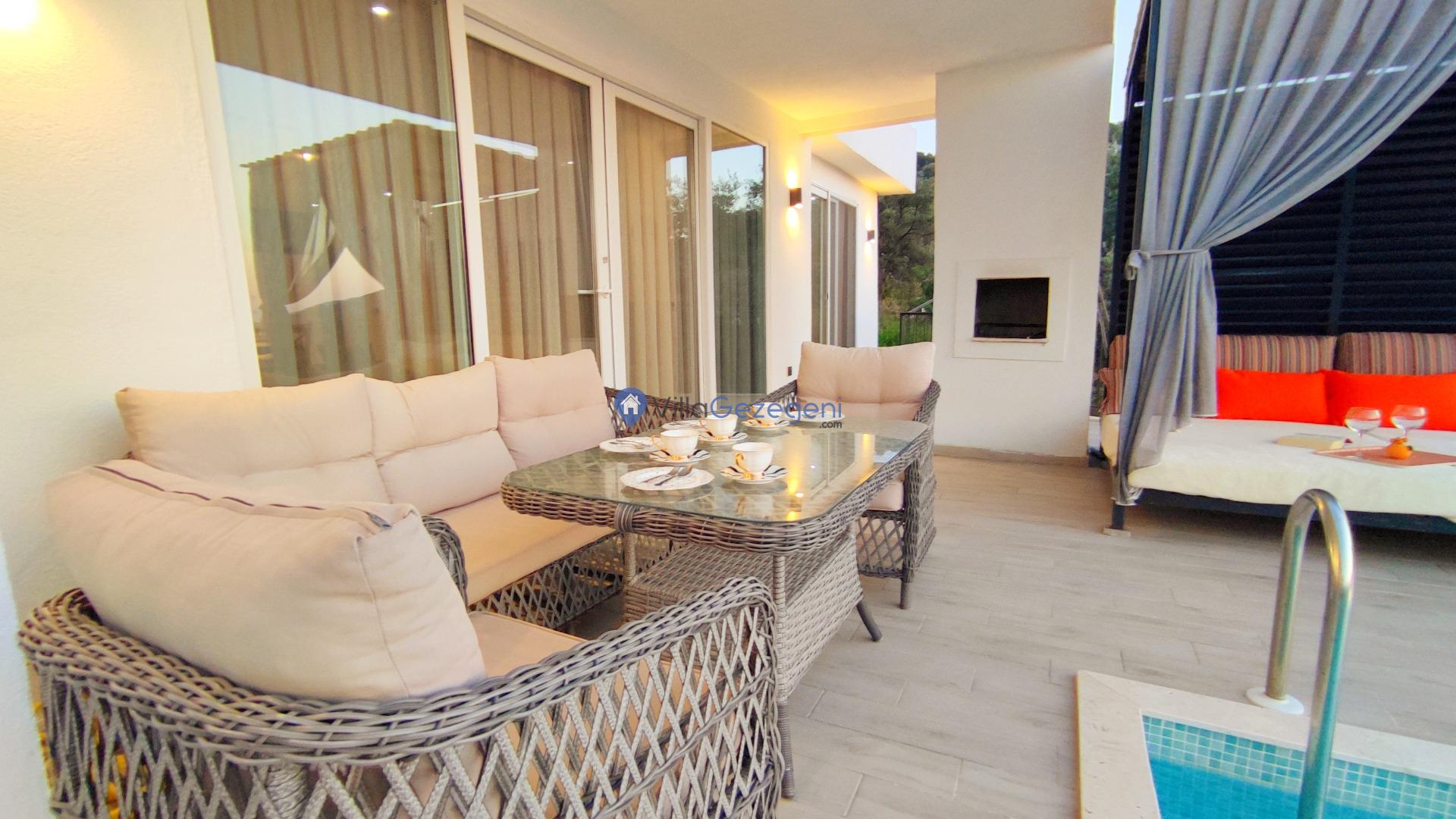Yemek Masası ve bahçe mobilyaları kullanımınız için hazır bulunmaktadır. Gün batımına karşı unutulmaz bir tatilin kapılarını misafirlerine aralayan villamız modern örnekler arasında son dönemlerde geniş arkadaş grupları veya aileler tarafından her yaz dönemi yoğun olarak rağbet görmeye devam etmektedir.