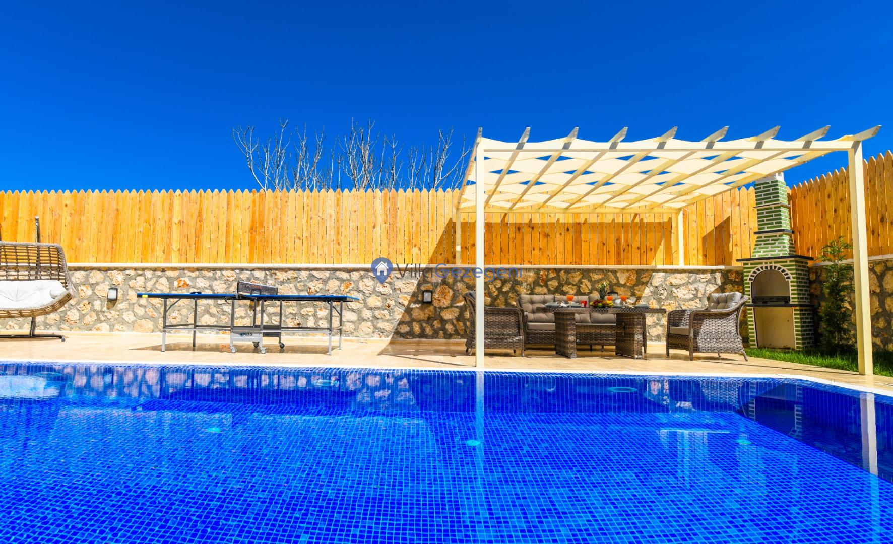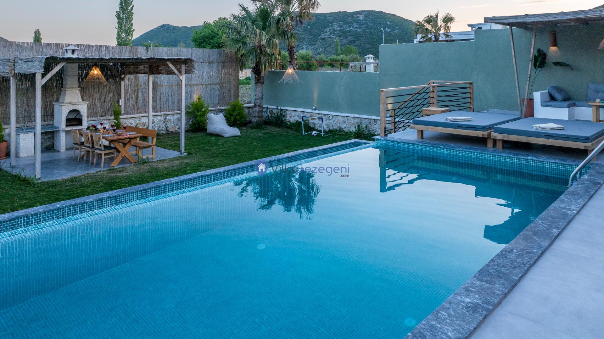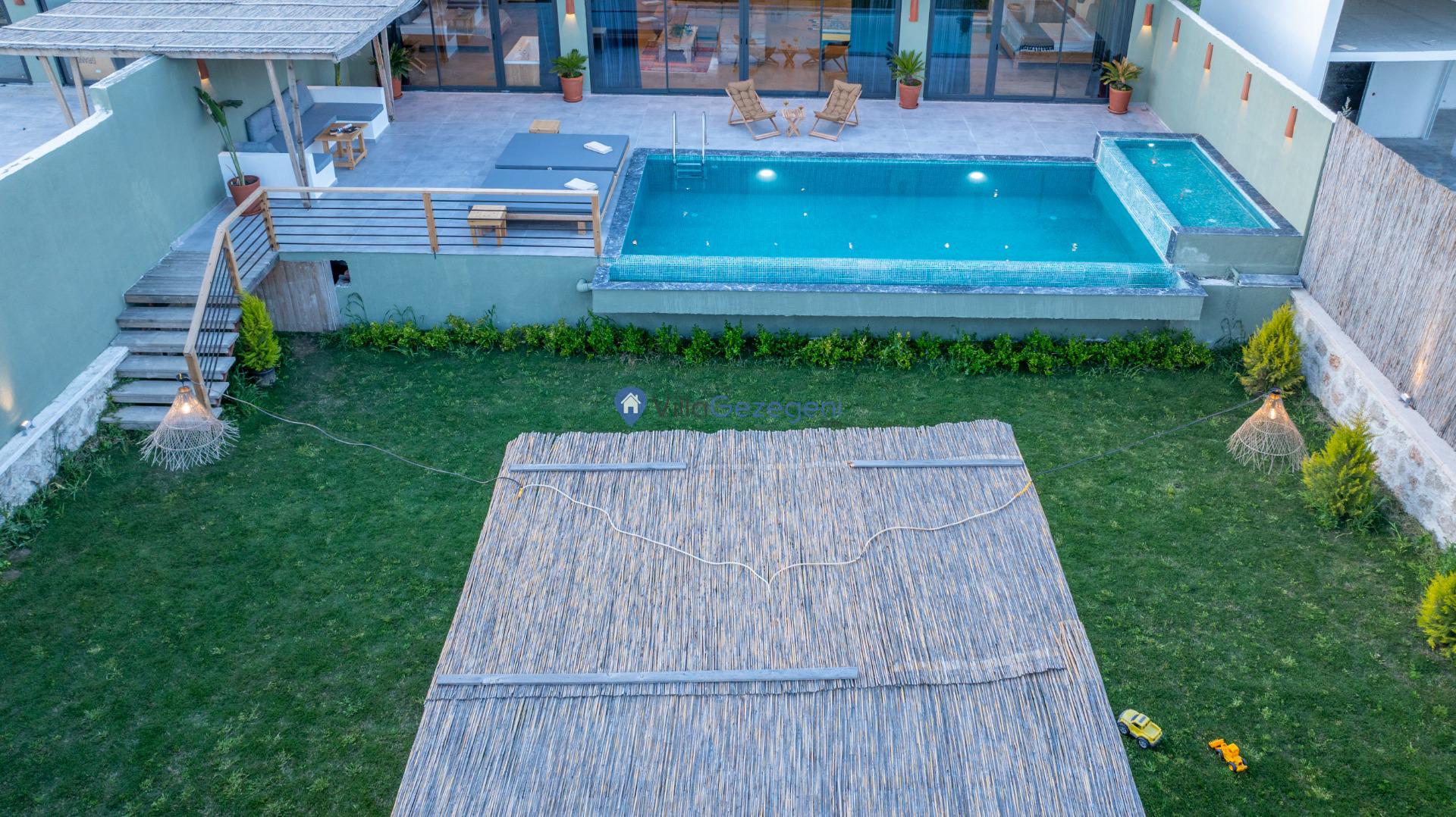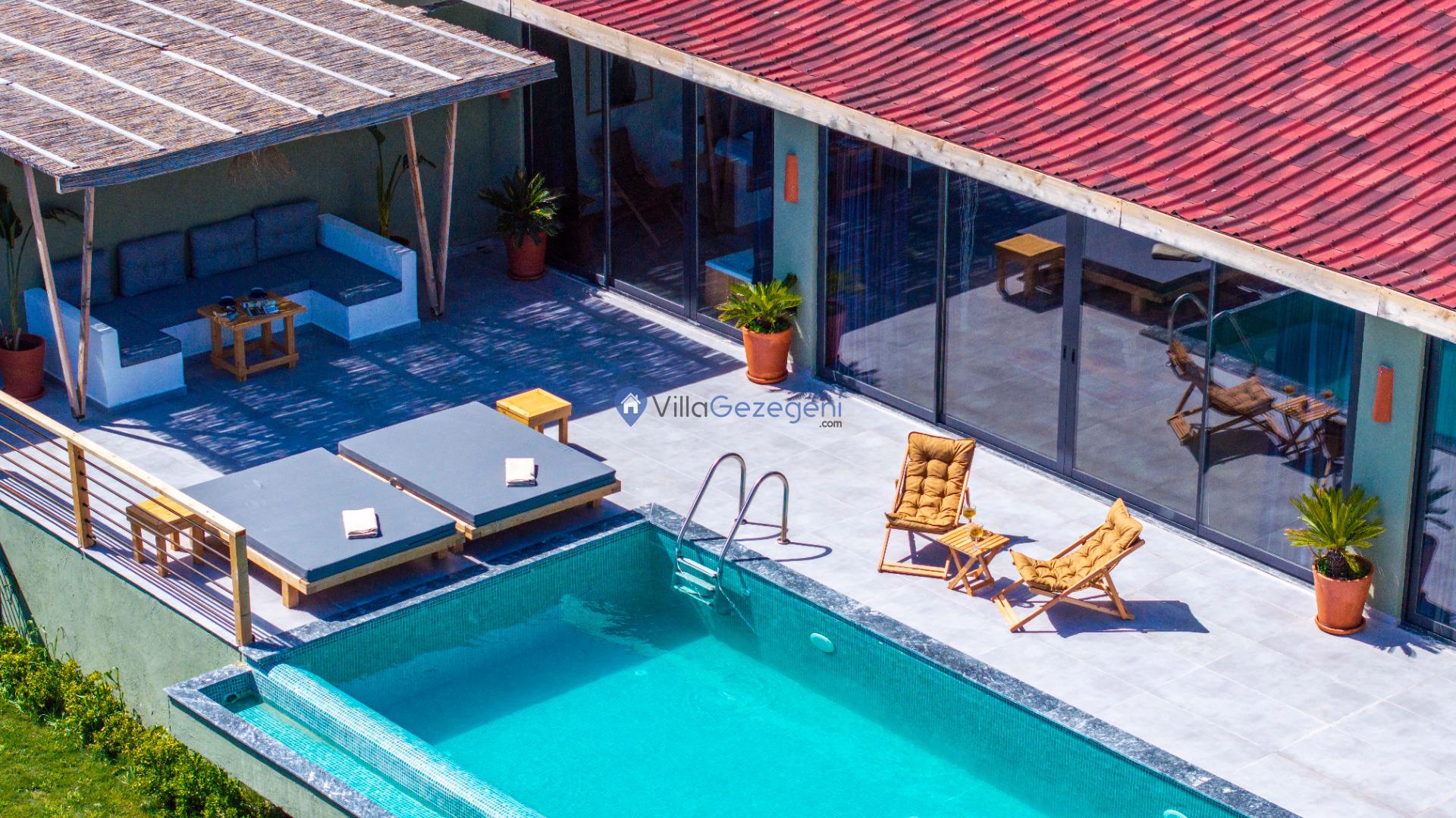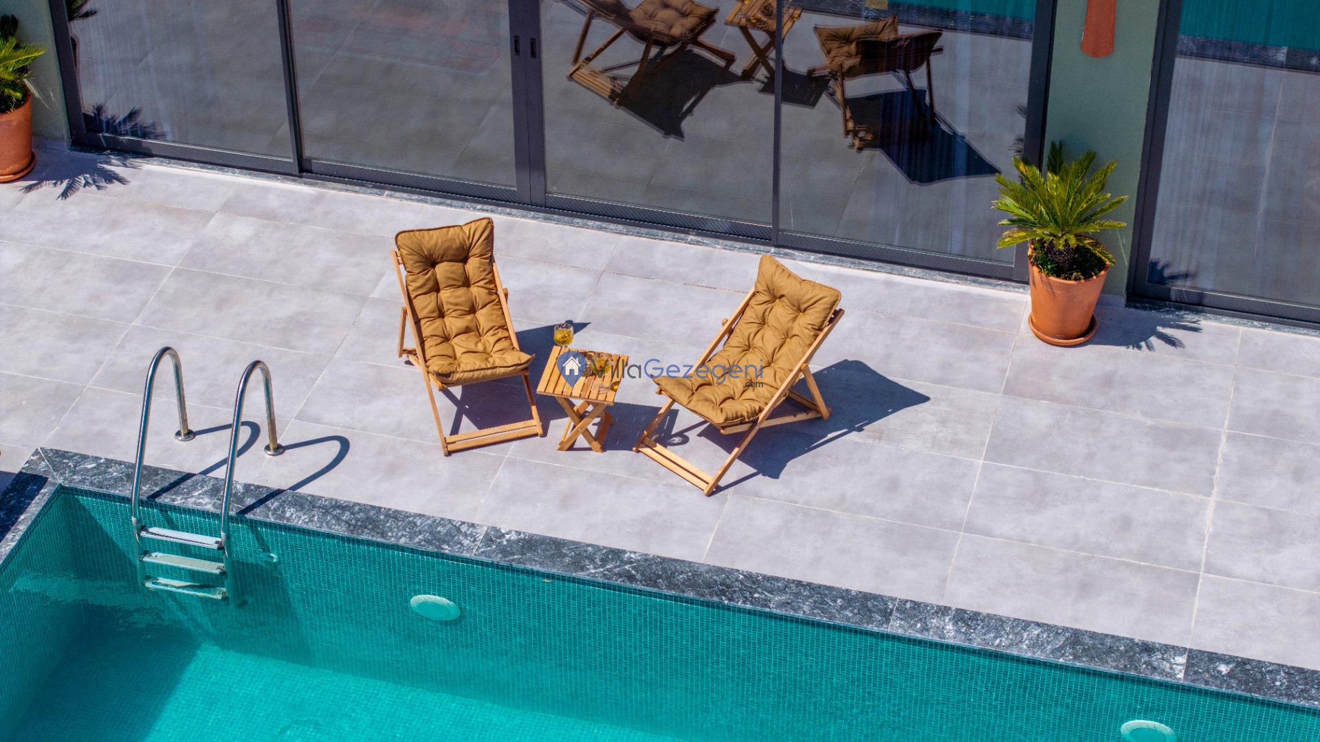 Villanın tam korunaklı havuzu, dışarıdan görünmeyecek şekilde tasarlanmıştır. Bu özellik, hem muhafazakar misafirler hem de mahremiyetine önem verenler için idealdir. Havuzun yanında bulunan geniş teras, gün boyu güneşlenmek ve dinlenmek için mükemmel bir alan sunar.