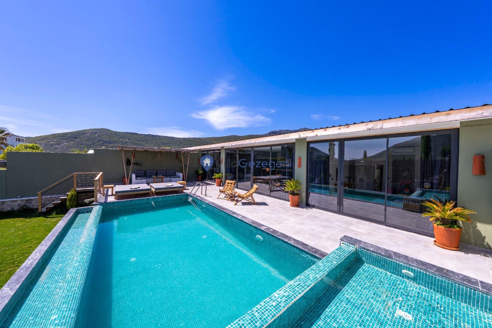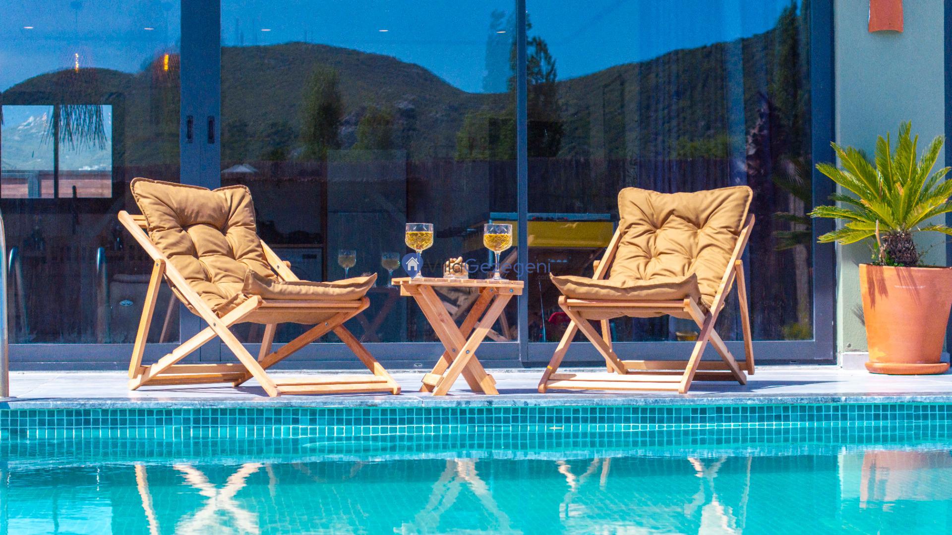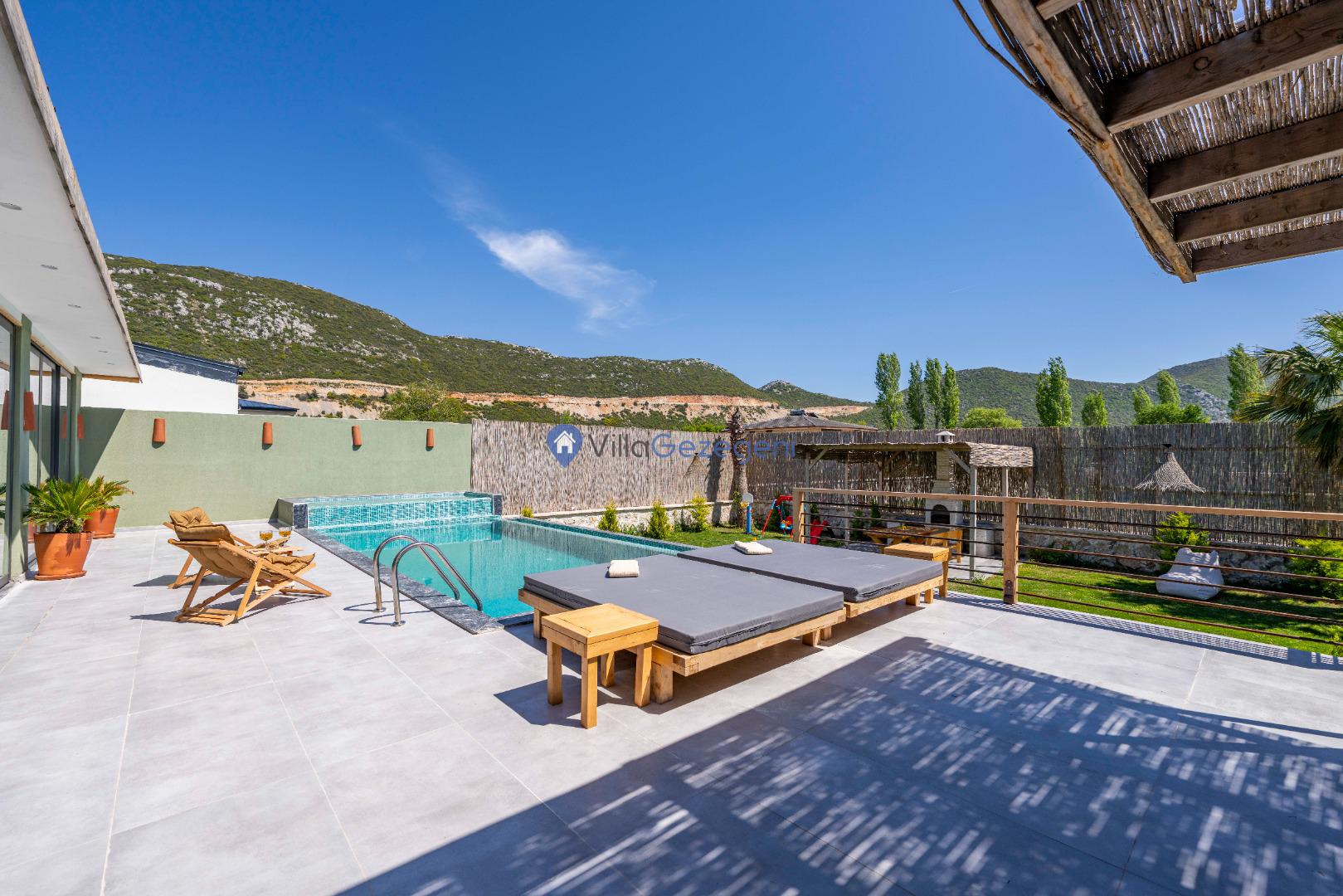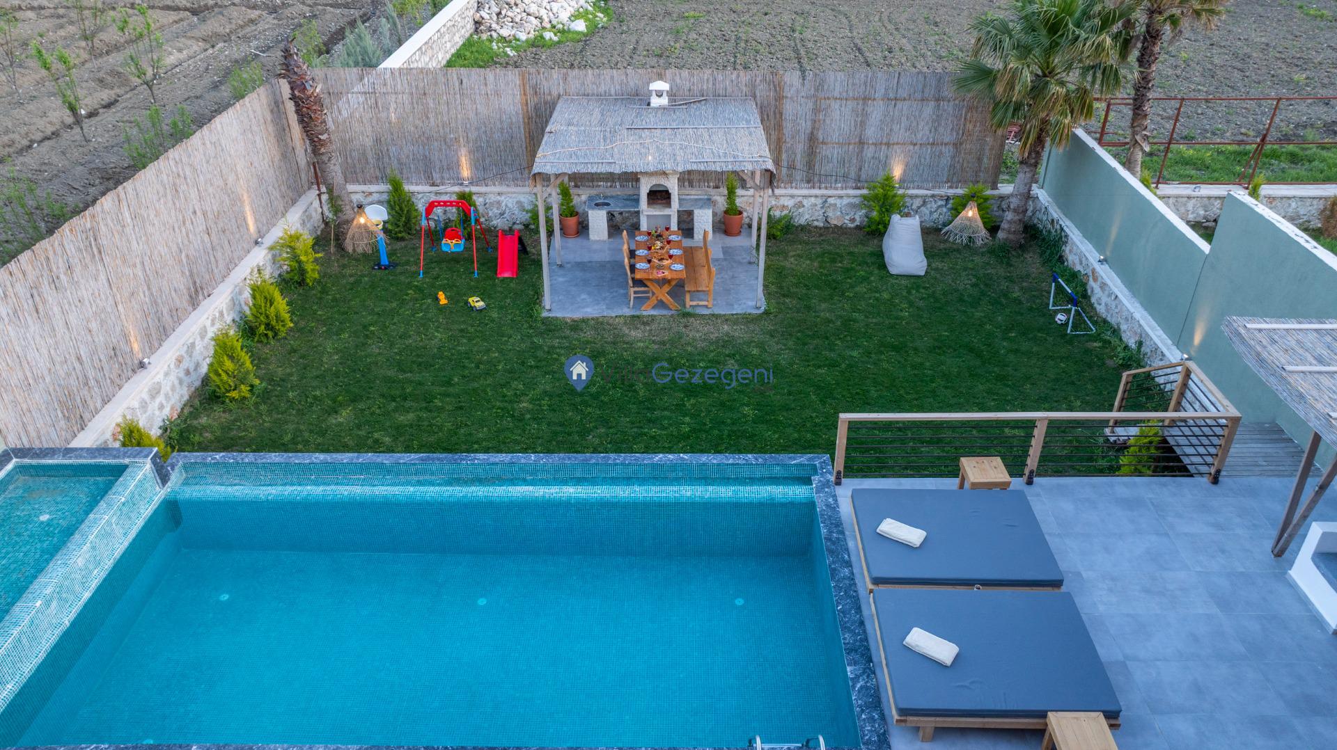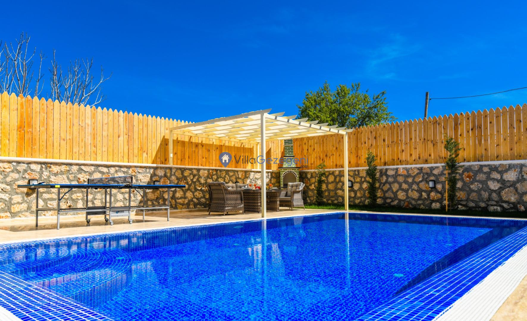 Villanın tam korunaklı havuzu, dışarıdan görünmeyecek şekilde tasarlanmıştır. Bu özellik, hem muhafazakar misafirler hem de mahremiyetine önem verenler için idealdir. Havuzun yanında bulunan geniş teras, gün boyu güneşlenmek ve dinlenmek için mükemmel bir alan sunar.