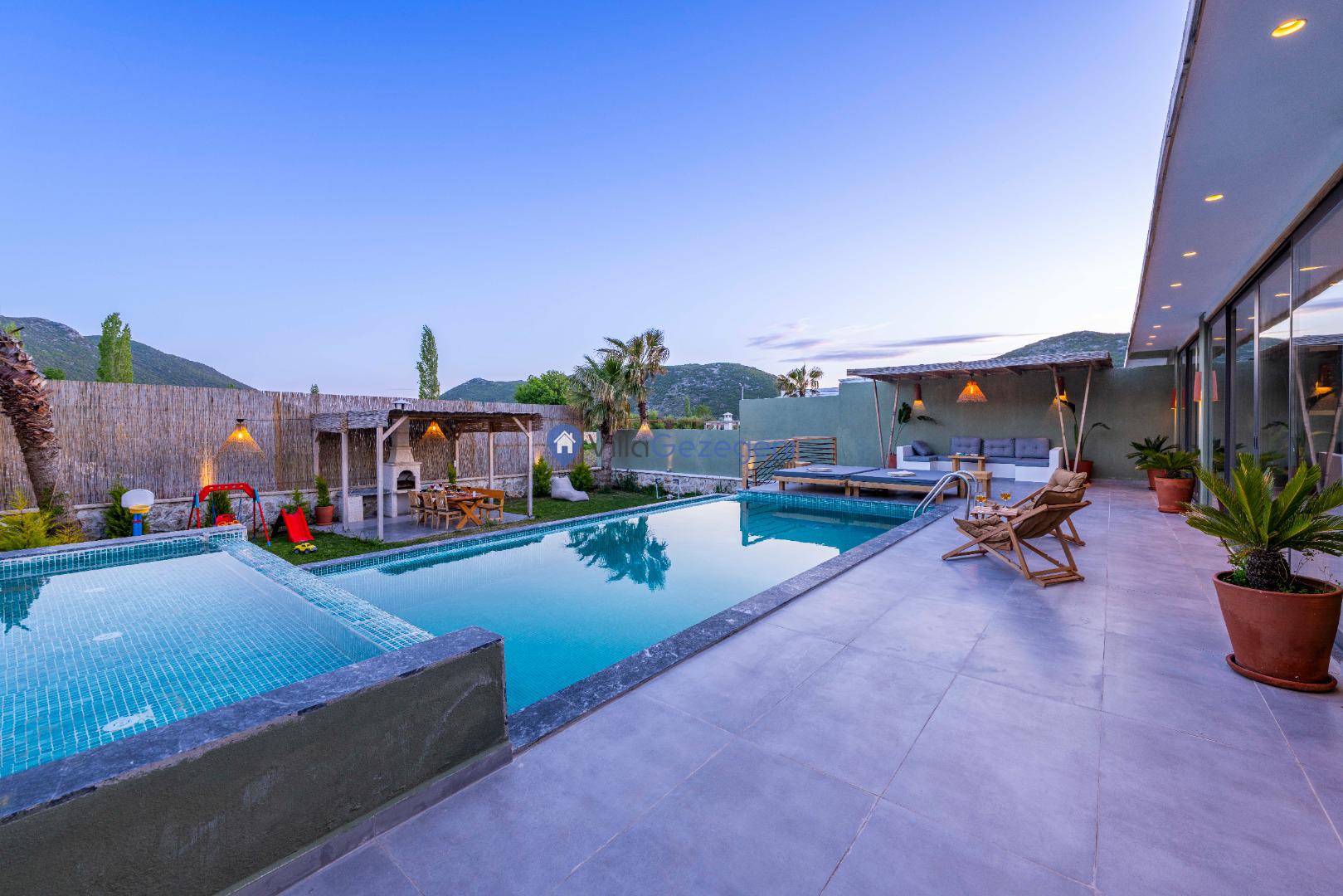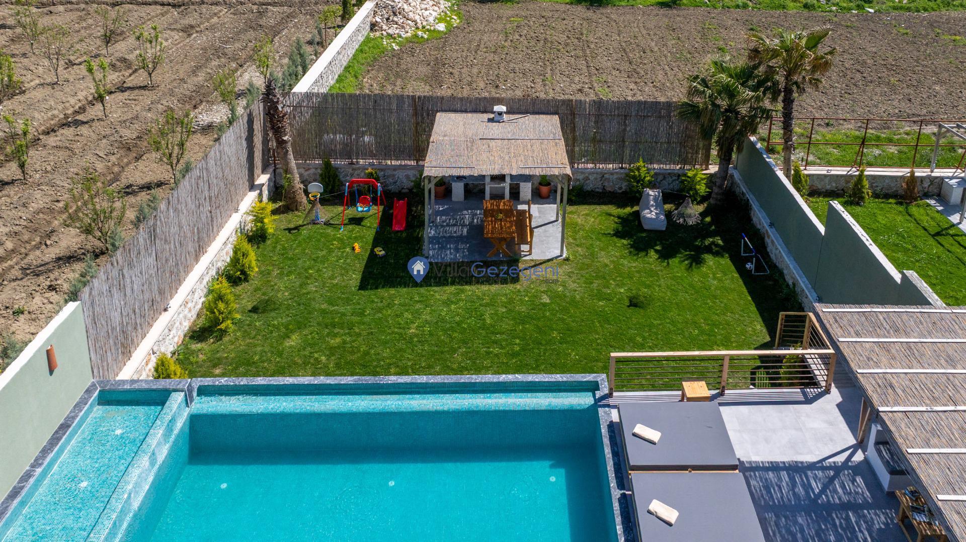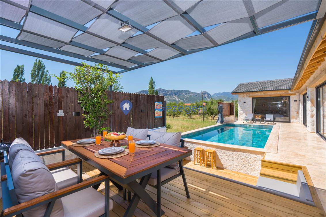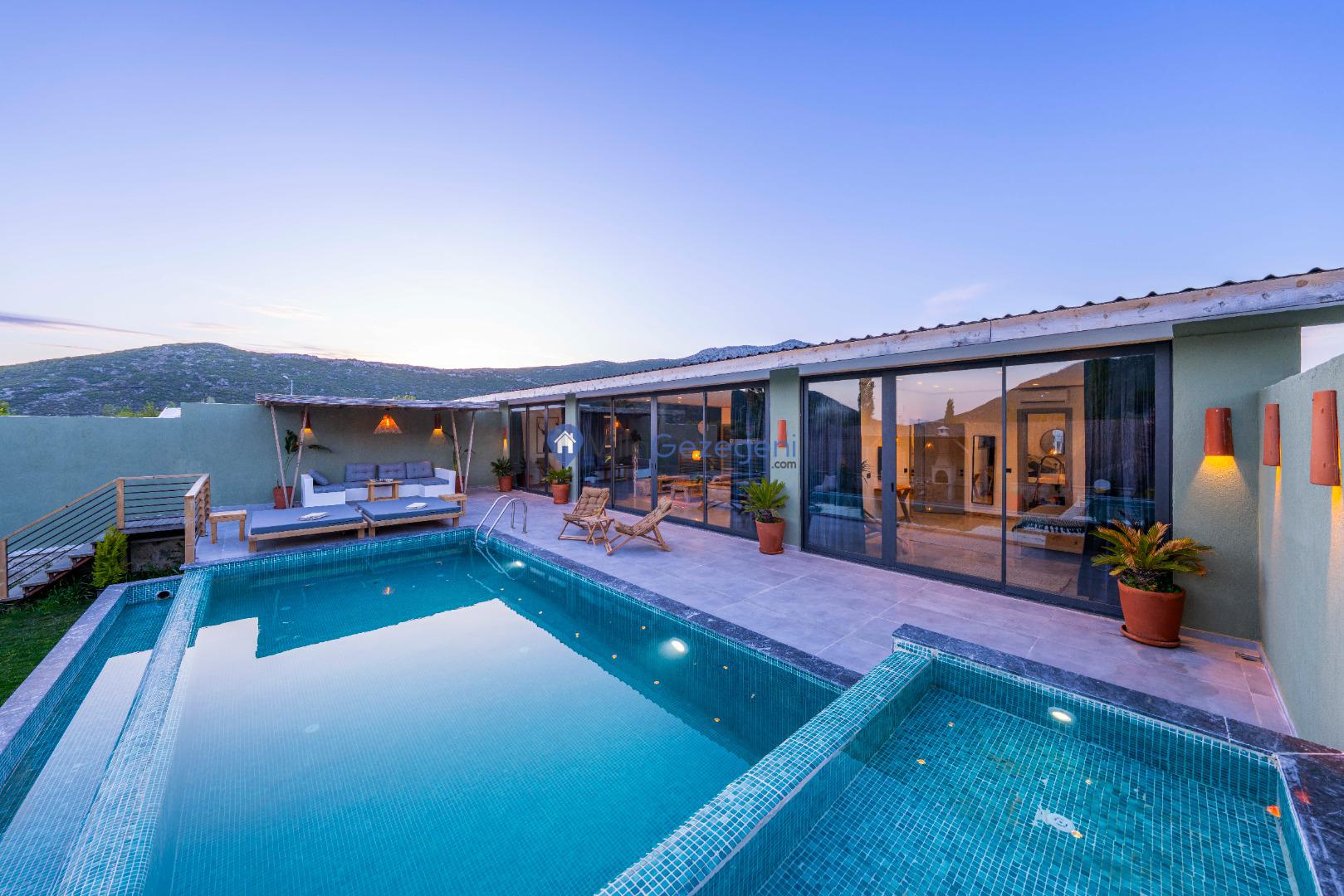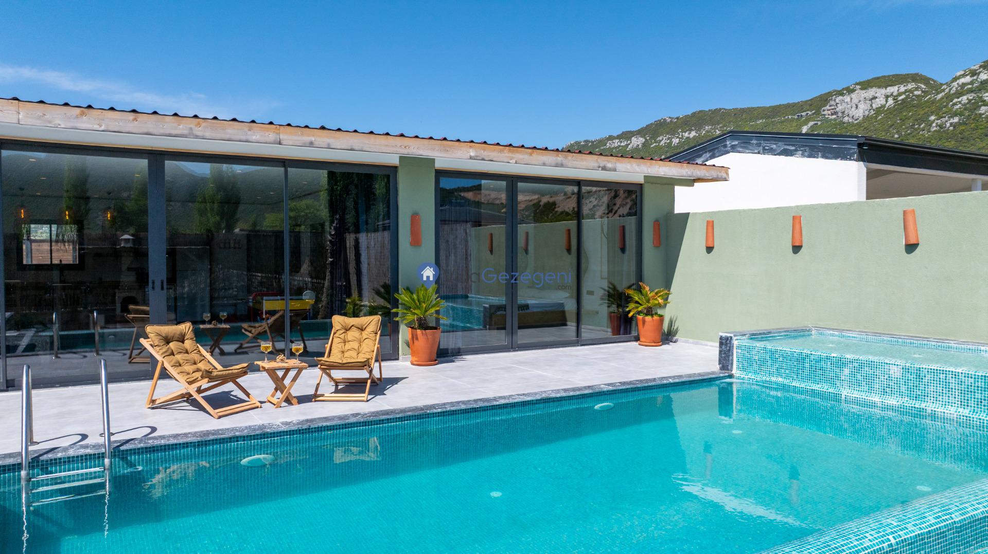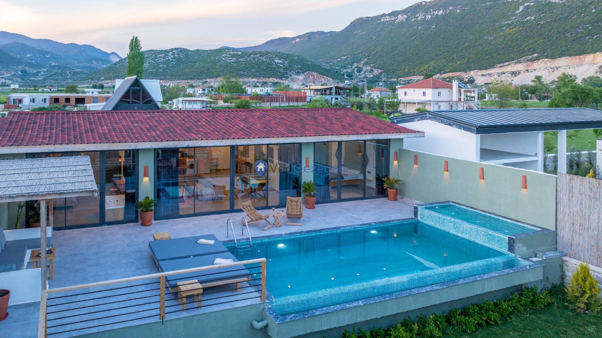 Villanın tam korunaklı havuzu, dışarıdan görünmeyecek şekilde tasarlanmıştır. Bu özellik, hem muhafazakar misafirler hem de mahremiyetine önem verenler için idealdir. Havuzun yanında bulunan geniş teras, gün boyu güneşlenmek ve dinlenmek için mükemmel bir alan sunar.