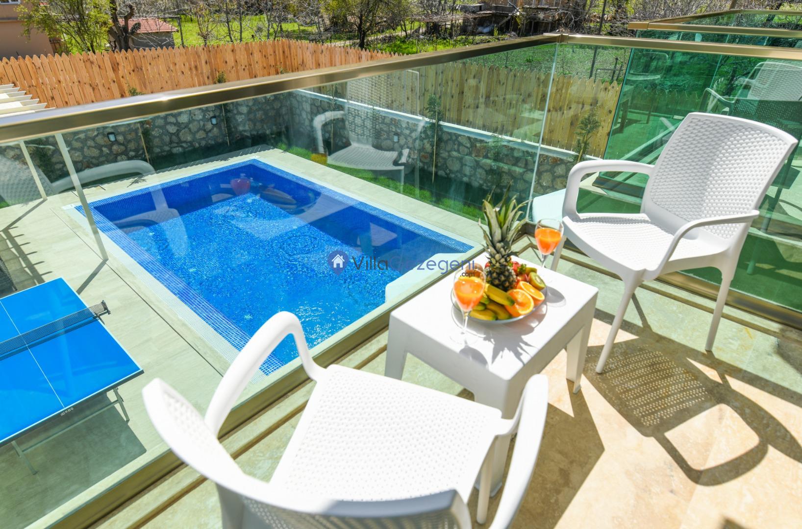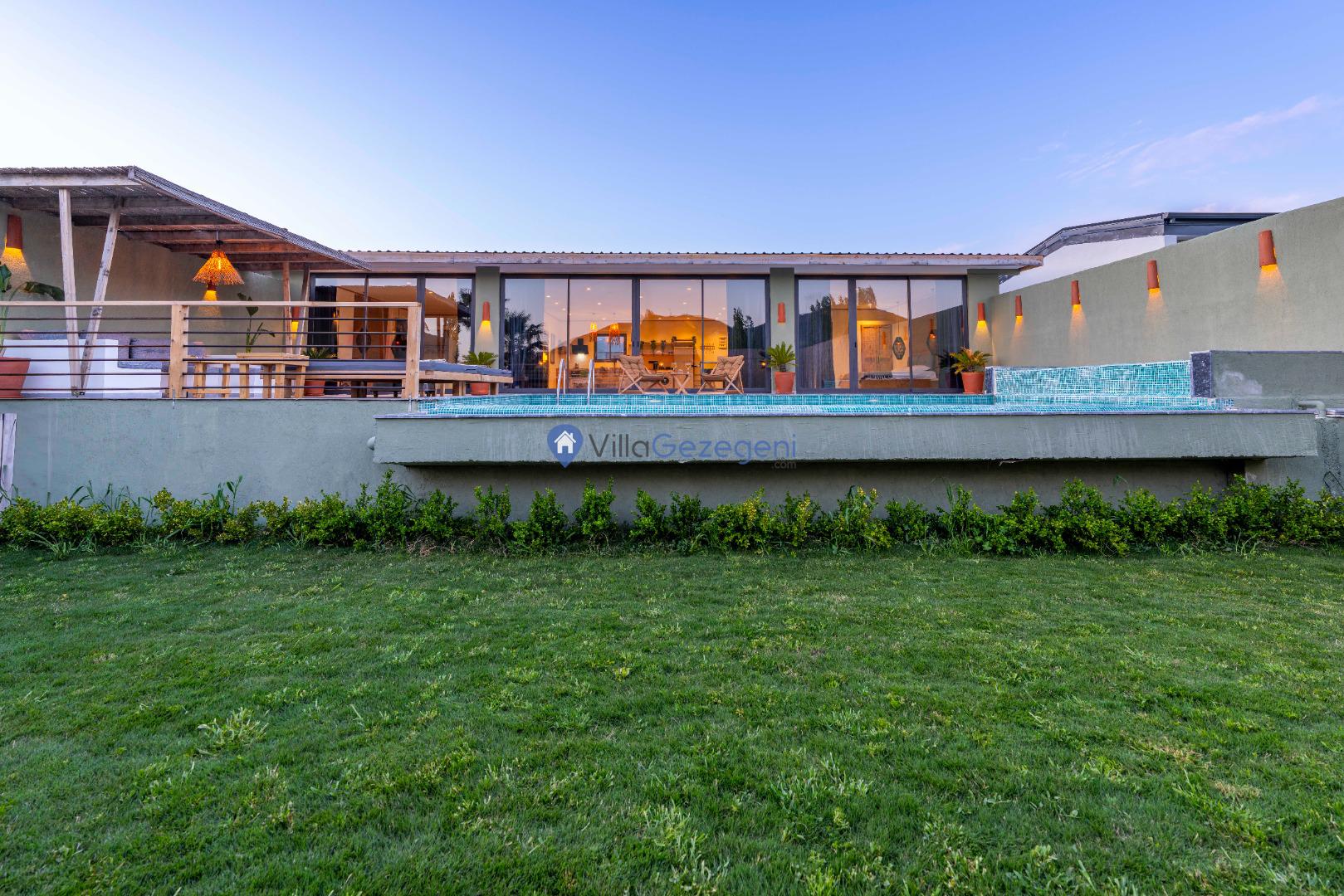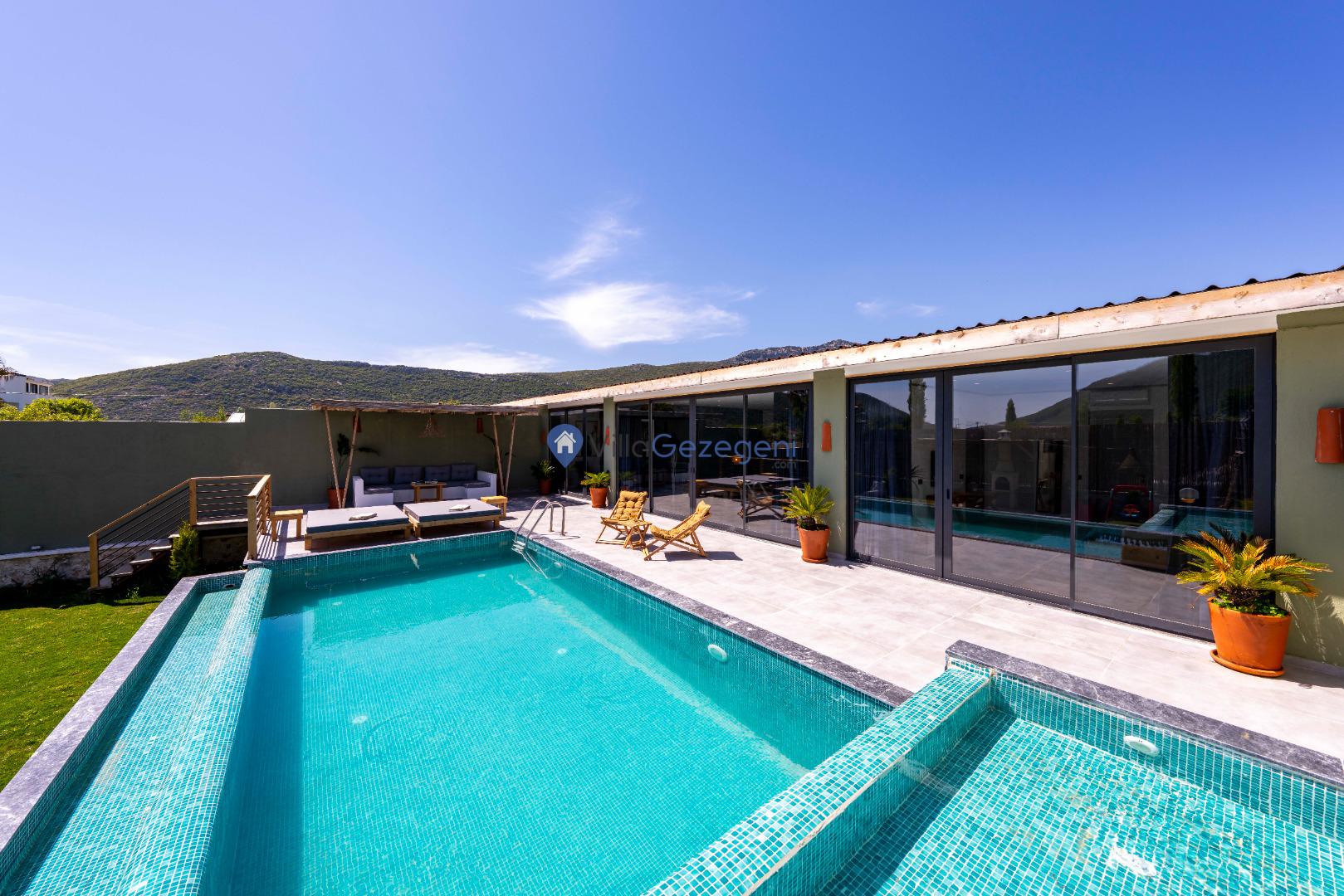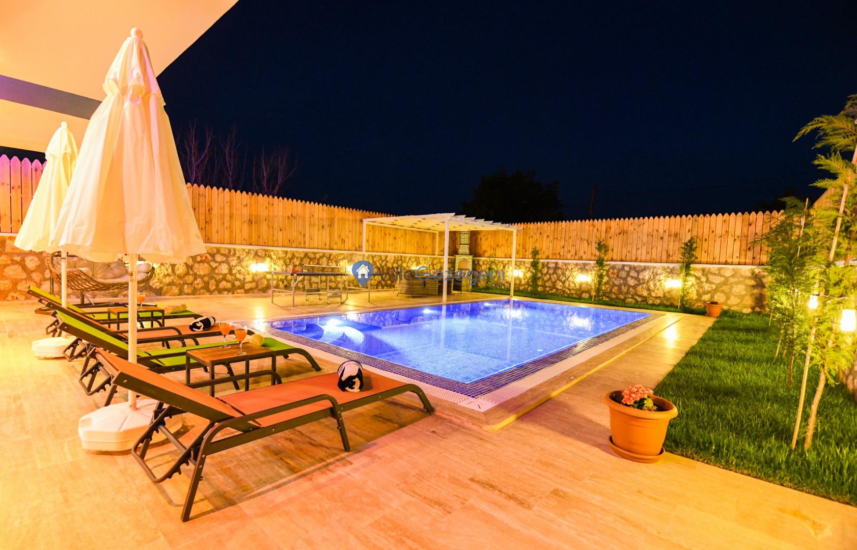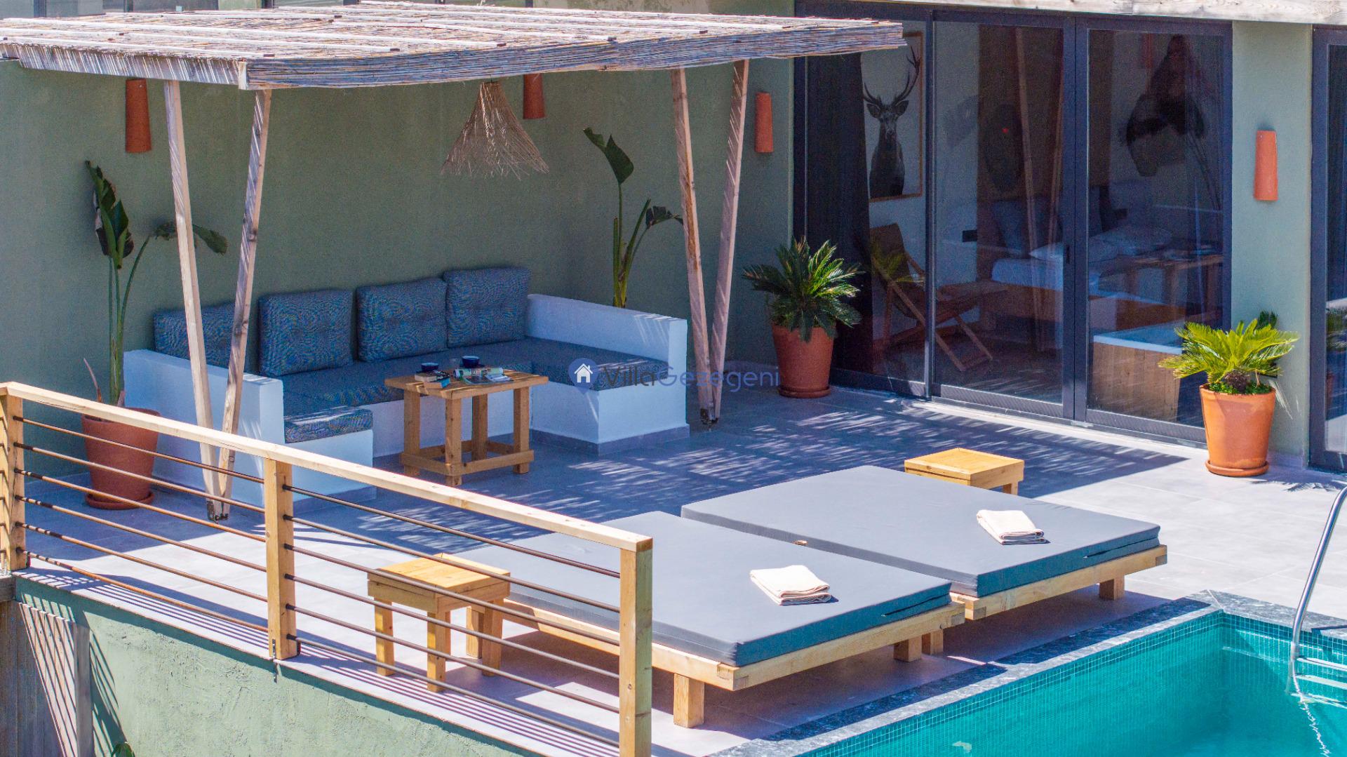 Villanın tam korunaklı havuzu, dışarıdan görünmeyecek şekilde tasarlanmıştır. Bu özellik, hem muhafazakar misafirler hem de mahremiyetine önem verenler için idealdir. Havuzun yanında bulunan geniş teras, gün boyu güneşlenmek ve dinlenmek için mükemmel bir alan sunar.