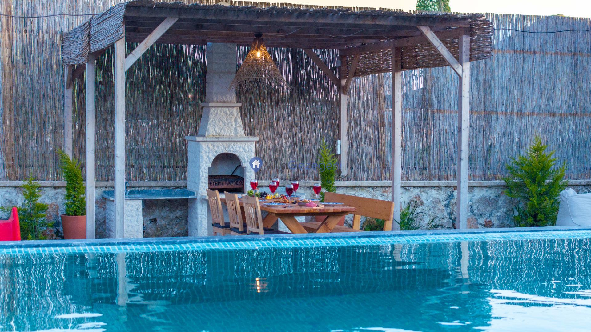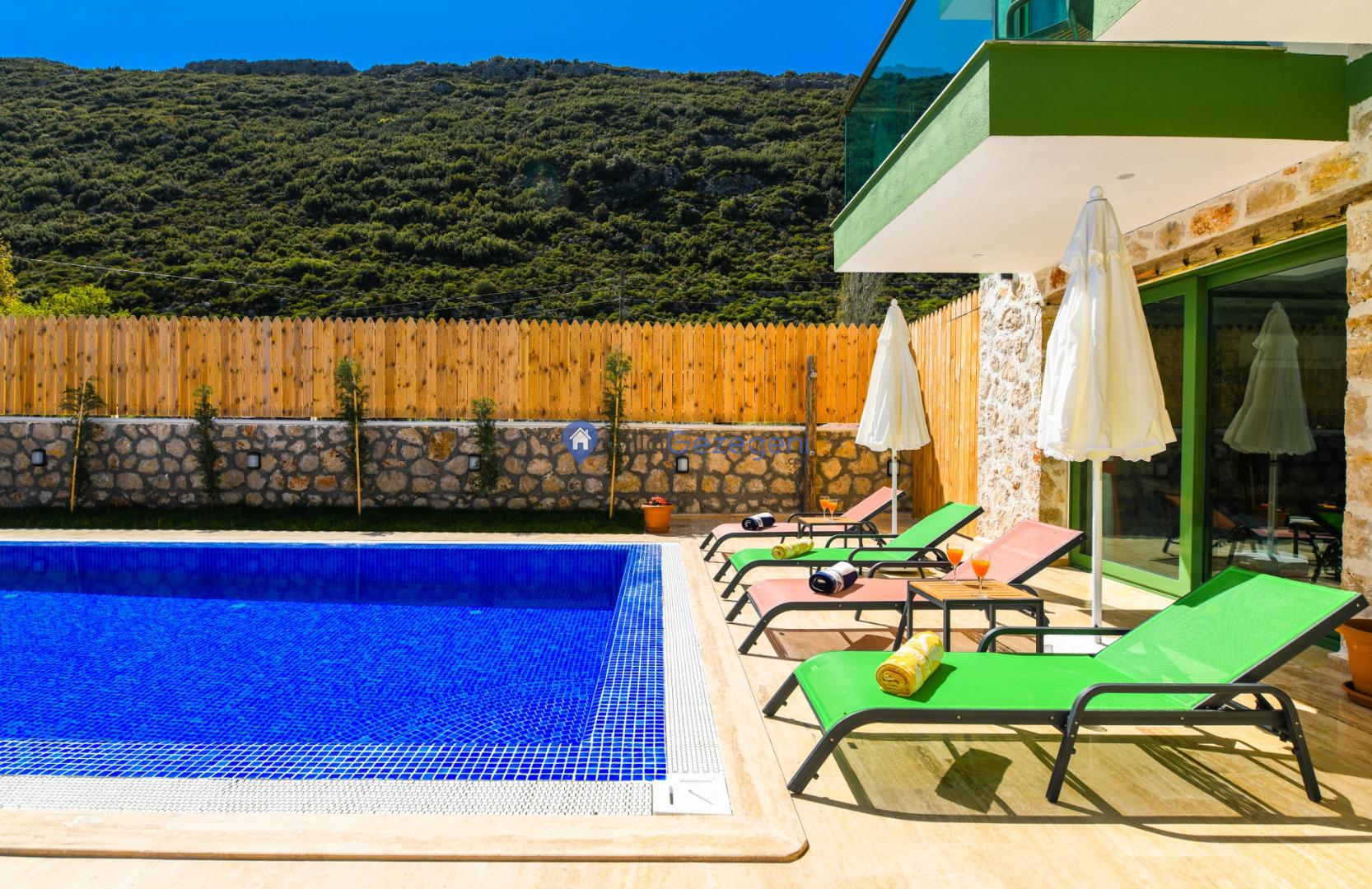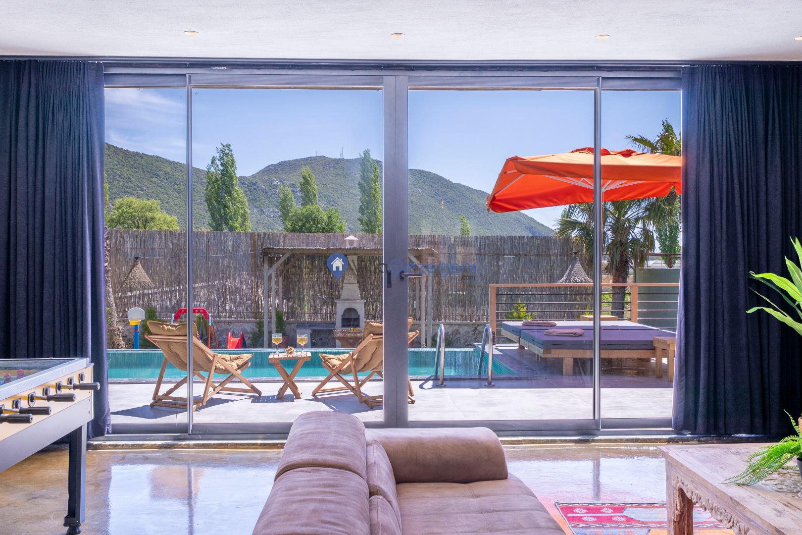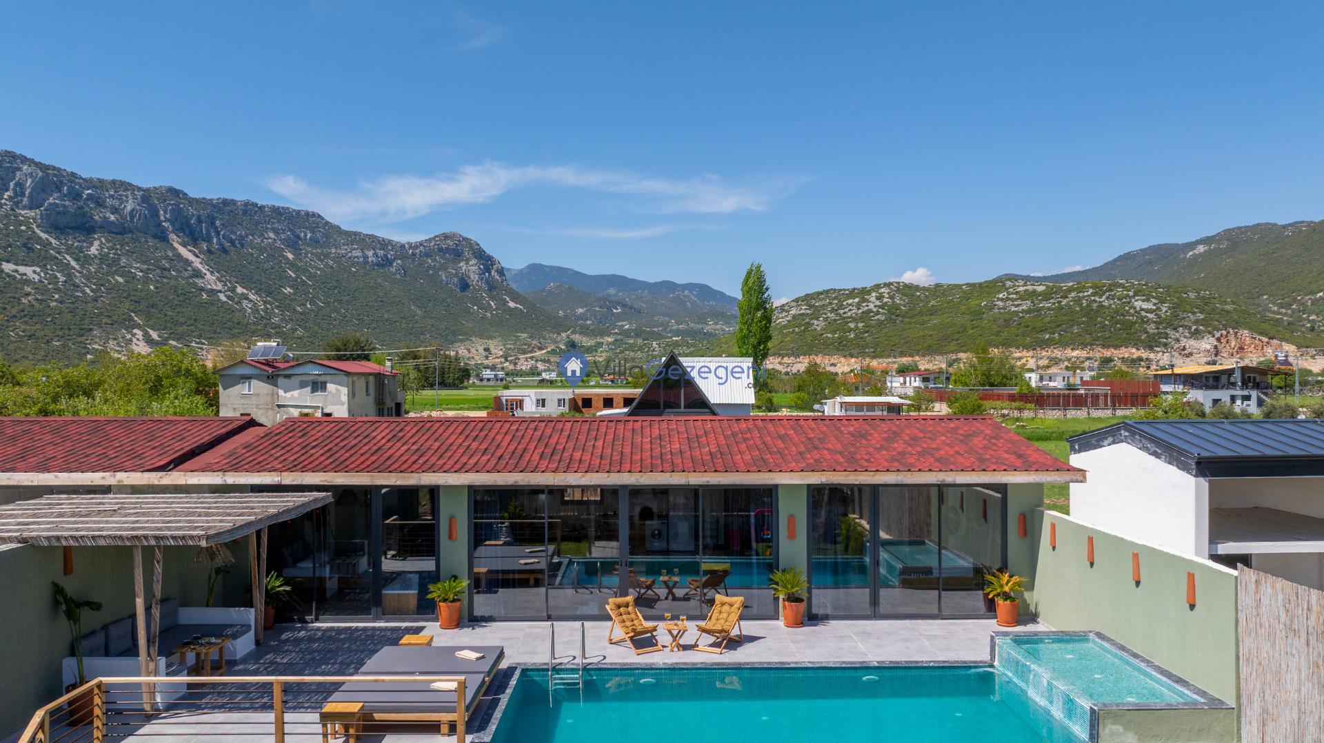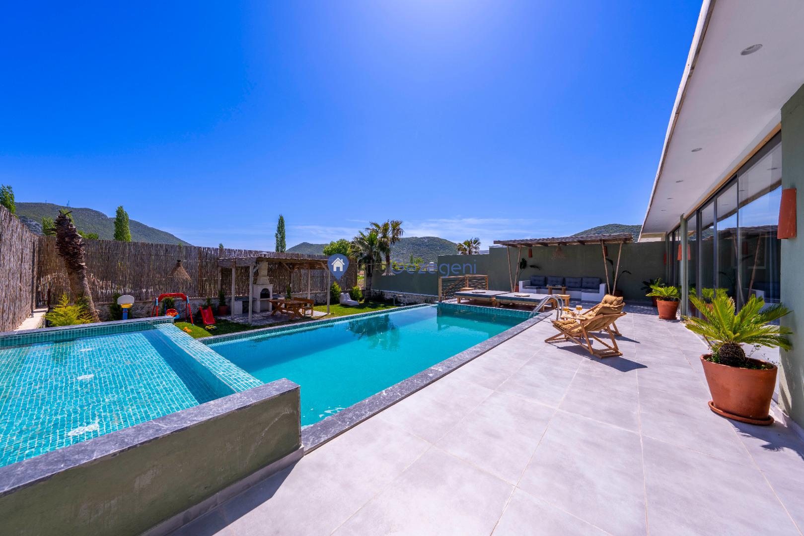 Villanın tam korunaklı havuzu, dışarıdan görünmeyecek şekilde tasarlanmıştır. Bu özellik, hem muhafazakar misafirler hem de mahremiyetine önem verenler için idealdir. Havuzun yanında bulunan geniş teras, gün boyu güneşlenmek ve dinlenmek için mükemmel bir alan sunar.