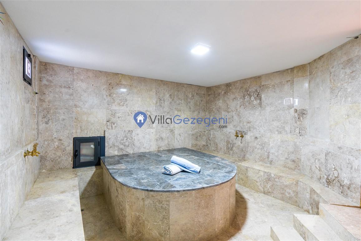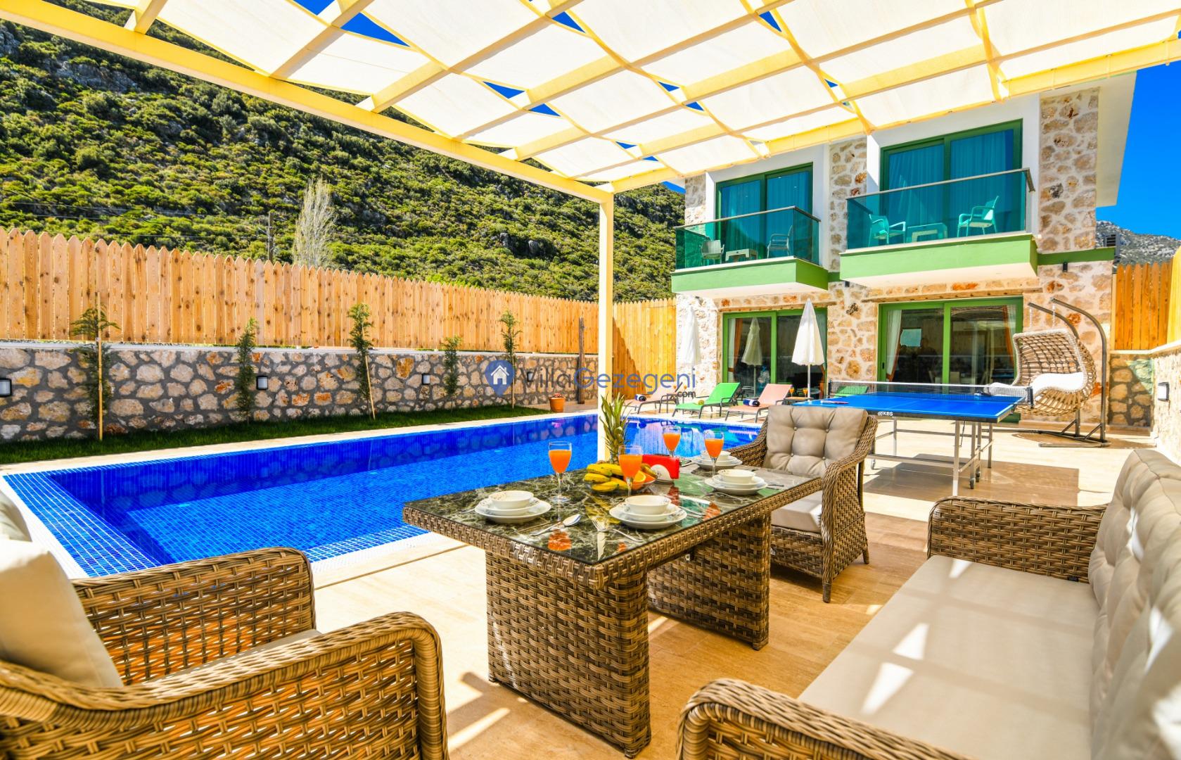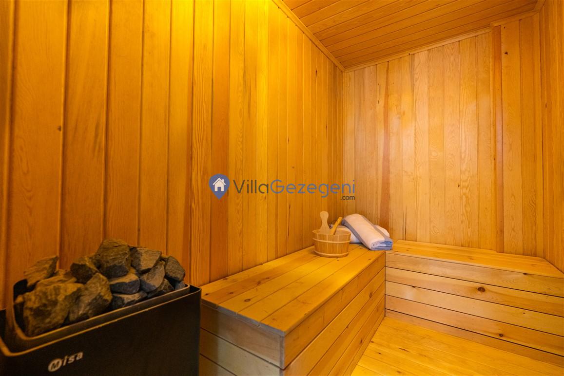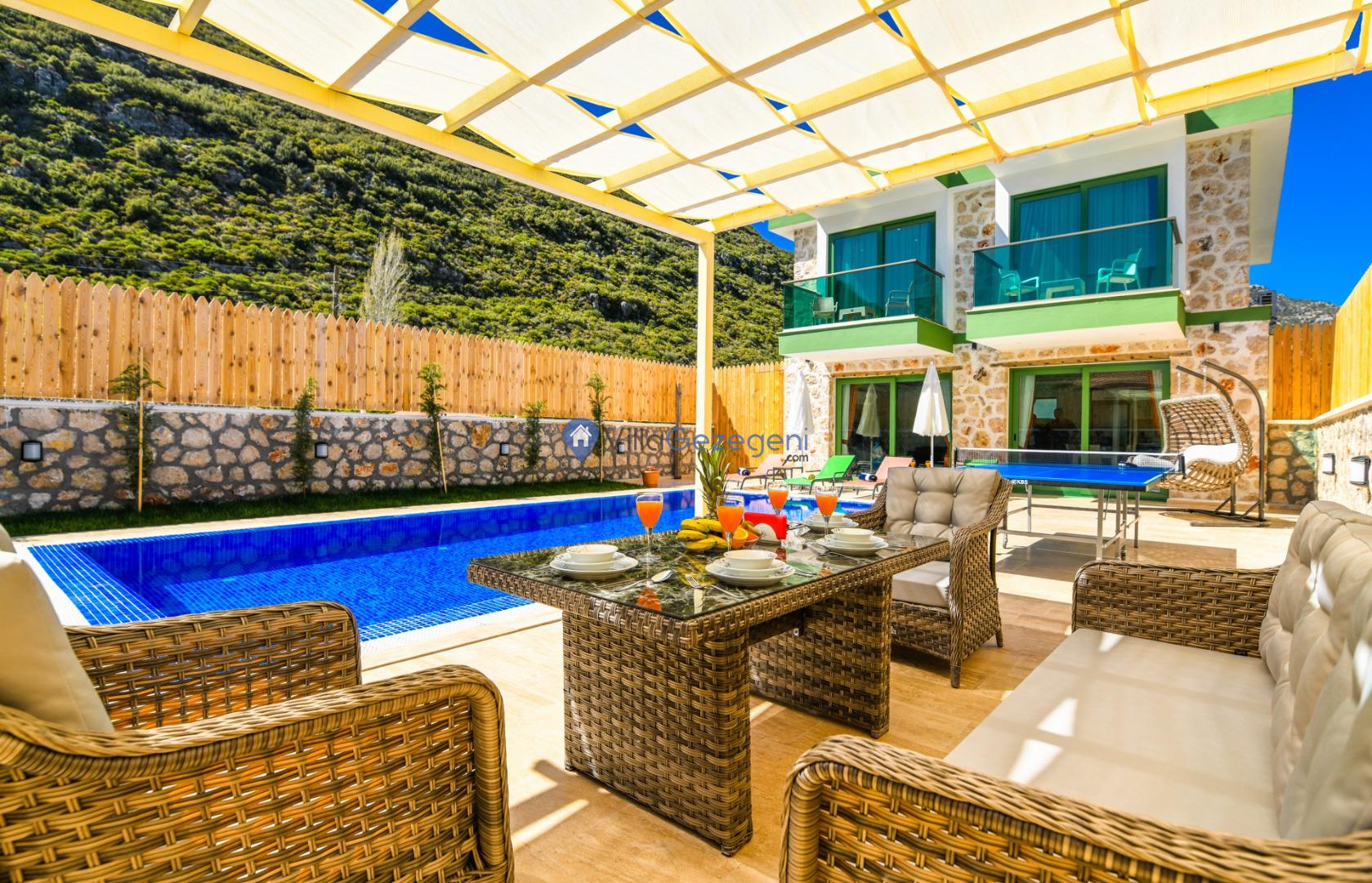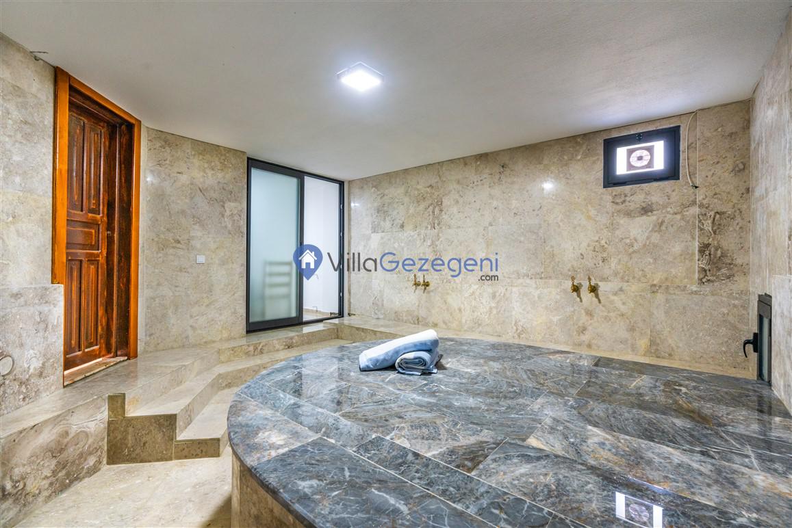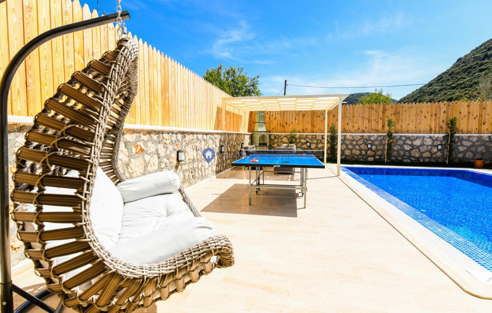 Villanın tam korunaklı havuzu, dışarıdan görünmeyecek şekilde tasarlanmıştır. Bu özellik, hem muhafazakar misafirler hem de mahremiyetine önem verenler için idealdir. Havuzun yanında bulunan geniş teras, gün boyu güneşlenmek ve dinlenmek için mükemmel bir alan sunar.