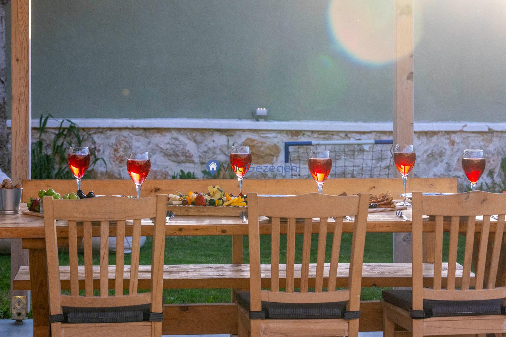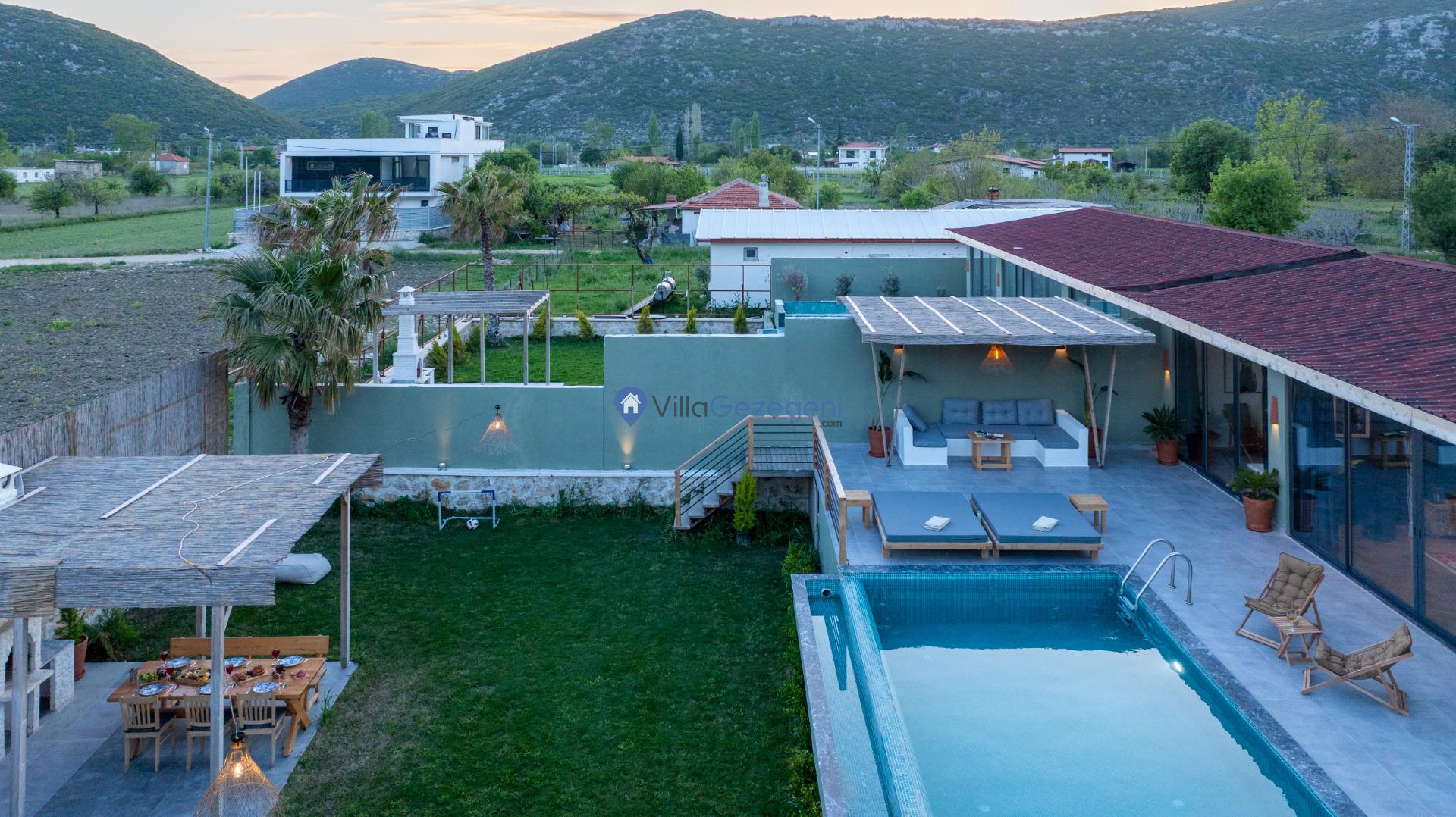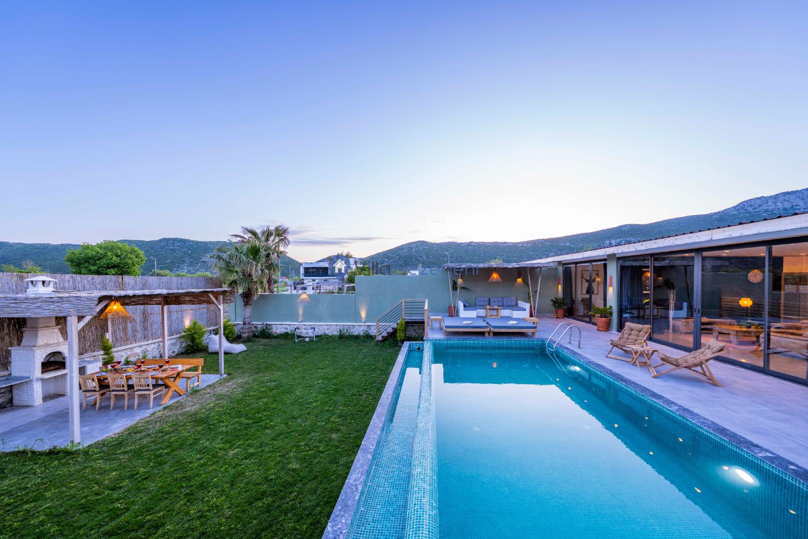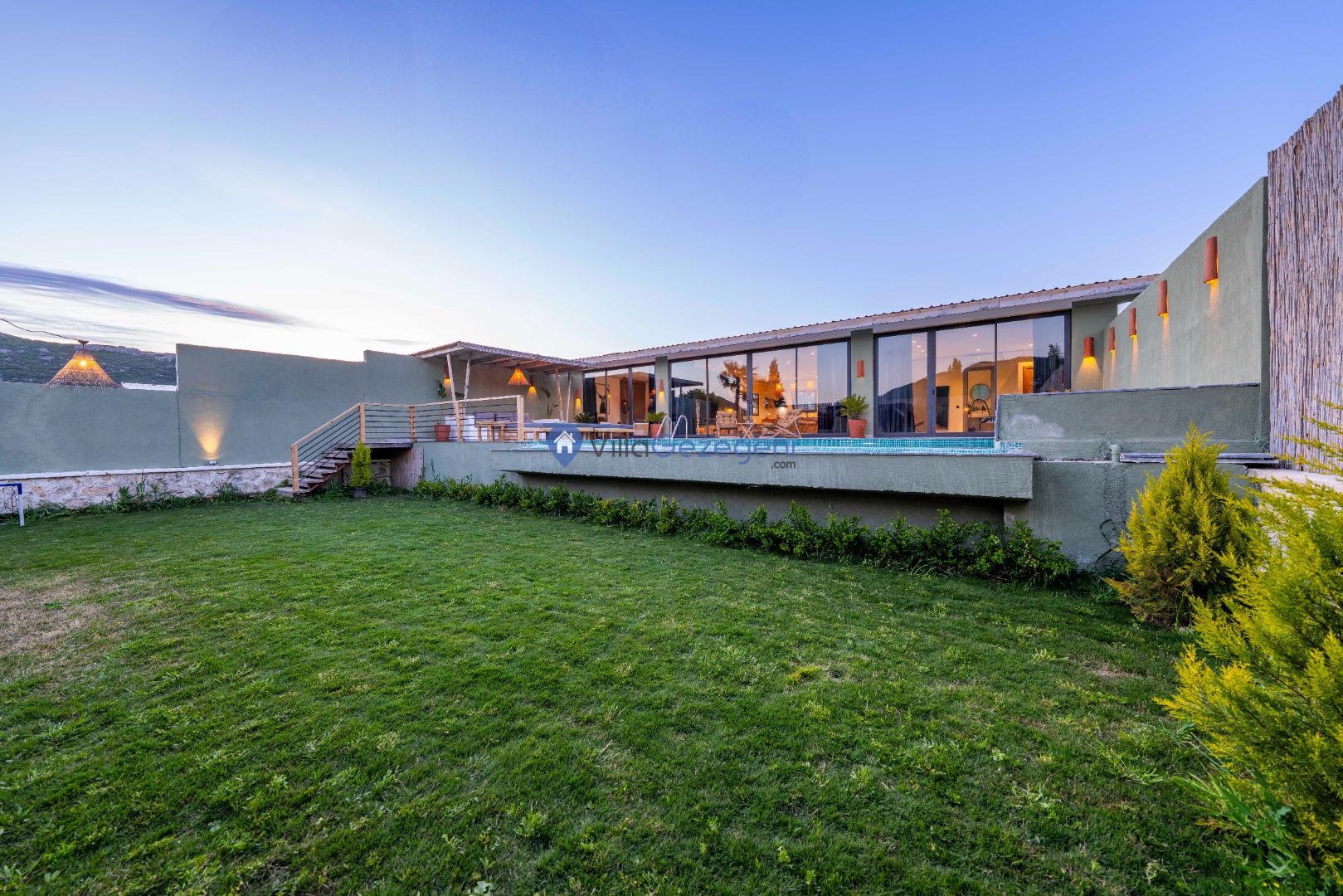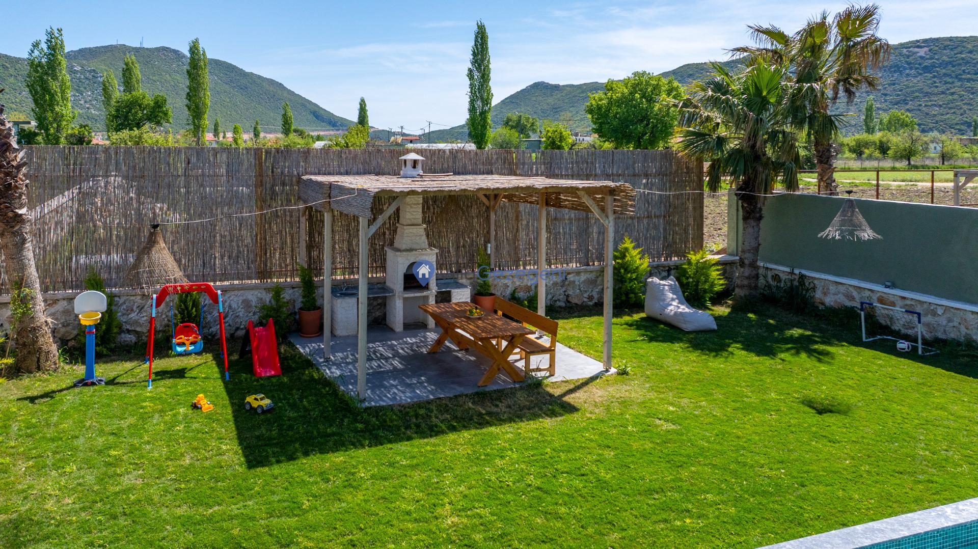 Villa Alaf, geniş ve yemyeşil bir bahçe alanına sahiptir. Bahçesinde yer alan barbekü, açık hava yemek alanı ve oturma grupları, tatilinizi daha keyifli hale getirir. Ayrıca havuz terası ve çevresindeki manzara, dinlenmeniz ve doğanın tadını çıkarmanız için idealdir.