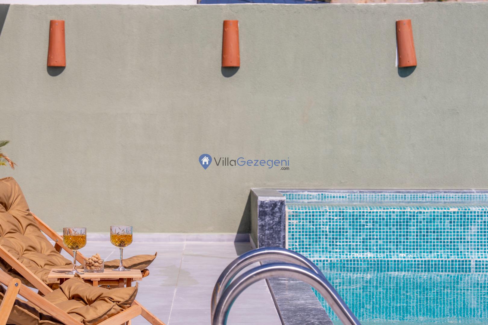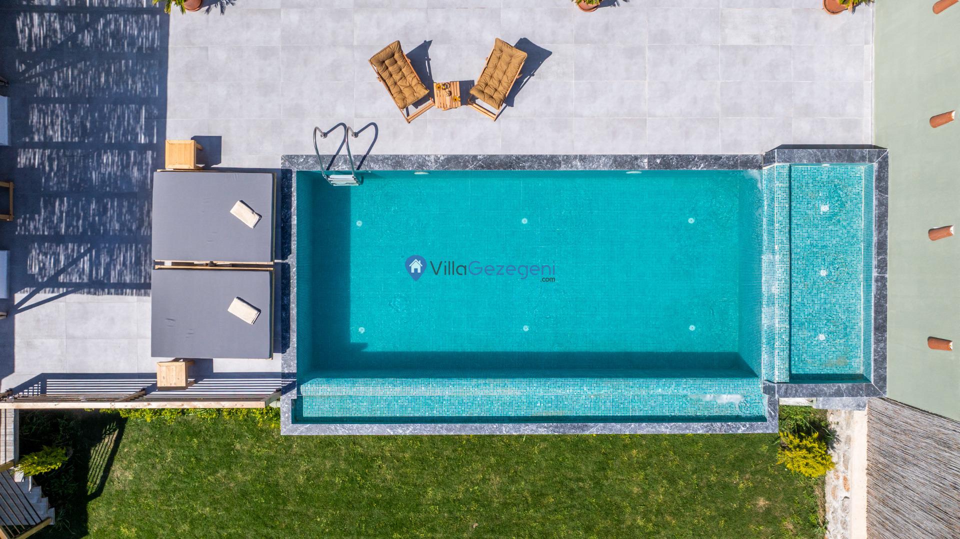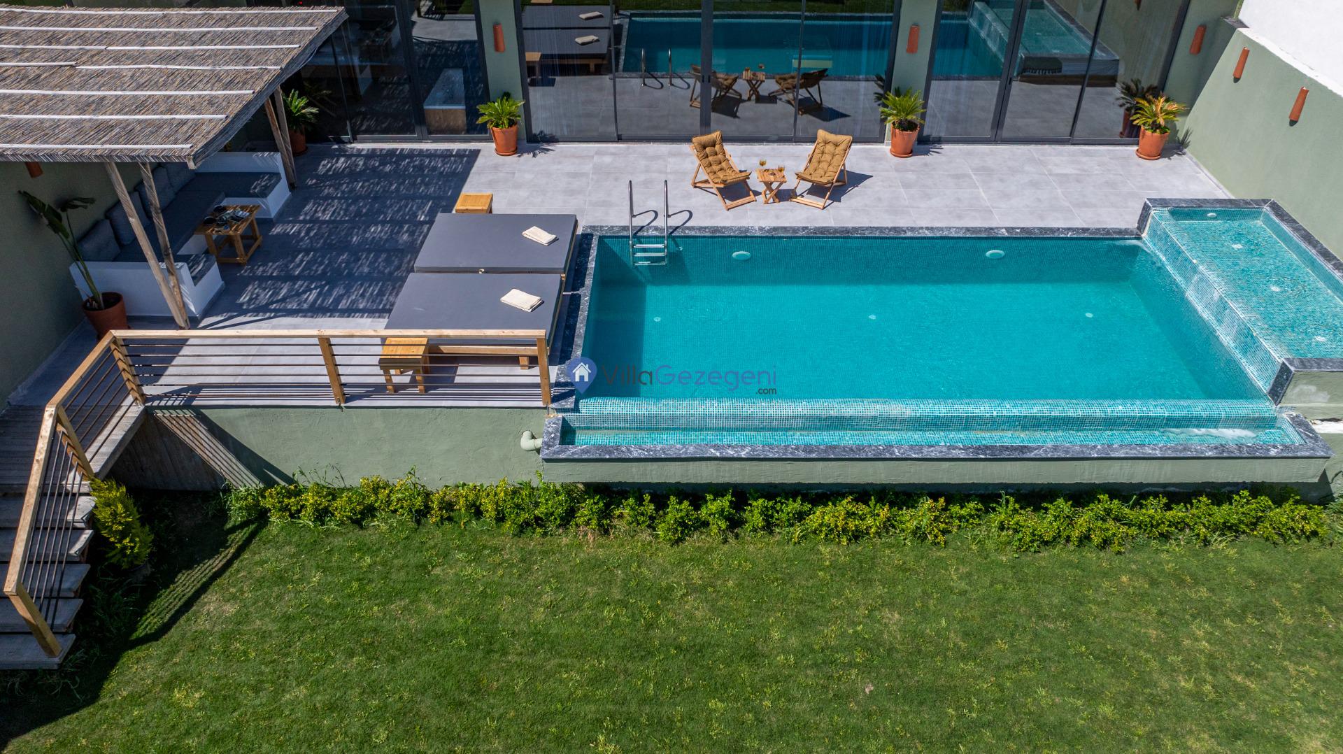 Villanın özel yüzme havuzu, tam korunaklı olup mahremiyetinize önem veren misafirler için mükemmel bir seçenek sunar. Havuz, 3 metre genişliğinde, 8 metre uzunluğunda ve 1.50 metre derinliğindedir. Geniş havuz terası, şezlonglar, güneş şemsiyeleri ve oturma alanları ile donatılmıştır.