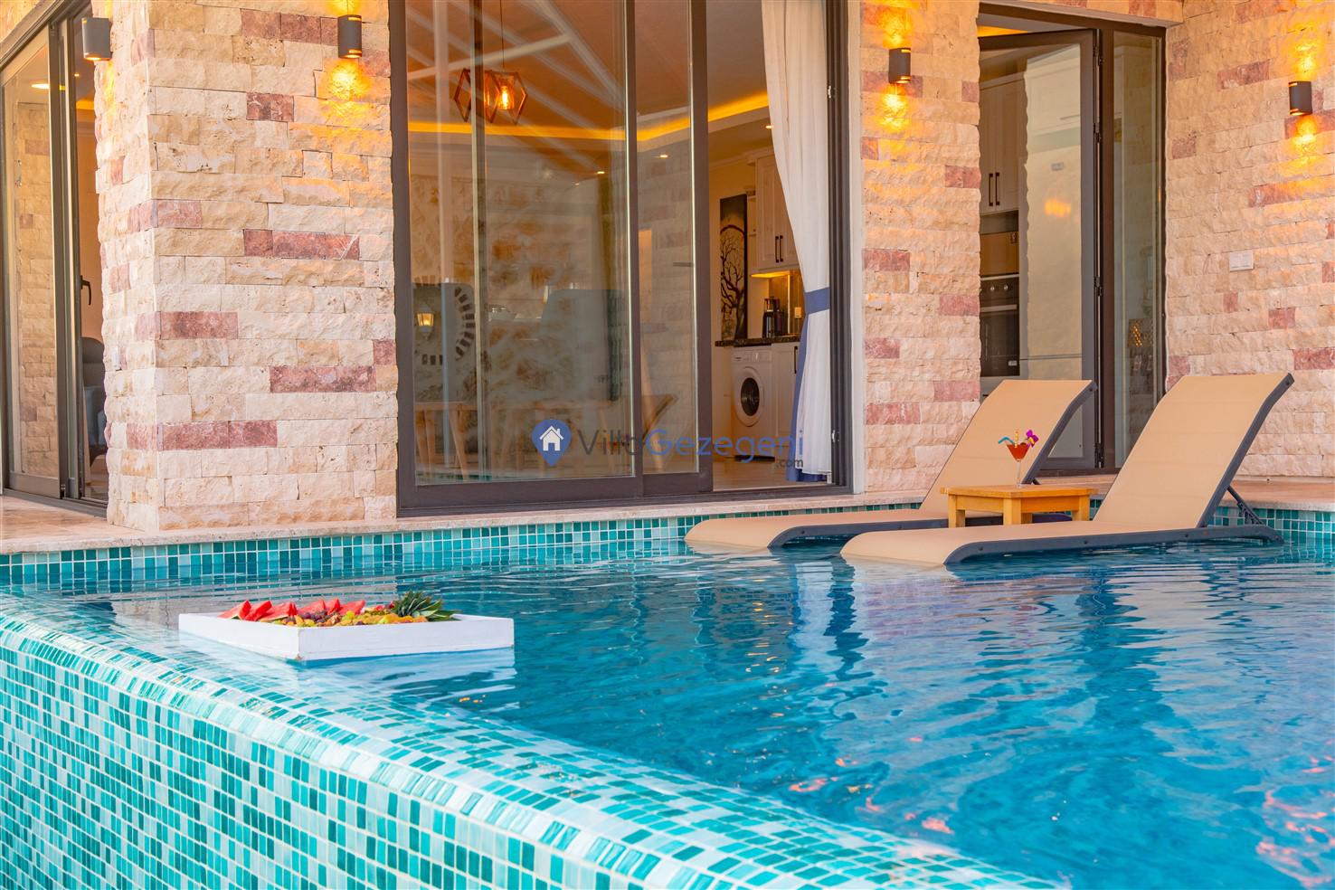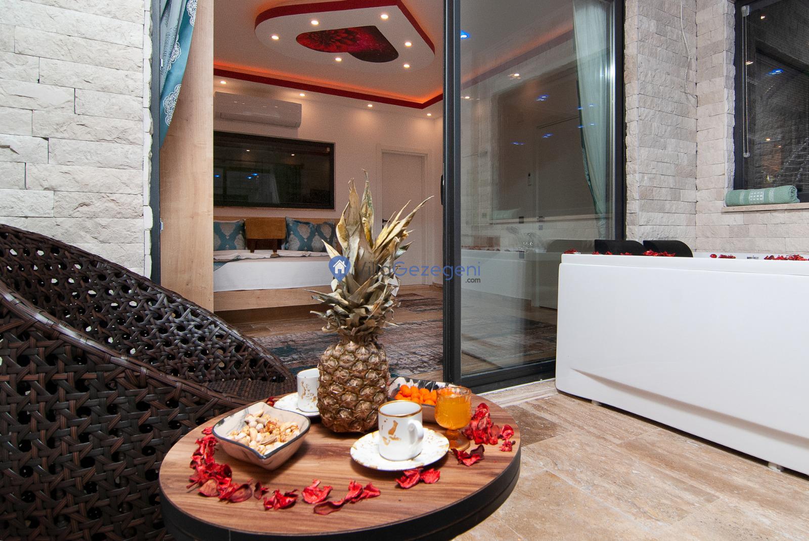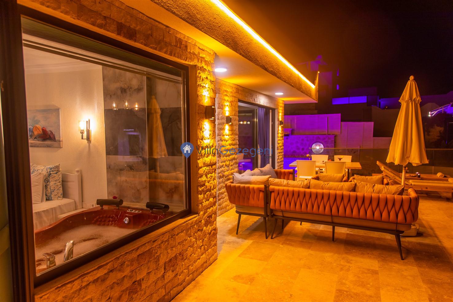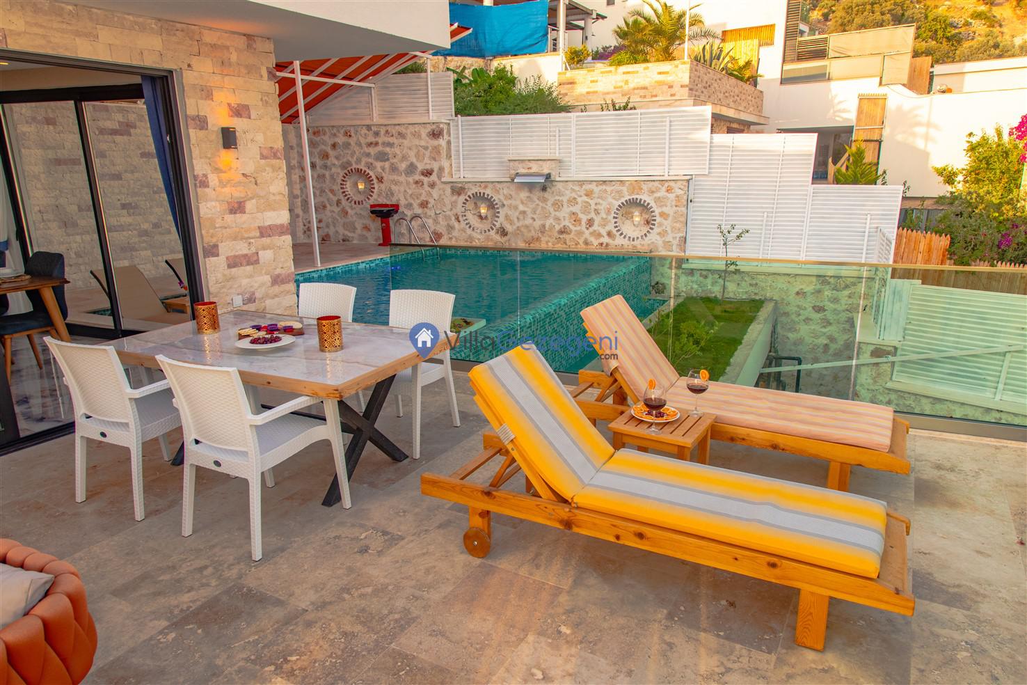 Villa Uçar 2, Kalkan Akbel mevkiinde 4 kişilik, doğa içinde, lüks tasarımlı, yeşil bahçe alanlı, merkeze yakın, jakuzili, balayına uygun kiralık villa.