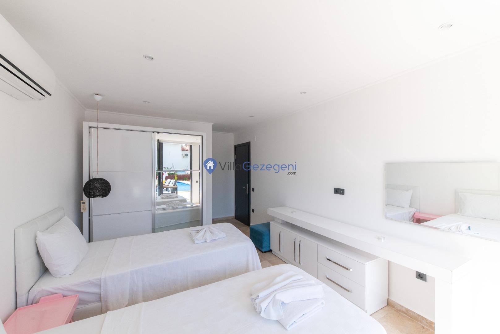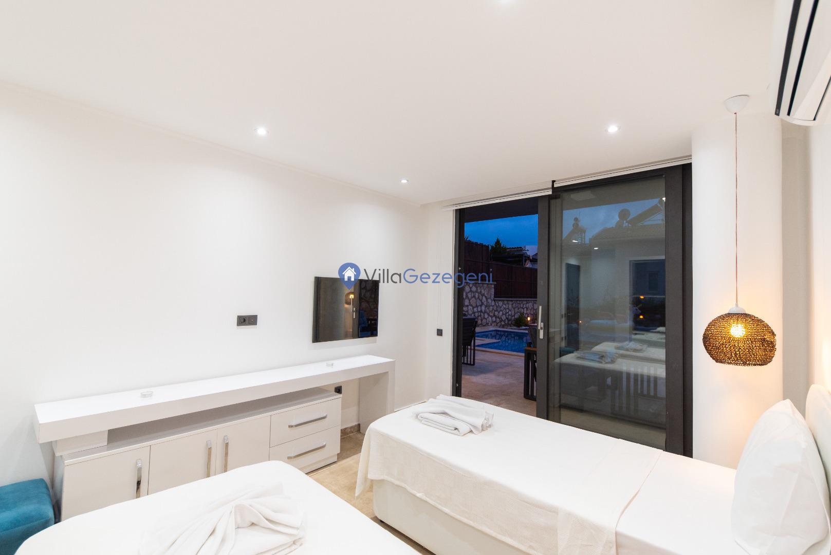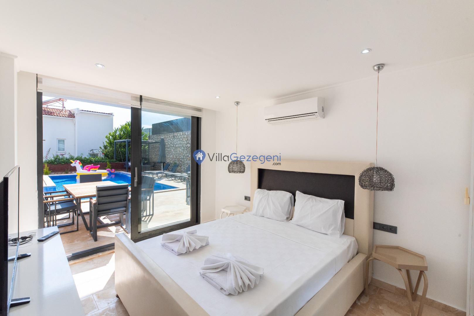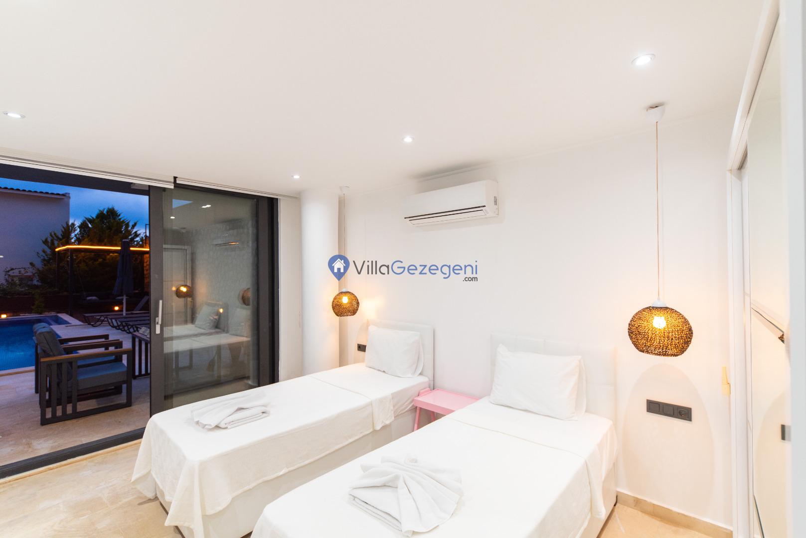 - 1. Yatak Odası: 1 çift kişilik + 1 tek kişilik yatak, TV, elbise dolabı, komodin, klima, en-suite banyo, havuz terasına çıkış