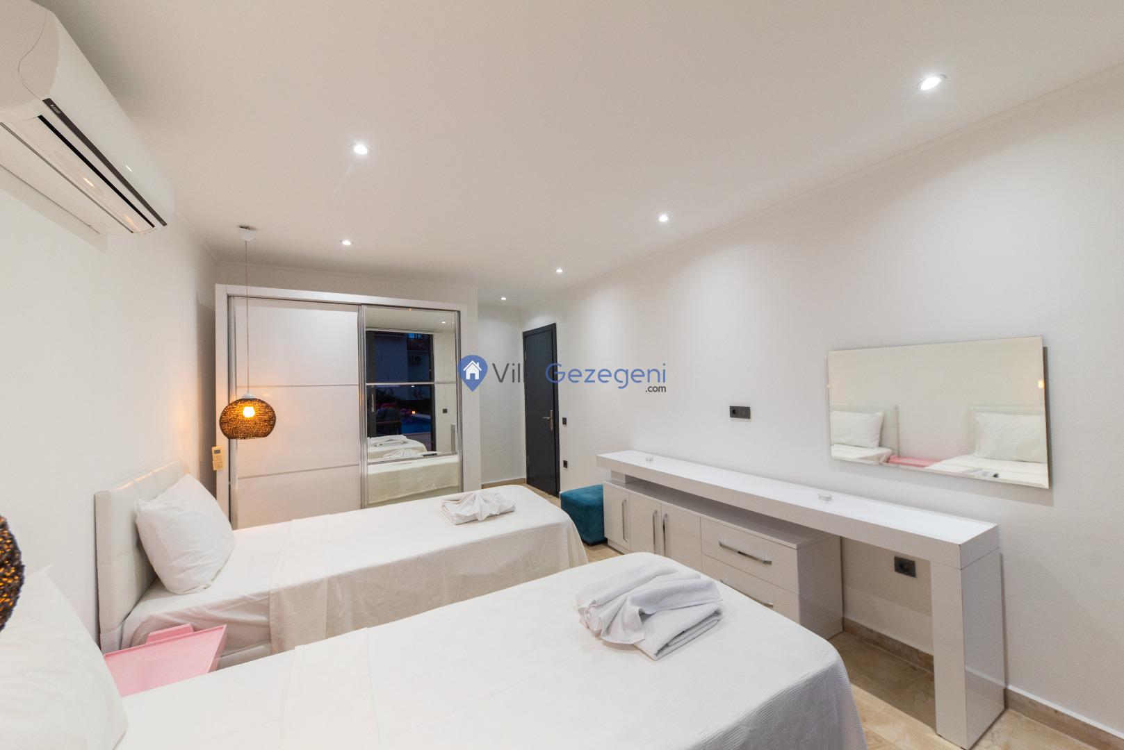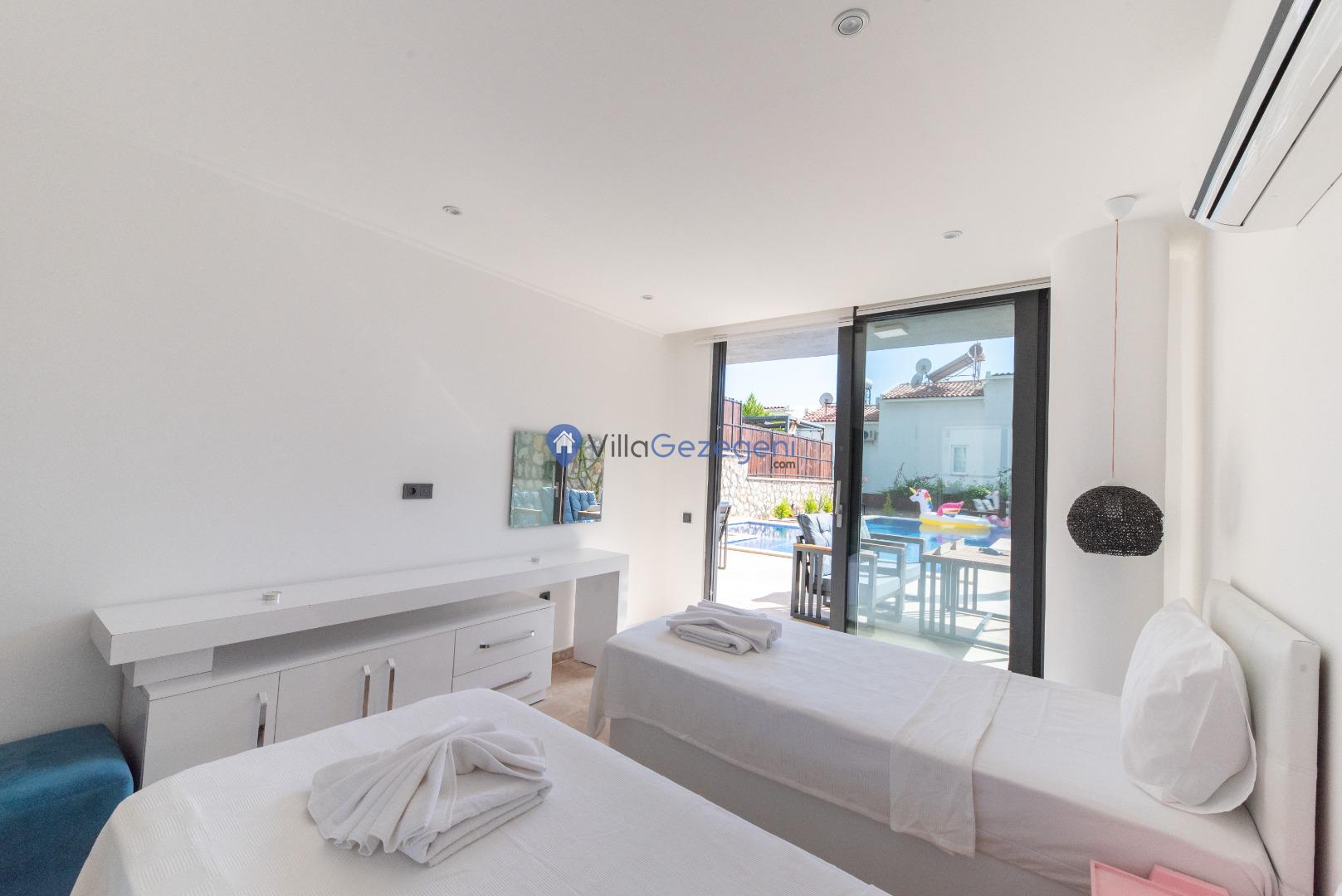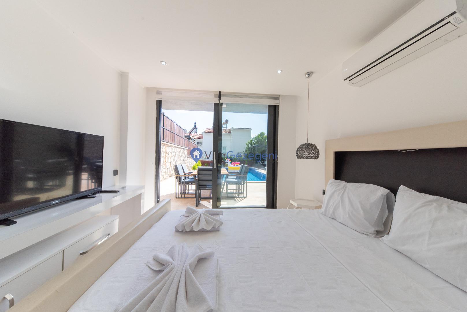 - 1. Yatak Odası: 1 çift kişilik + 1 tek kişilik yatak, TV, elbise dolabı, komodin, klima, en-suite banyo, havuz terasına çıkış