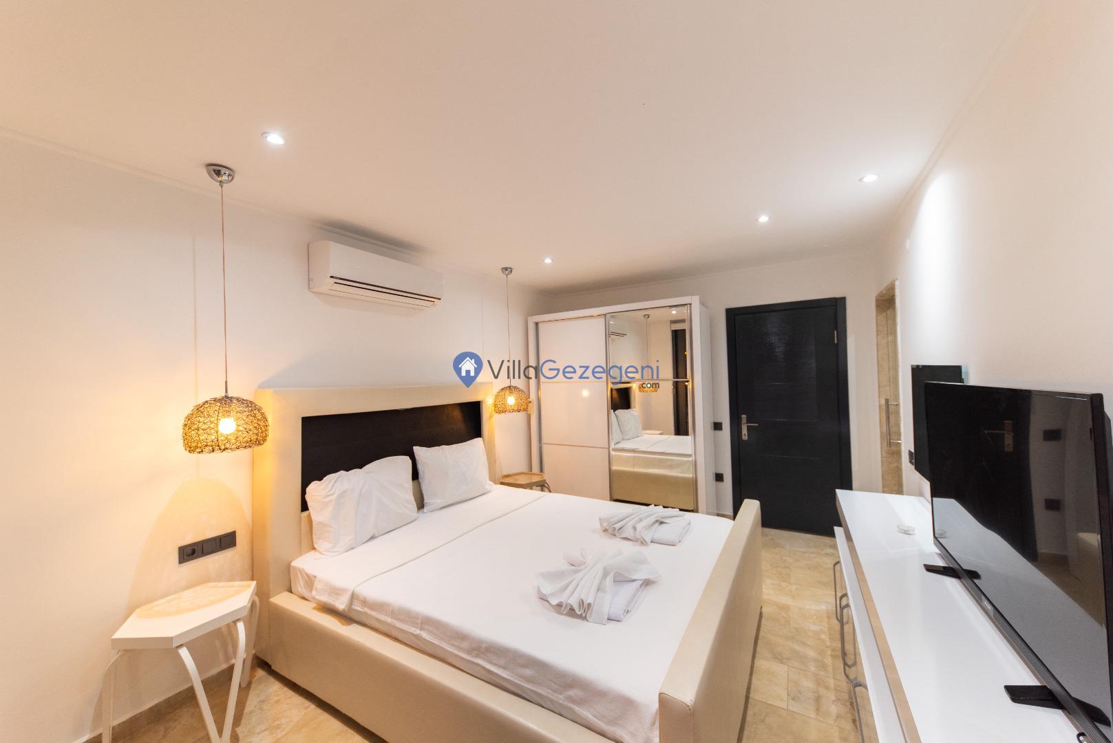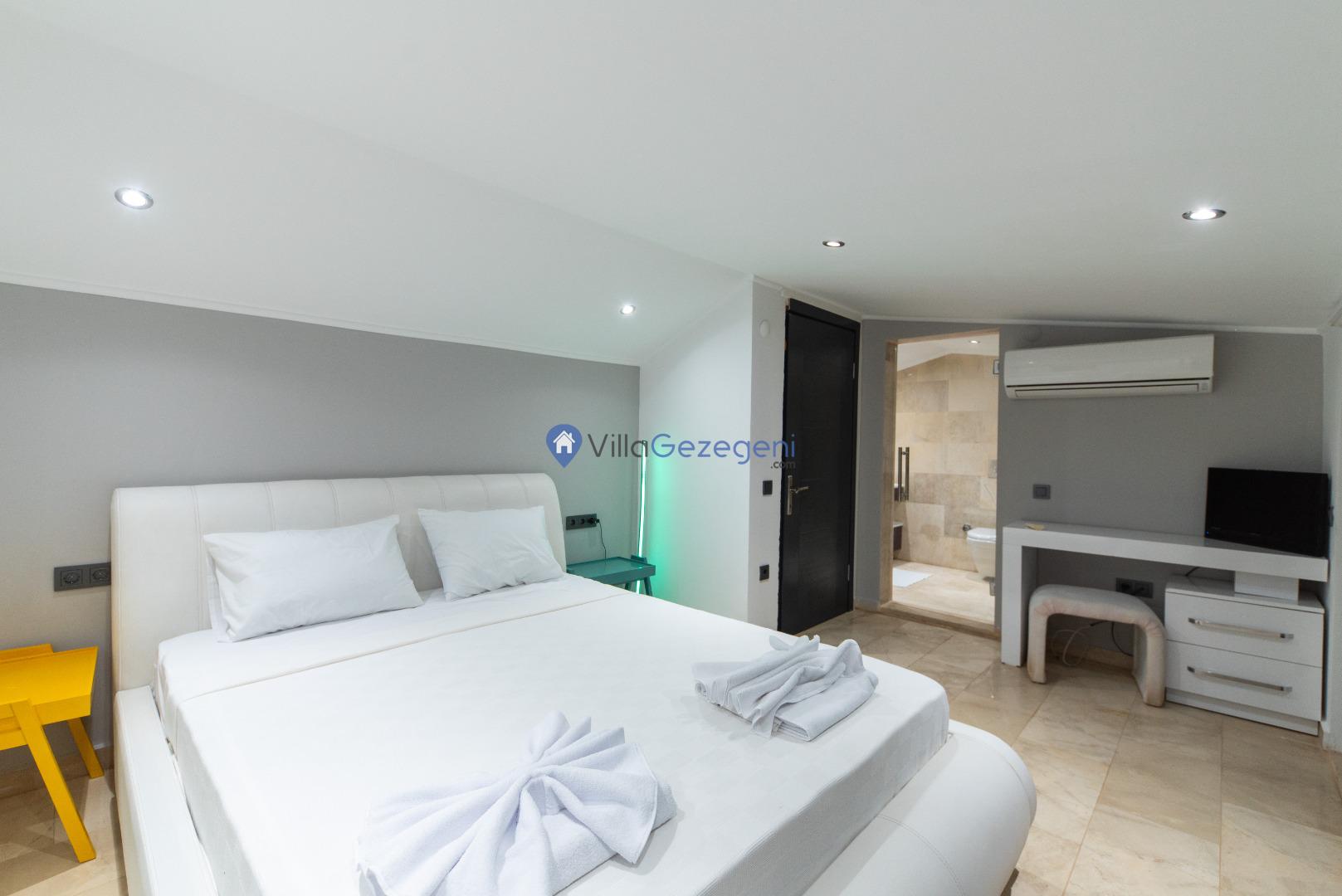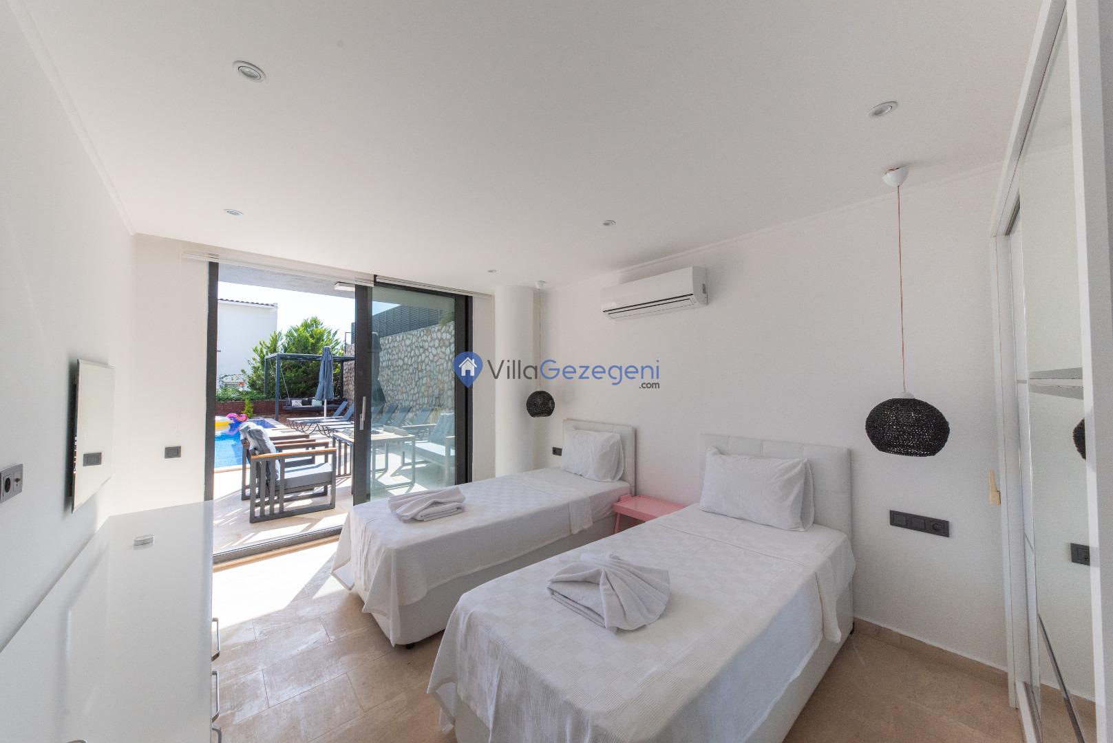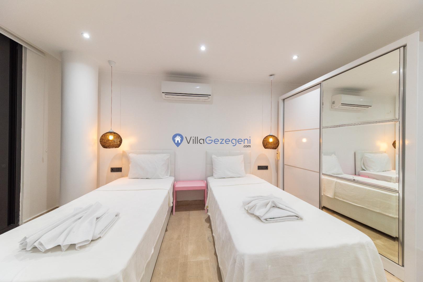 - 1. Yatak Odası: 1 çift kişilik + 1 tek kişilik yatak, TV, elbise dolabı, komodin, klima, en-suite banyo, havuz terasına çıkış
