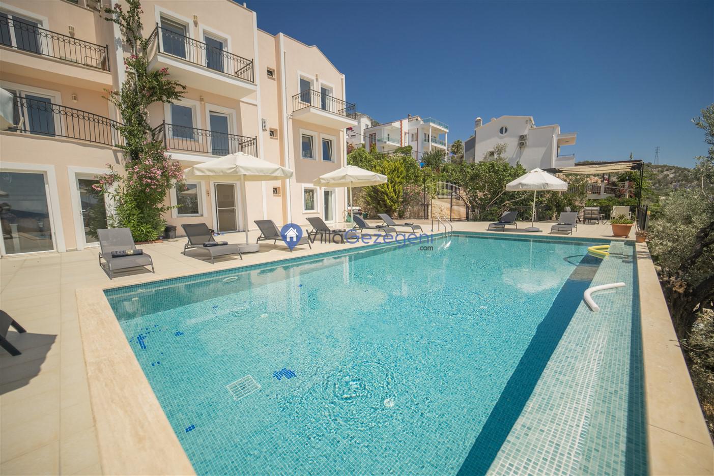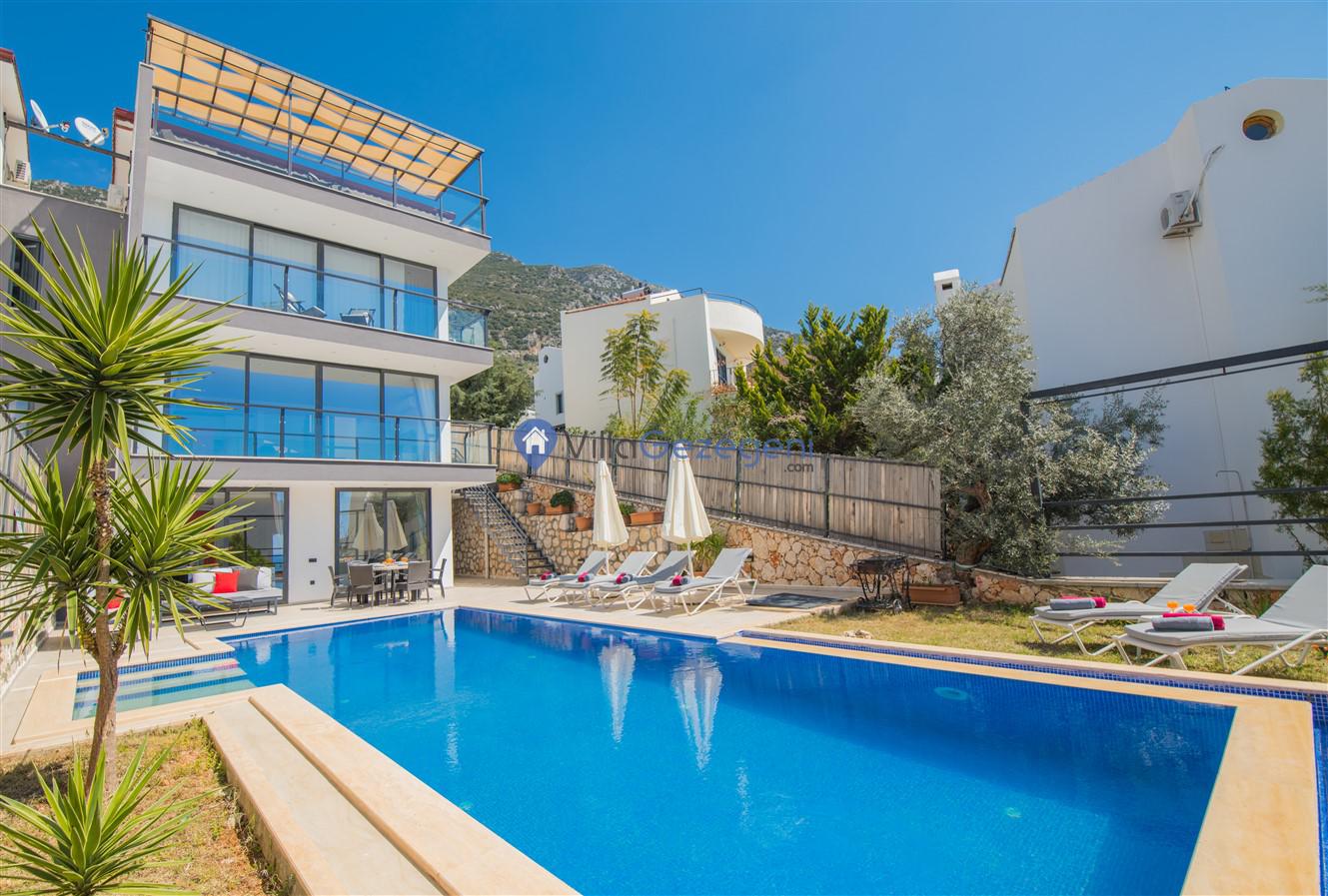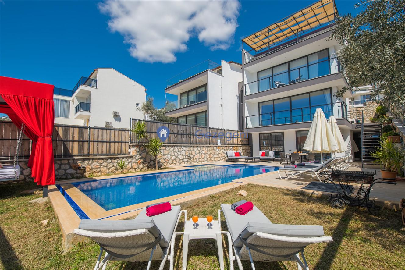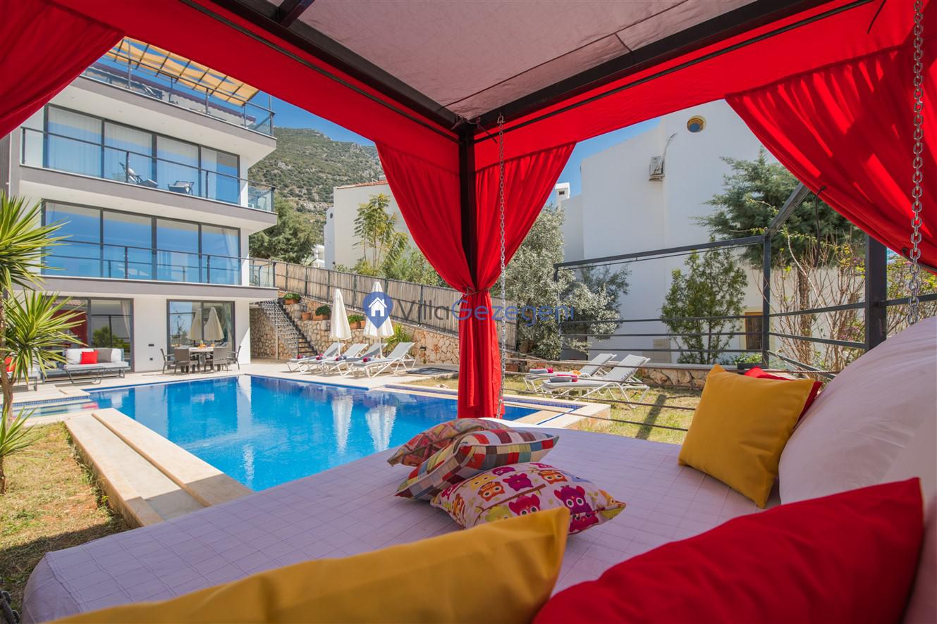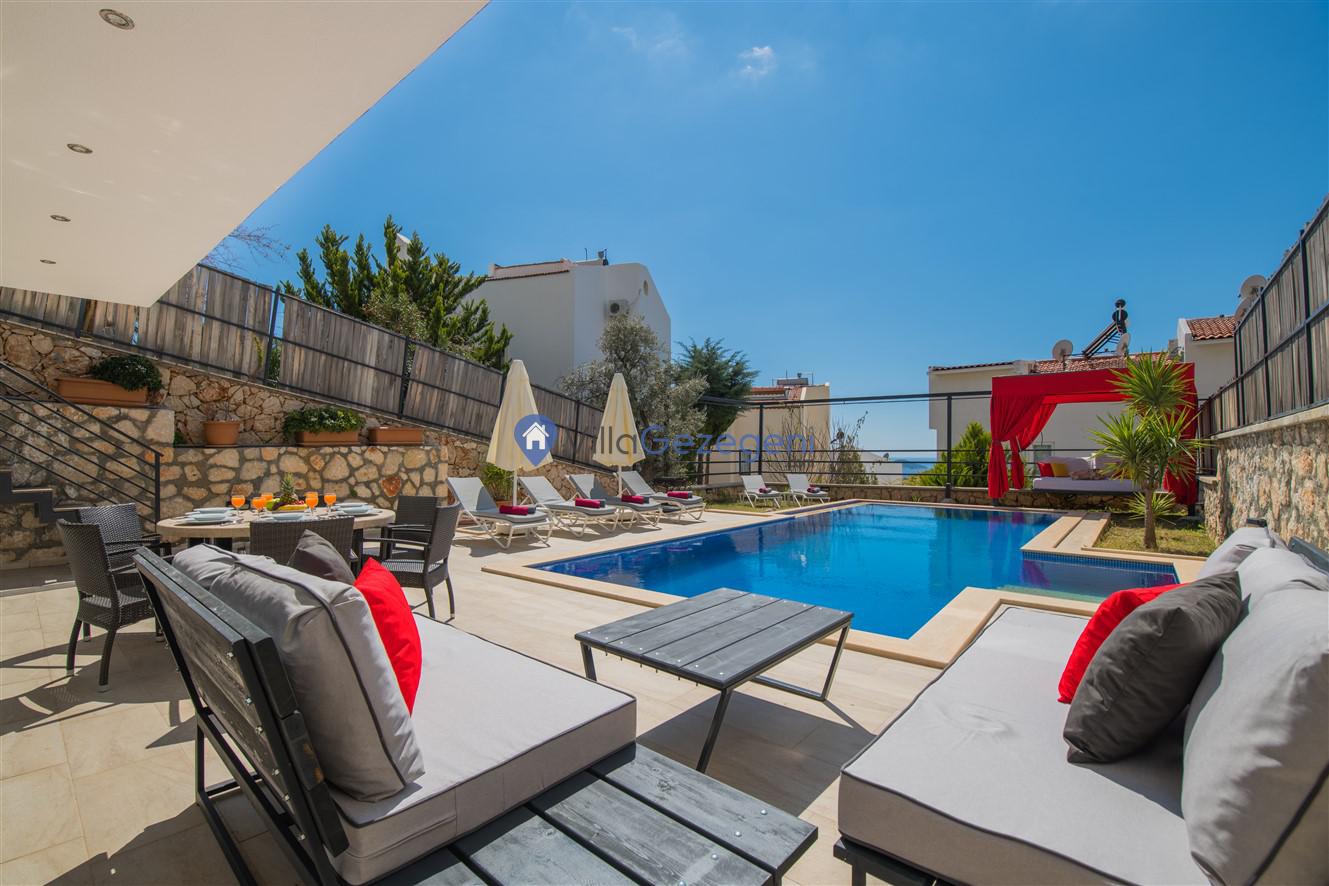 Kaş/Kalkan/Kızıltaş Bölgesinde yer alan 5 yatak odalı 10 kişi kapasiteli geniş aile ve arkadaş grupları için uygun deniz manzaralı tatil villasıdır.