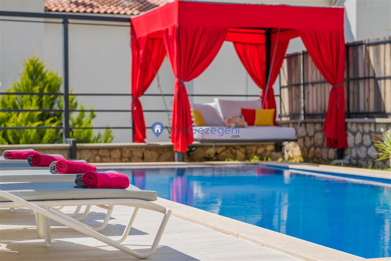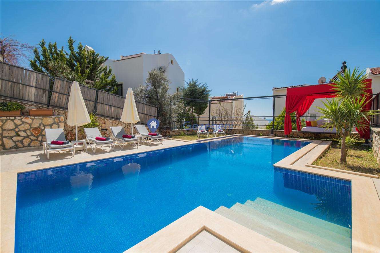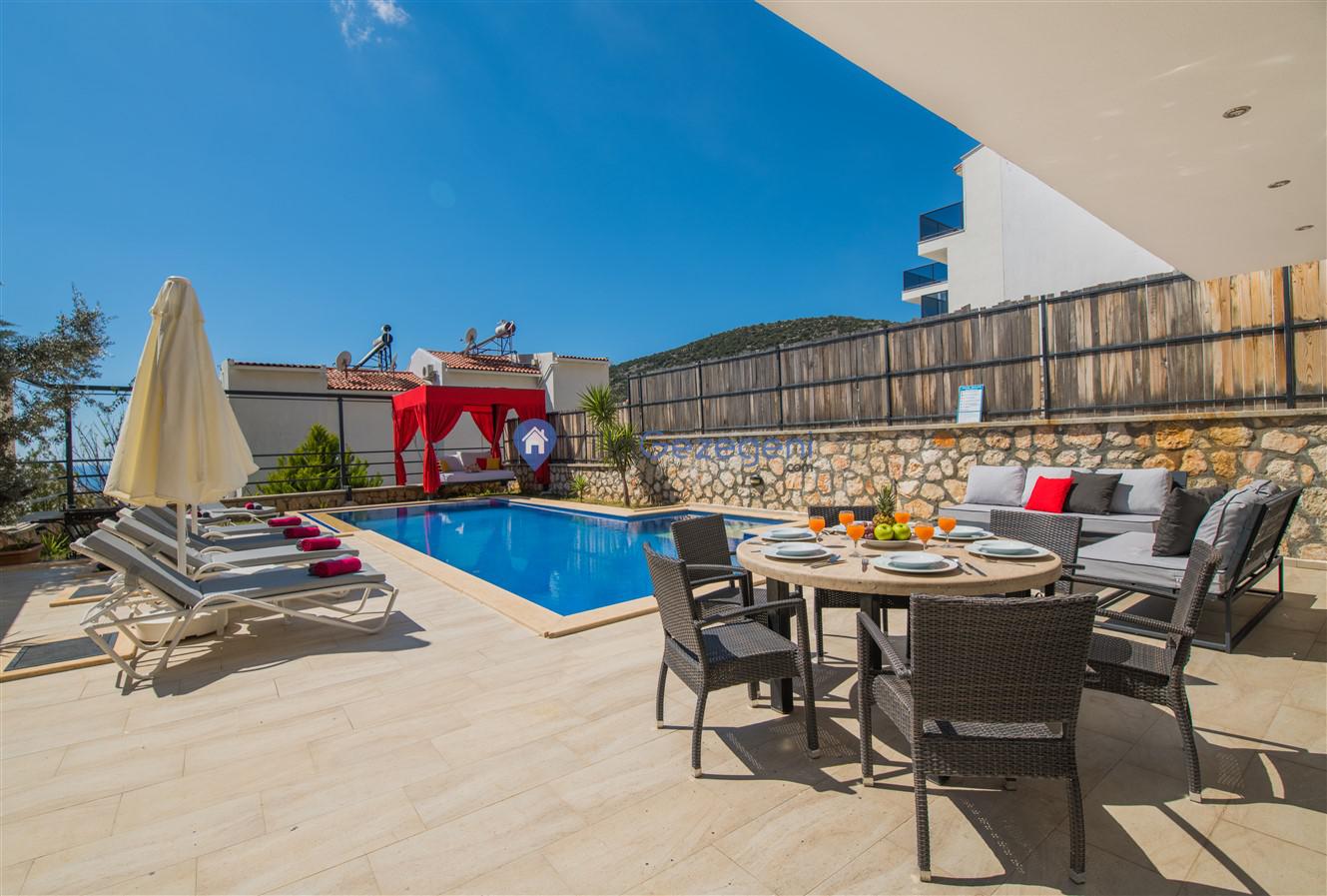 Kaş/Kalkan/Kızıltaş Bölgesinde yer alan 3 yatak odalı 6 kişi kapasiteli, lüks, deniz manzaralı, jakuzili,şehir merkezine yakın kiralık tatil villası.