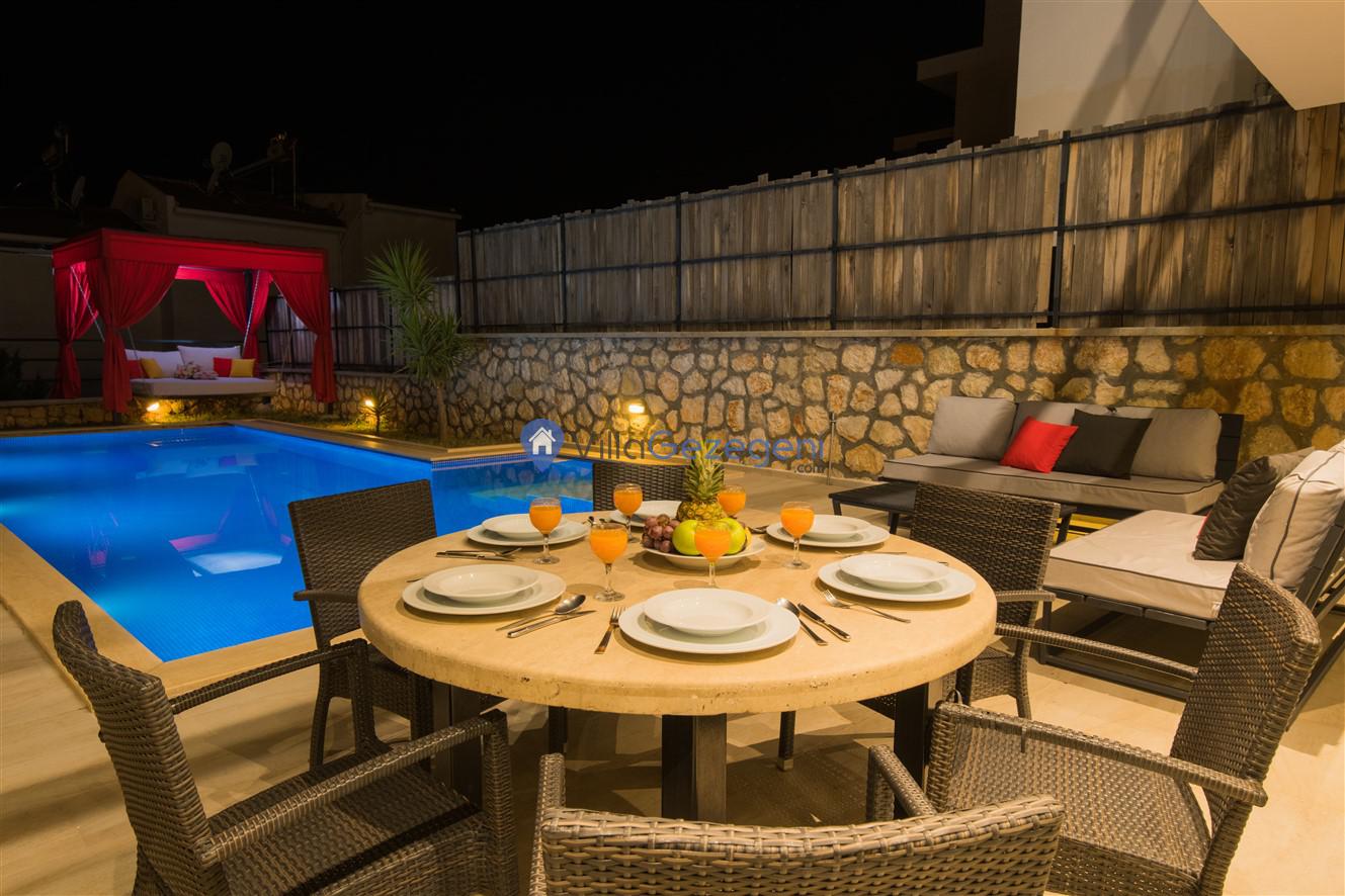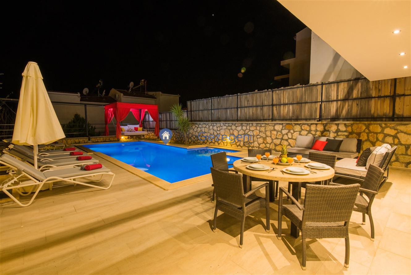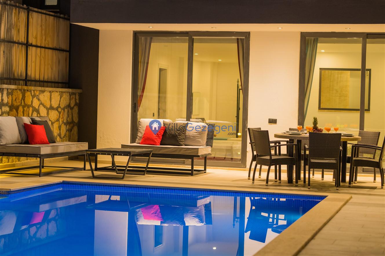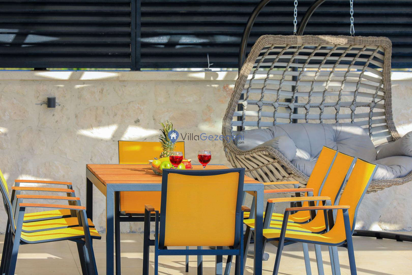 Şezlong, Güneş Şemsiyesi, Mangal, Yemek Masası ve bahçe mobilyaları kullanımınız için hazır bulunmaktadır. Gün batımına karşı unutulmaz bir tatilin kapılarını misafirlerine aralayan villamız modern örnekler arasında son dönemlerde geniş arkadaş grupları veya aileler tarafından her yaz dönemi yoğun olarak rağbet görmeye devam etmektedir.