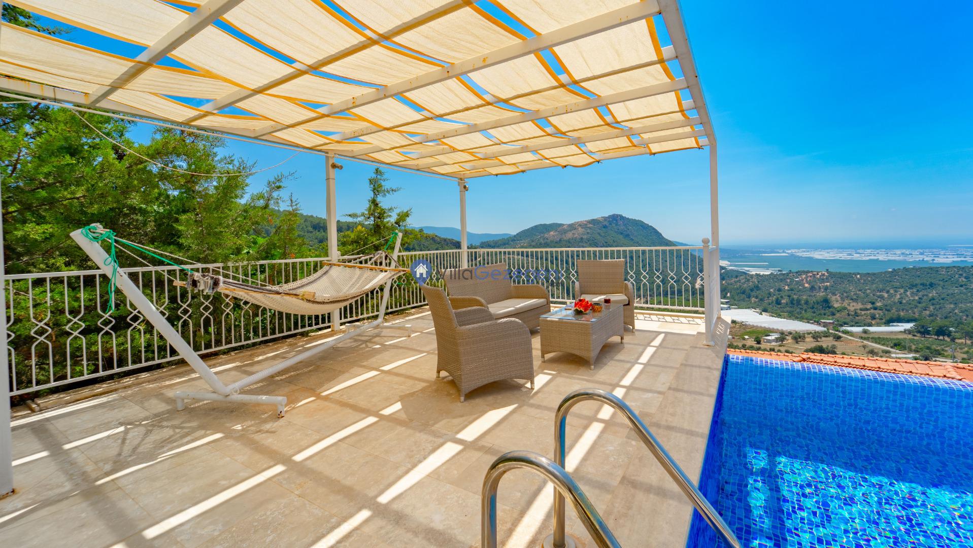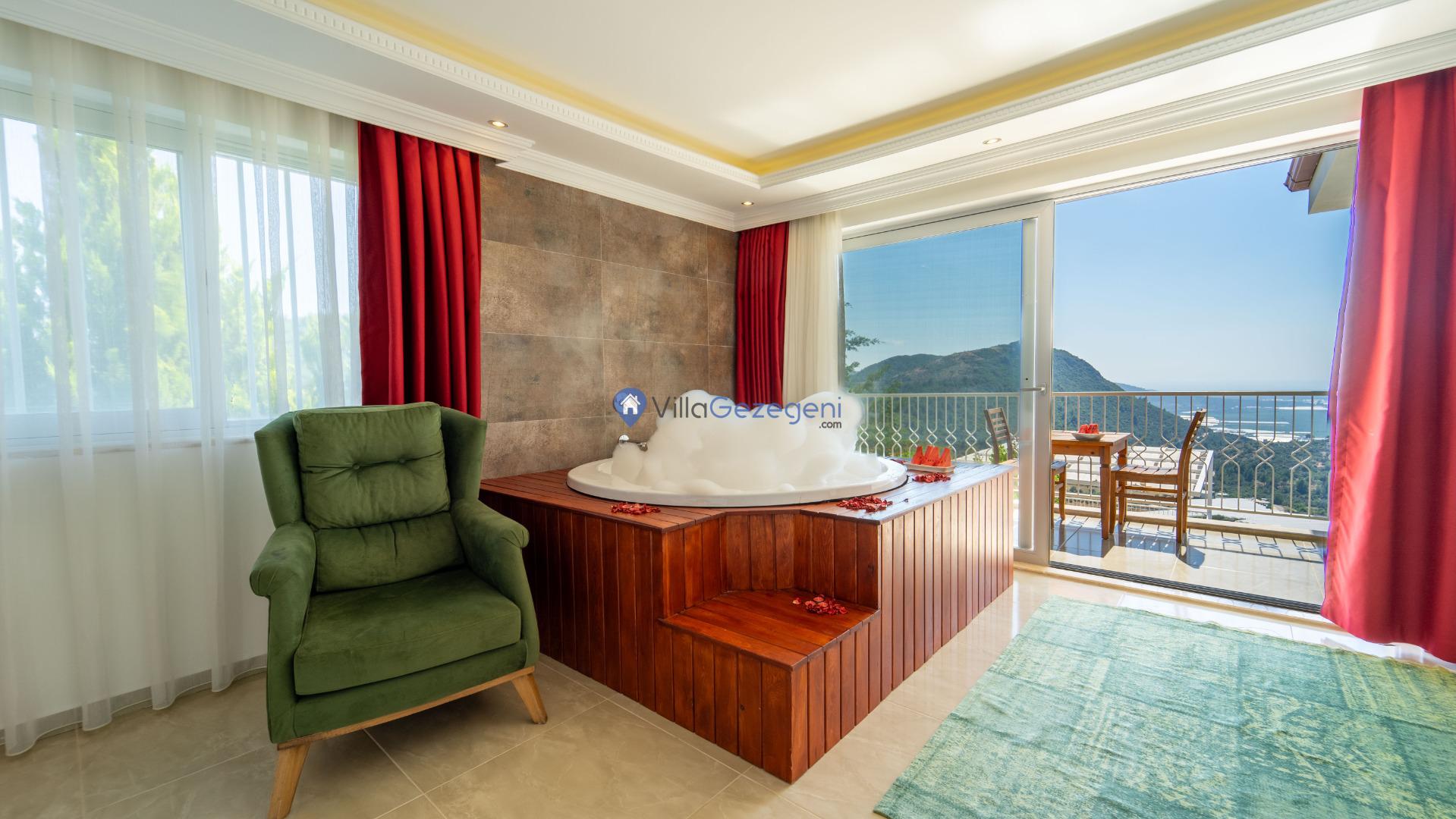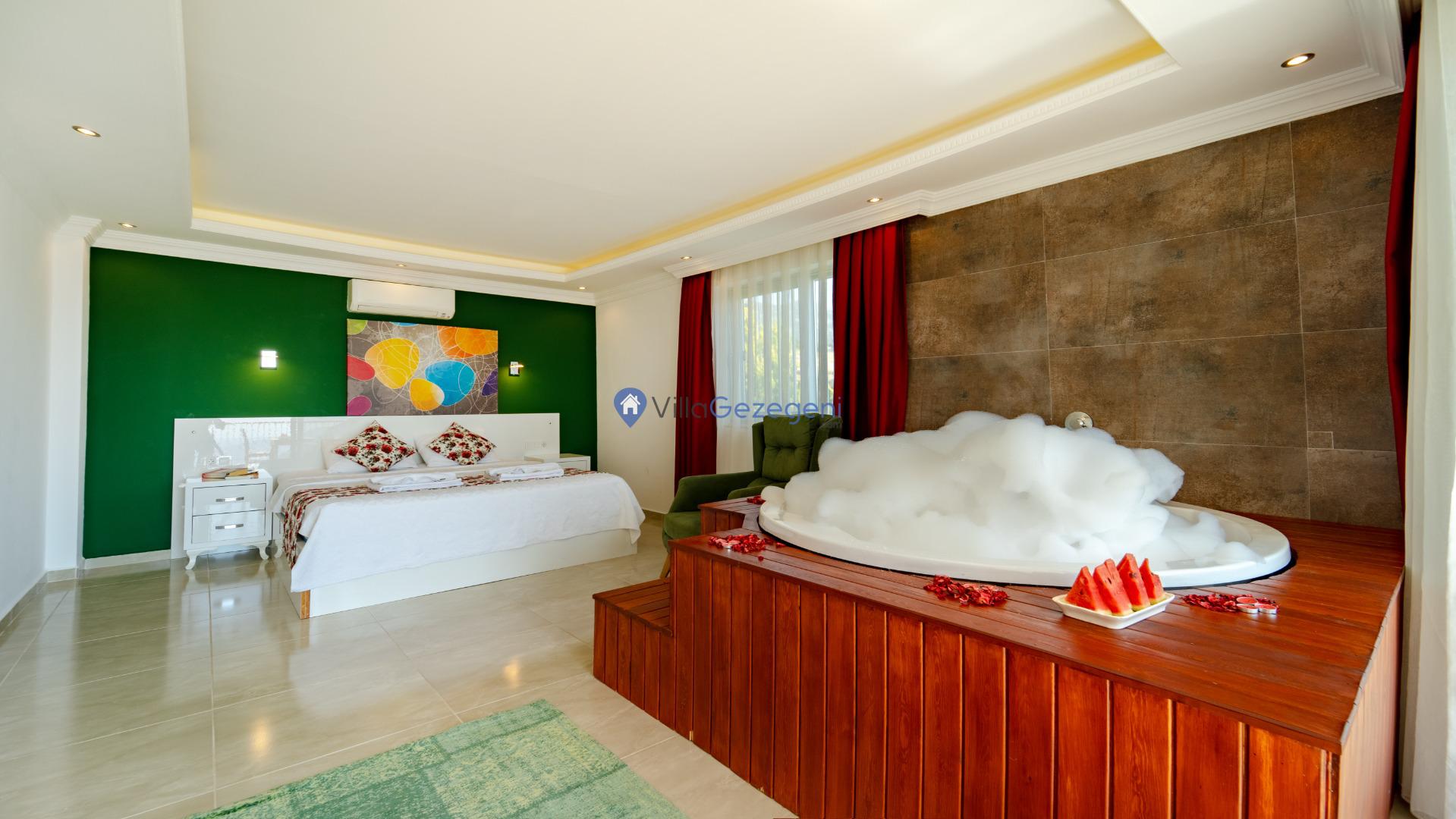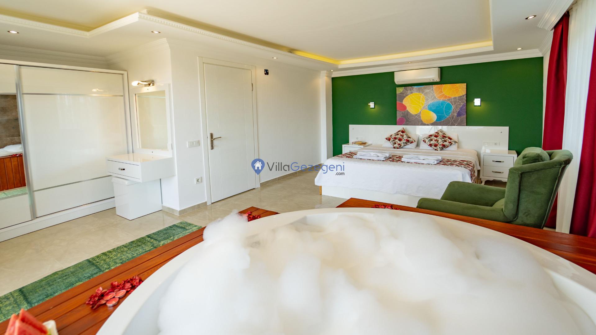 Villa Sevi, tek yatak odalı, markete ve restauranta yakın, havuzu korunaklı, jakuzili, doğa içerisinde muhafazakar kiralık balayı villası.