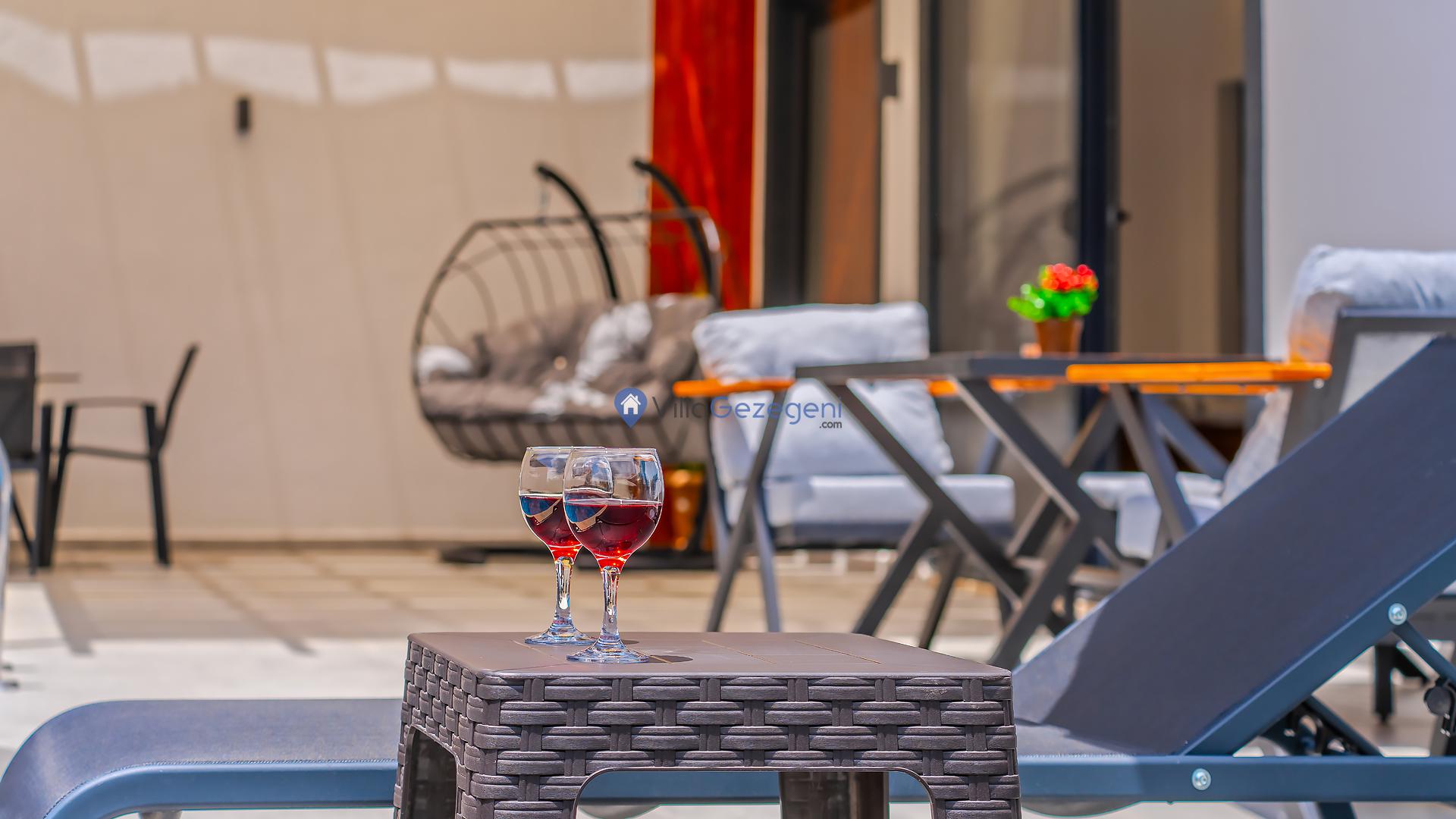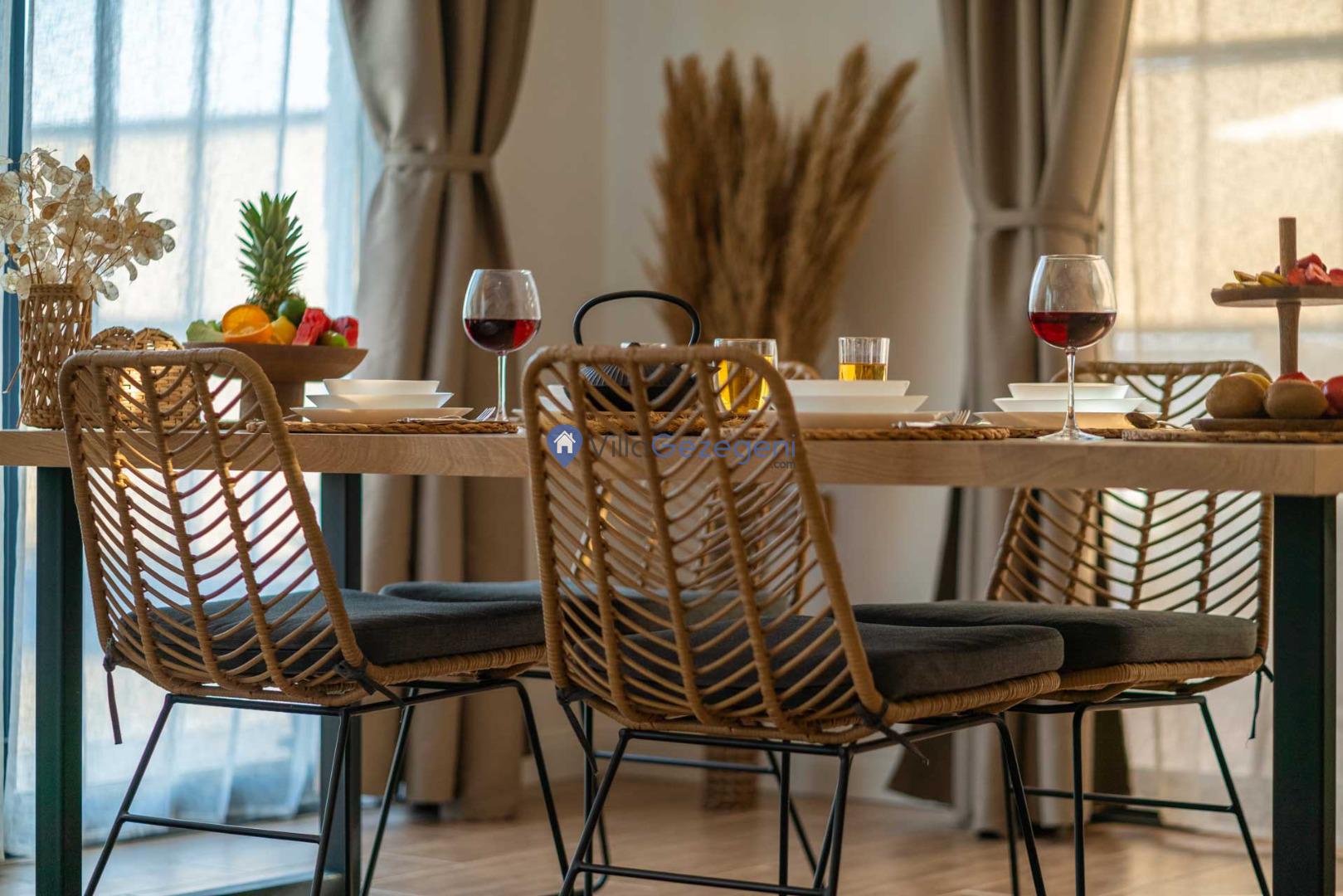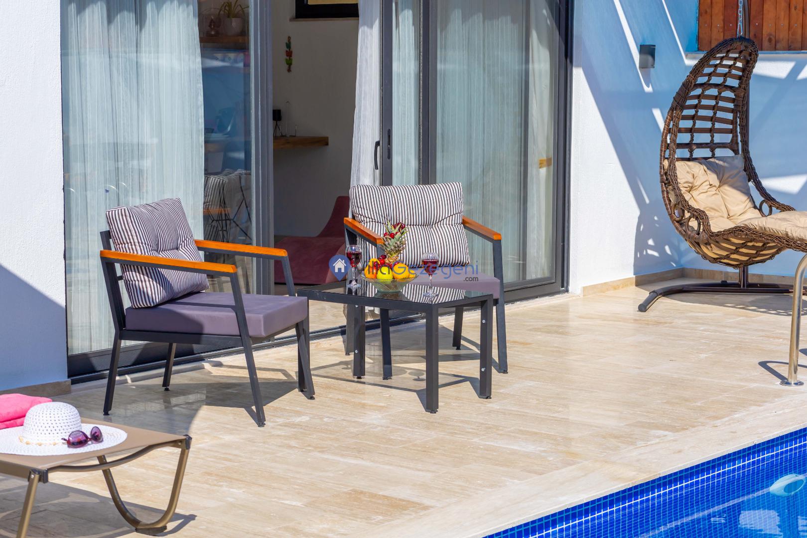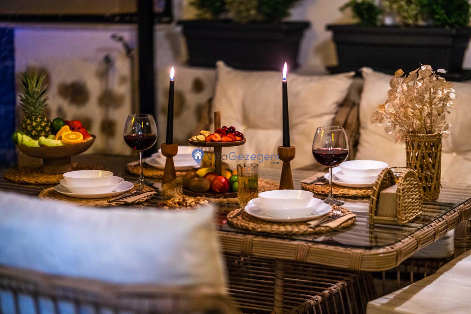 Yemek Masası ve bahçe mobilyaları kullanımınız için hazır bulunmaktadır sevdikleriniz ile beraber yemekler yiyip sohbetin dibine vurabilirsiniz. Villanın bahçesindeki salıncak ile keyifli vakitler geçirebilirsiniz.