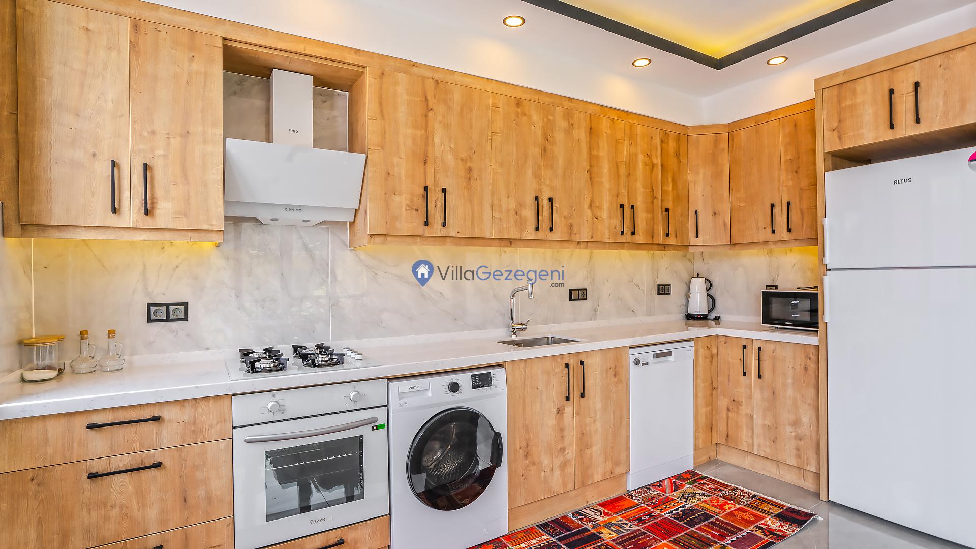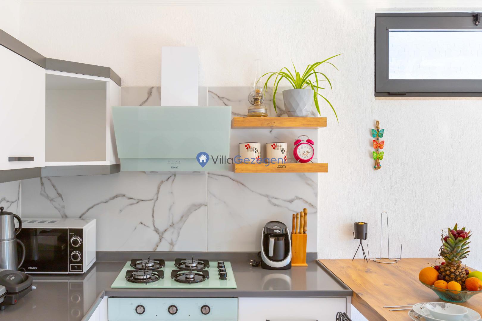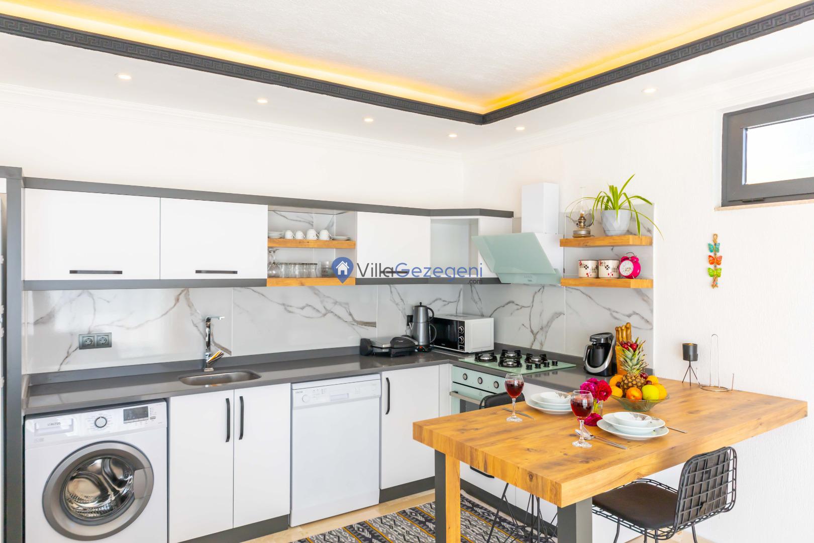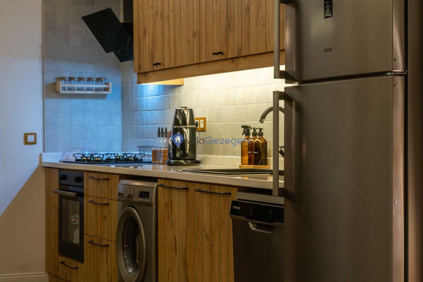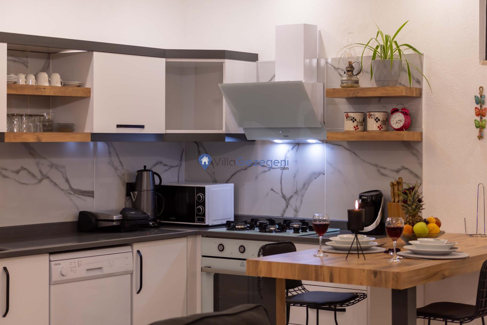 Villamız günlük hayatta sık kullanılan; Mikrodalga fırın, ankastre fırın, buzdolabı, çamaşır makinası, bulaşık makinesi, elektrikli su ısıtıcı kettle, ankastre 4’lü ocak, 2 kişilik yemek takımı, kaşık ve çatal takımı, tencere ve tava takımı, bardaklar yer almaktadır. İhtiyacınız durumunda villamızda bulunmayan malzemeler hakkında bizle iletişime geçebilir ve yardım isteyebilirsiniz.