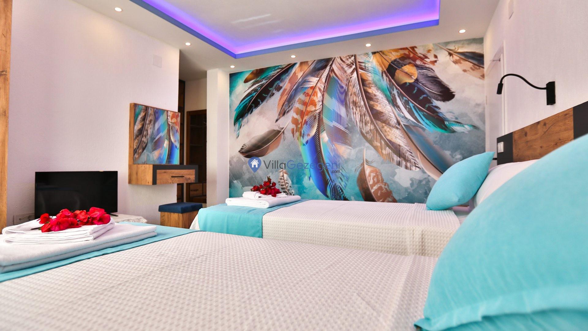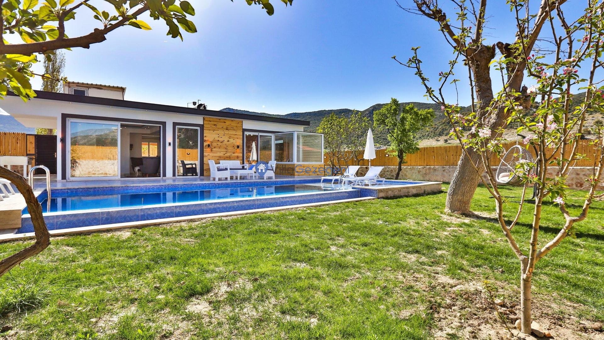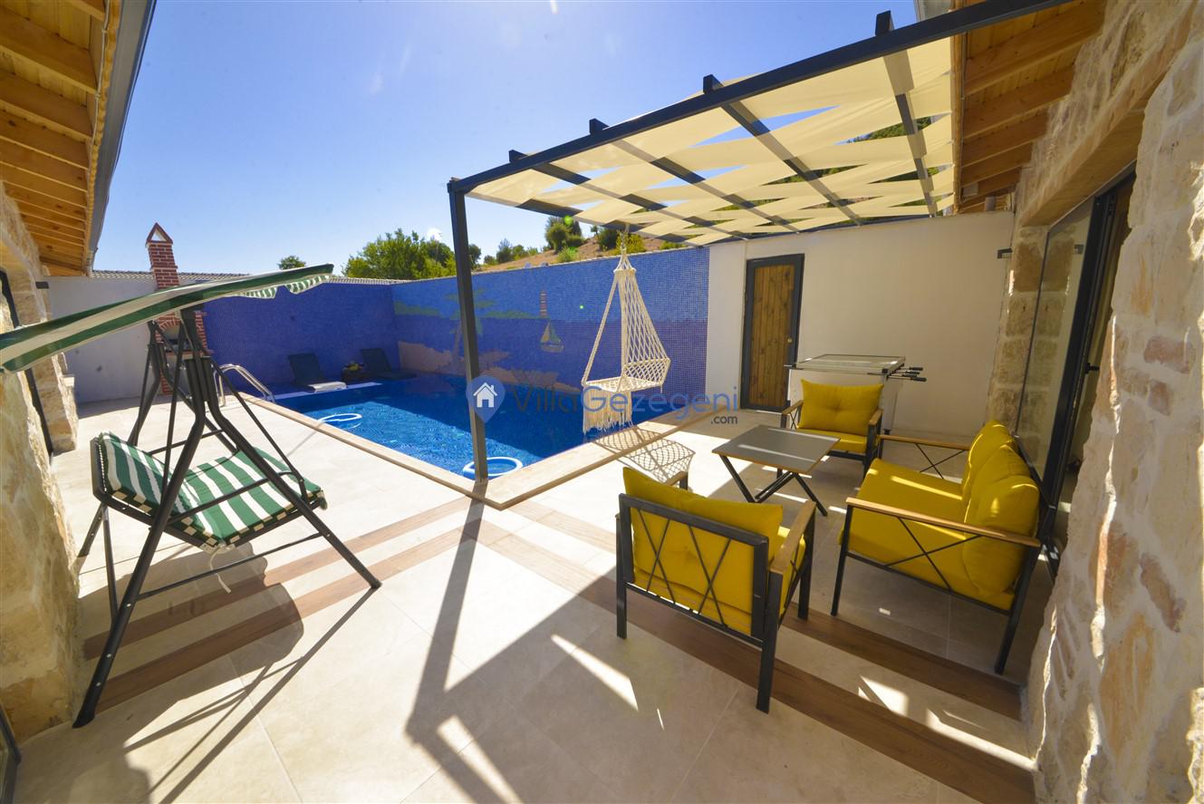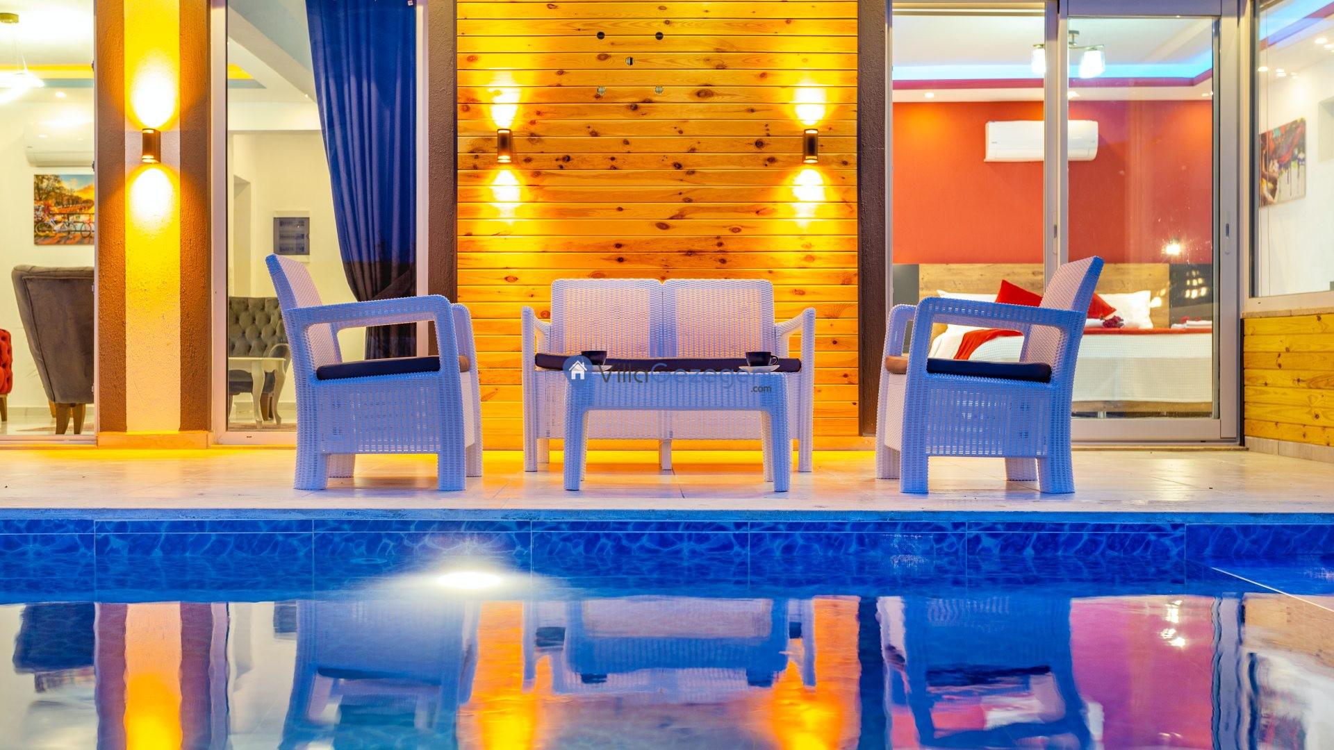 Villamızın genel konsept ve özelliklerinden tekrar bahsedecek olursak; villamızın 1 adet müstakil özel havuzu bulunmaktadır. Ortalama bir bahçeye sahip olan villamız rahatlığı ön planda tutan 2 adet yatak odası,3 yatak,2 banyo, hareket alanı geniş bir mutfak ve 4 kişinin geniş aralıklarla rahatlıkla oturabileceği koltuklara sahip salonu bulunmaktadır.