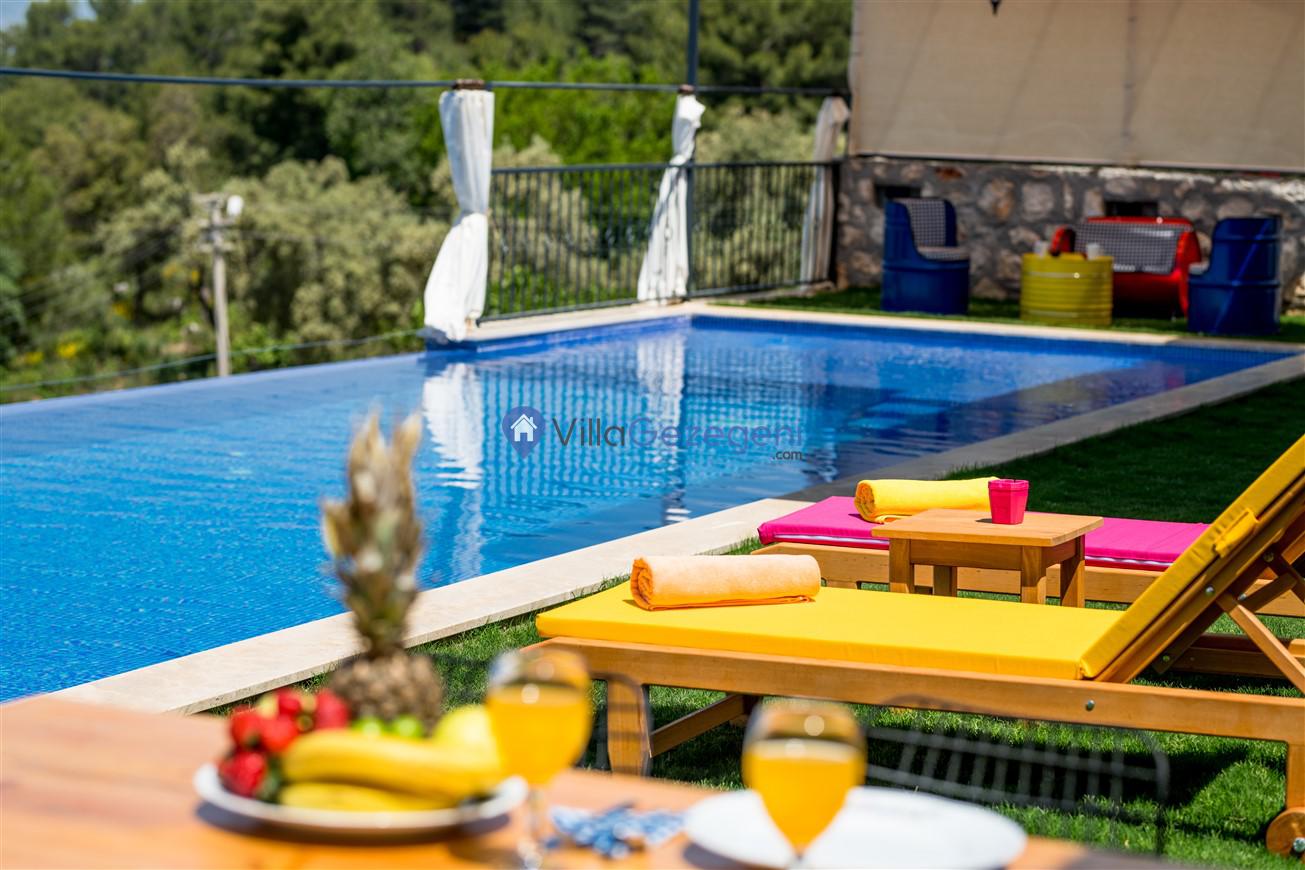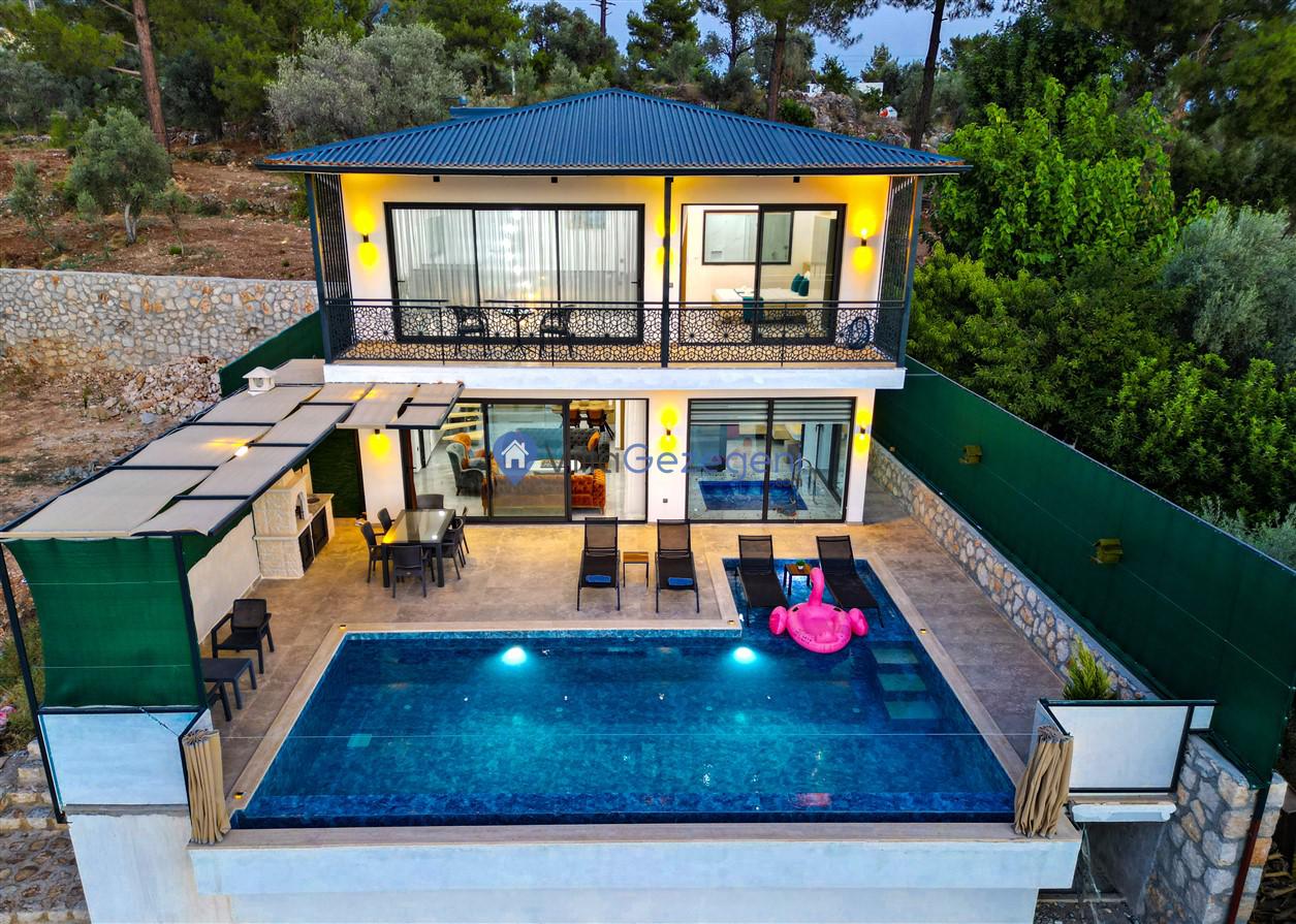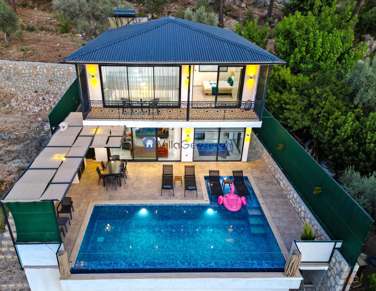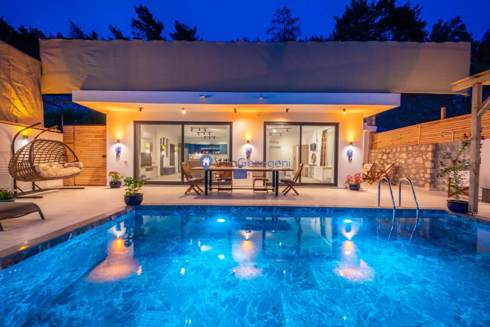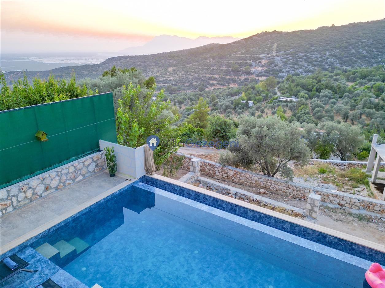 Kalkan Üzümlü bölgesinde yer alan tek yatak odalı 2 kişilik havuzu korunaklı,doğa içerisinde muhafazakar kiralık aile ve balayı villası.