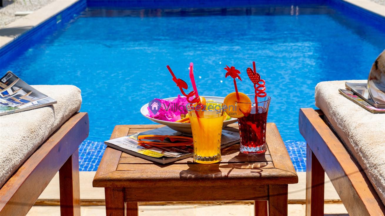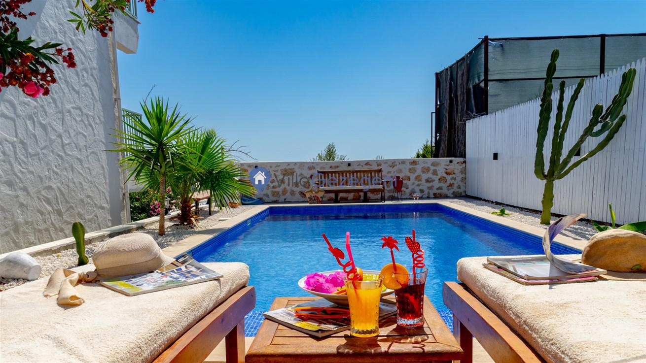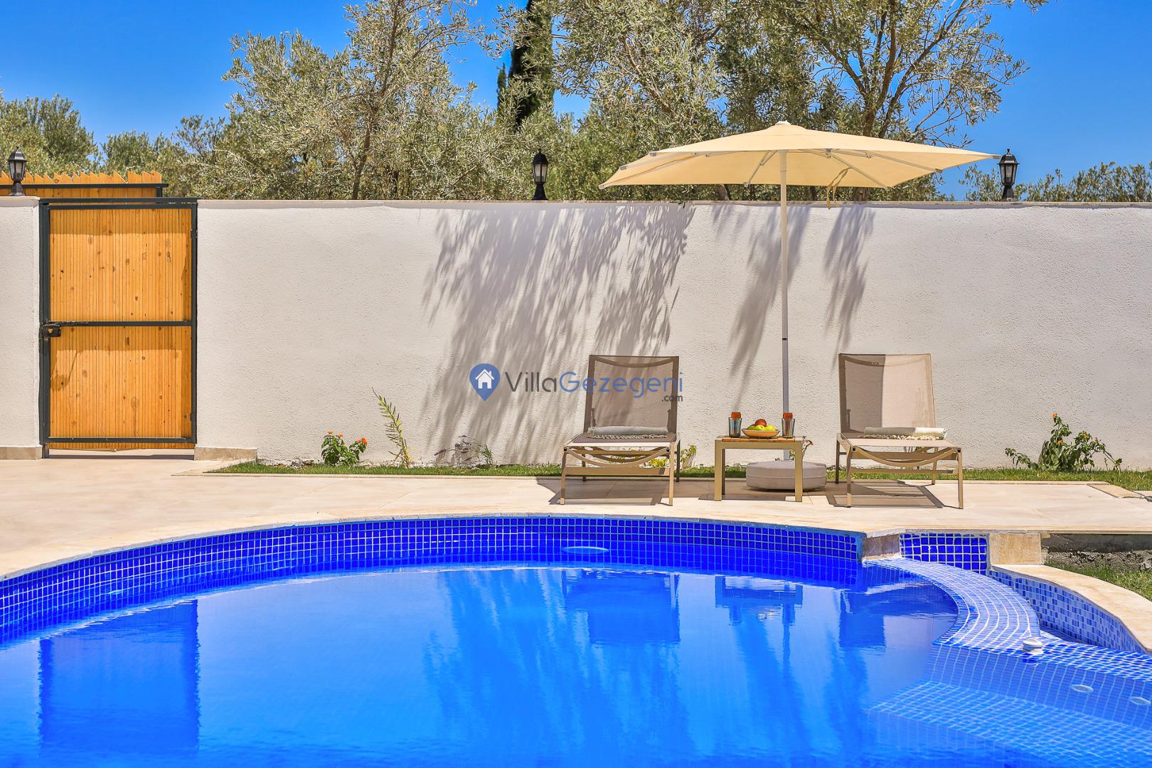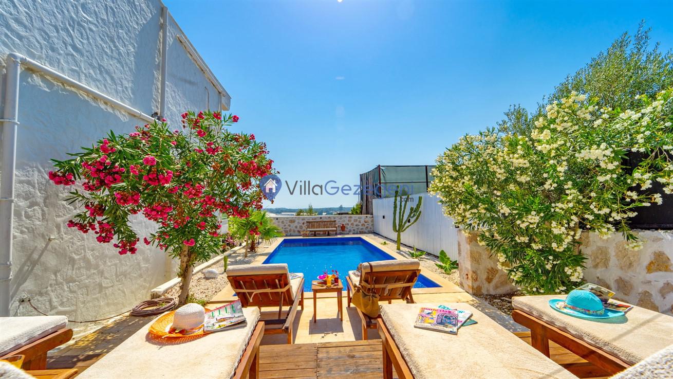 Villamızın genel konsept ve özelliklerinden tekrar bahsedecek olursak; villamızın 1 adet müstakil özel havuzu bulunmaktadır. Ortalama bir bahçeye sahip olan villamız rahatlığı ön planda tutan 1 adet yatak odası, 1 yatak, 1 banyo, hareket alanı geniş bir mutfak ve 2 kişinin geniş aralıklarla rahatlıkla oturabileceği koltuklara sahip salonu bulunmaktadır.