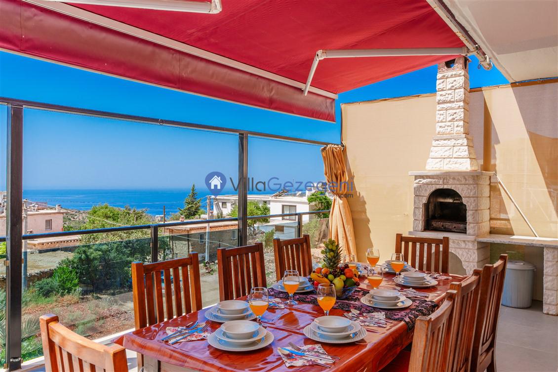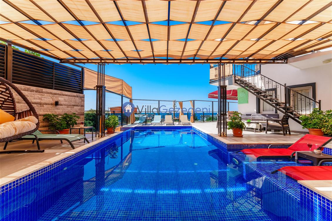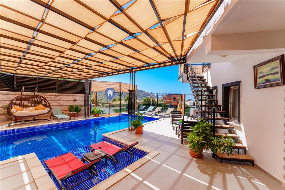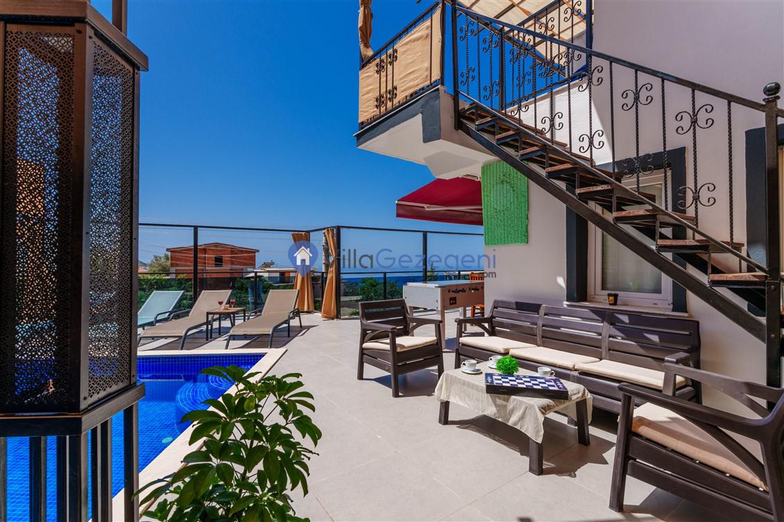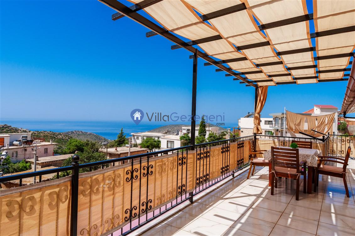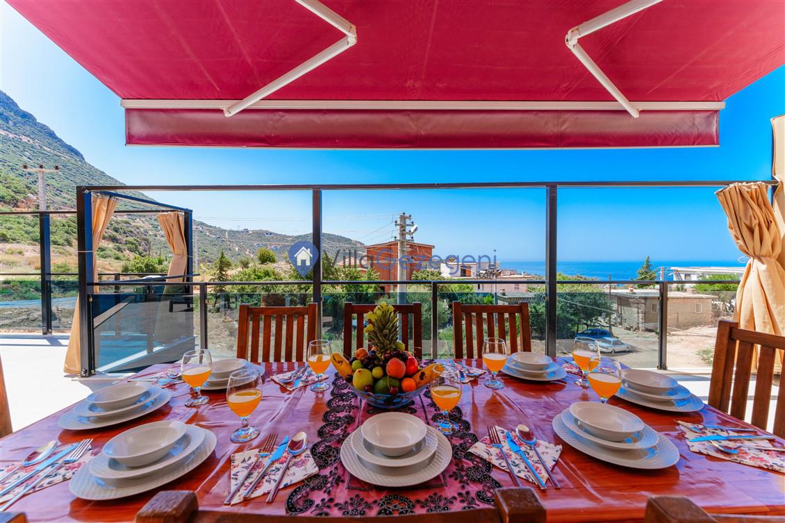 Kalkan Kördere Bölgesinde yer alan 4 yatak odalı 8 kişi kapasiteli deniz manzaralı, geniş aile ve akadaş grupları için uygun Kiralık Tatil Villası.