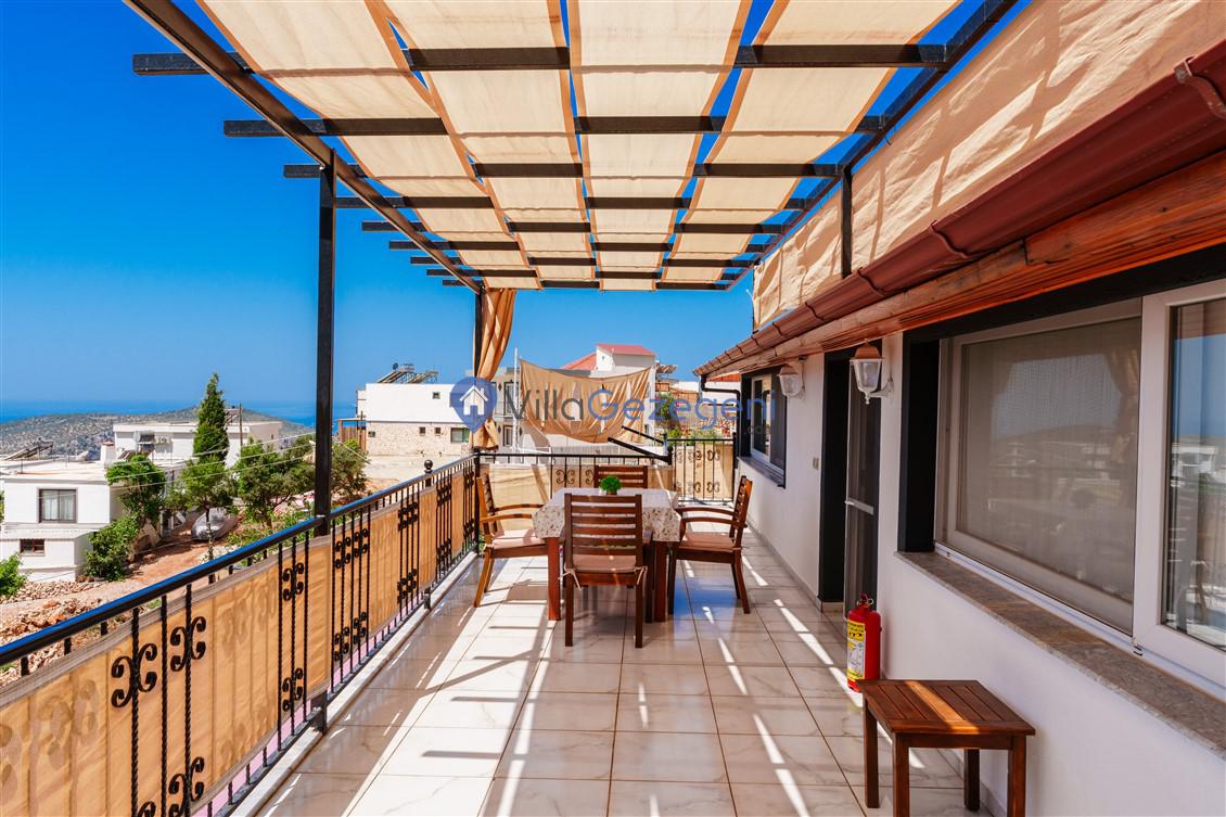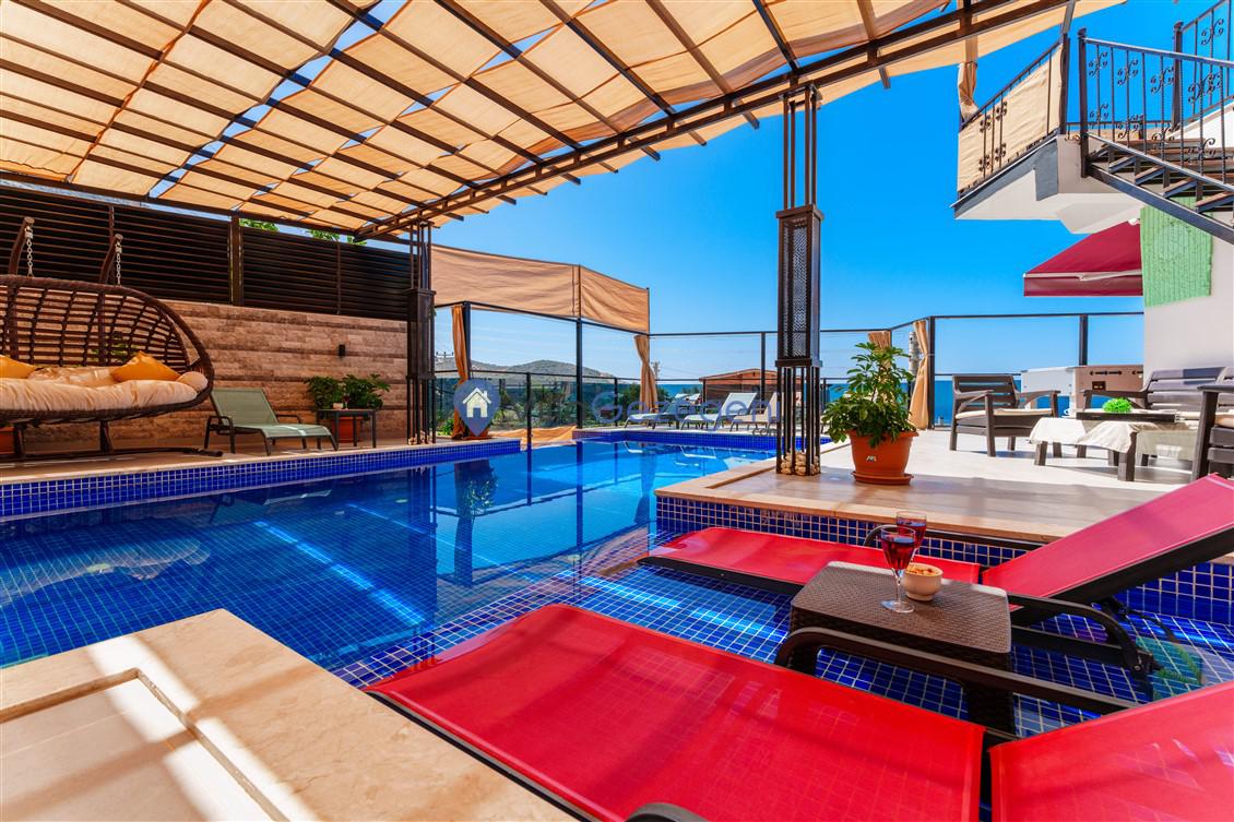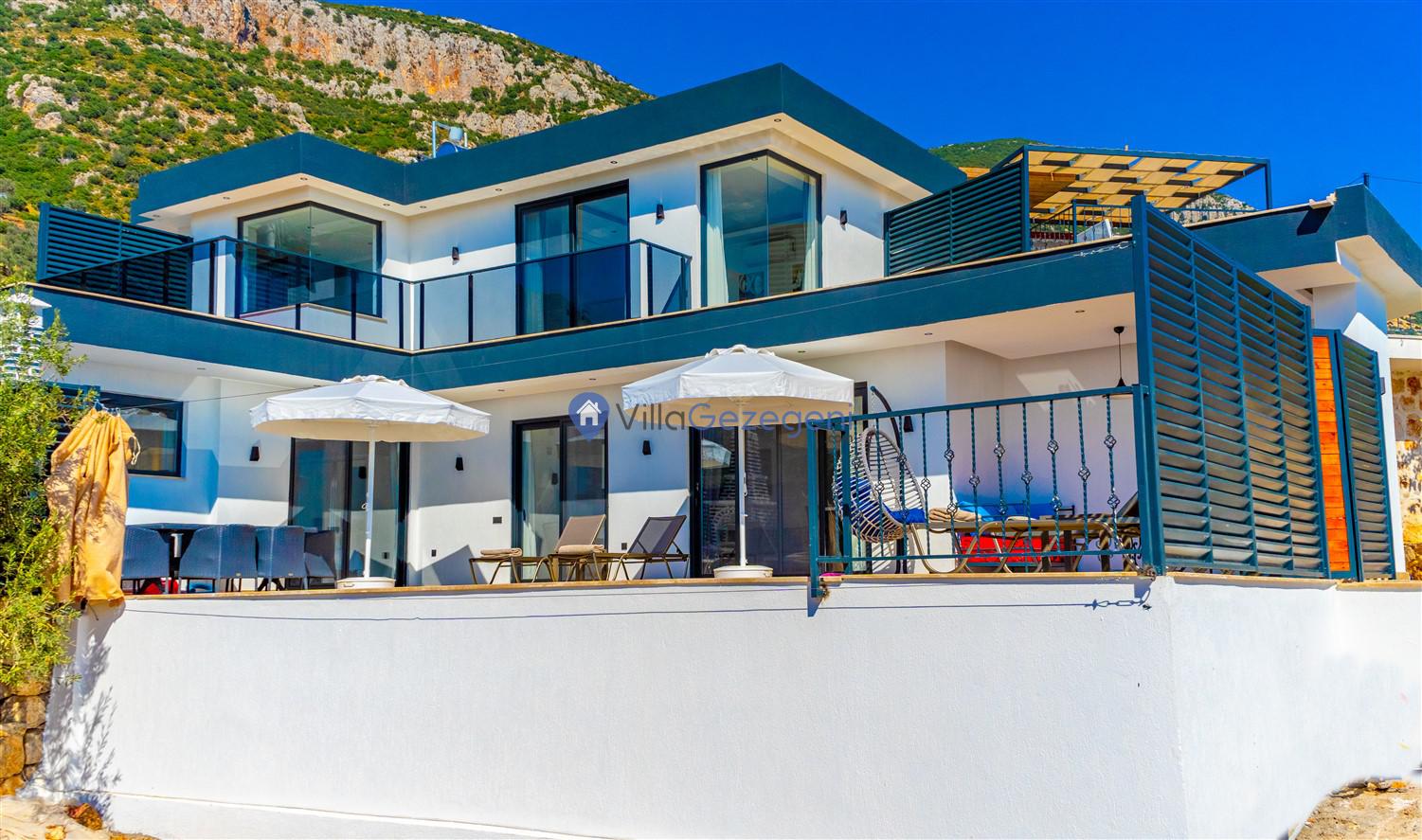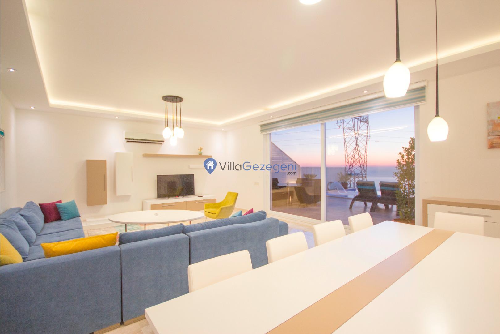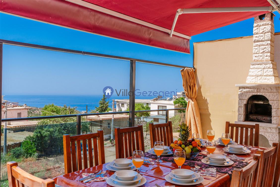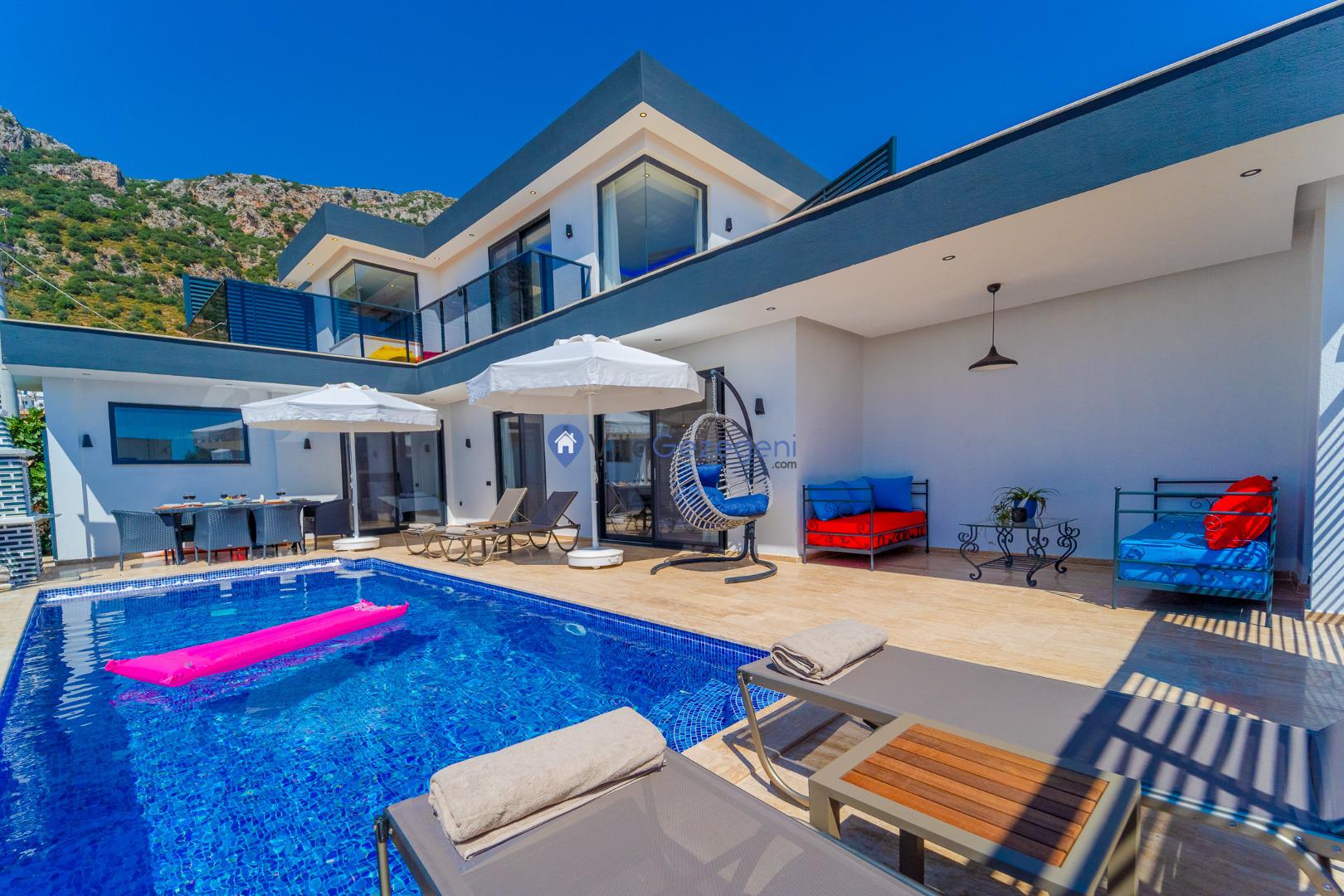 Kalkan Kördere Bölgesinde yer alan 4 yatak odalı 8 kişi kapasiteli deniz manzaralı, geniş aile ve akadaş grupları için uygun Kiralık Tatil Villası.