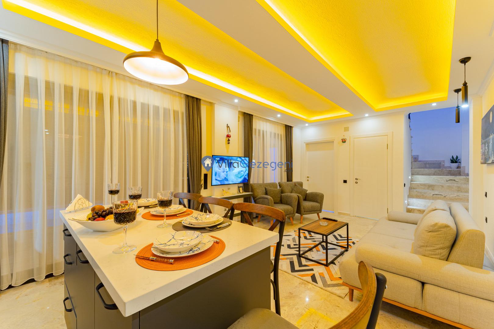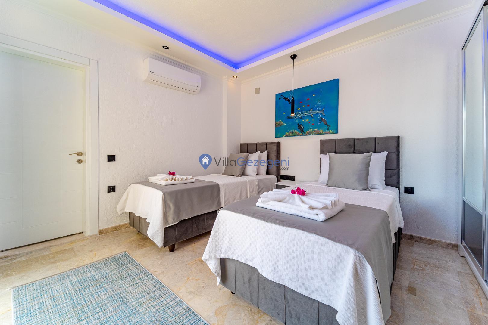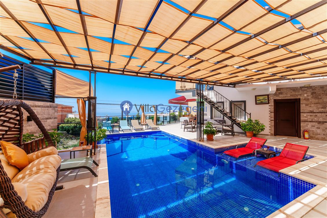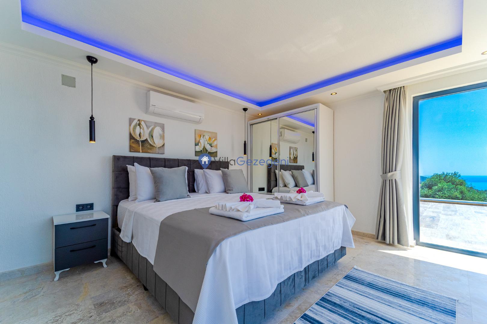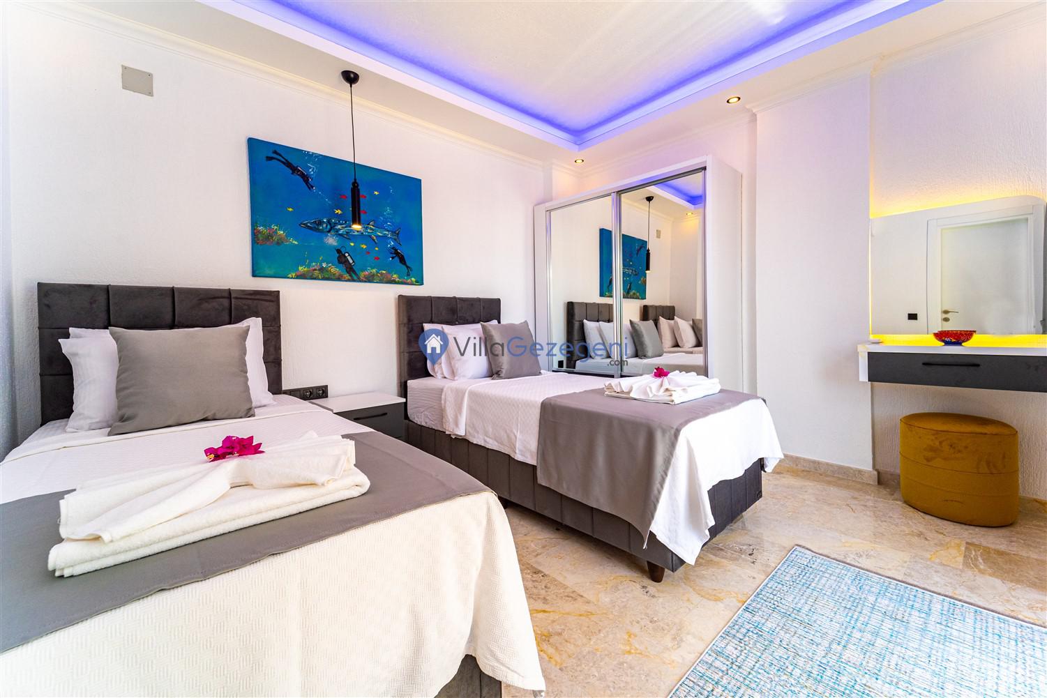 Kalkan Kördere Bölgesinde yer alan 4 yatak odalı 8 kişi kapasiteli deniz manzaralı, geniş aile ve akadaş grupları için uygun Kiralık Tatil Villası.