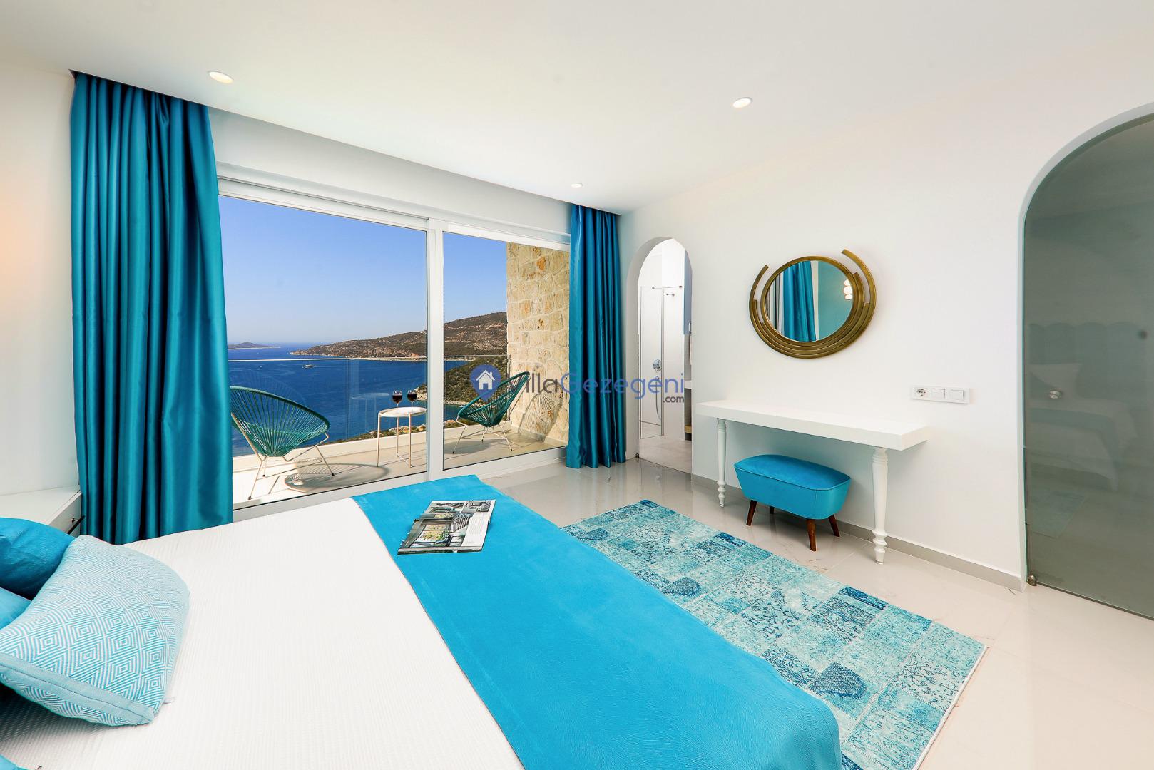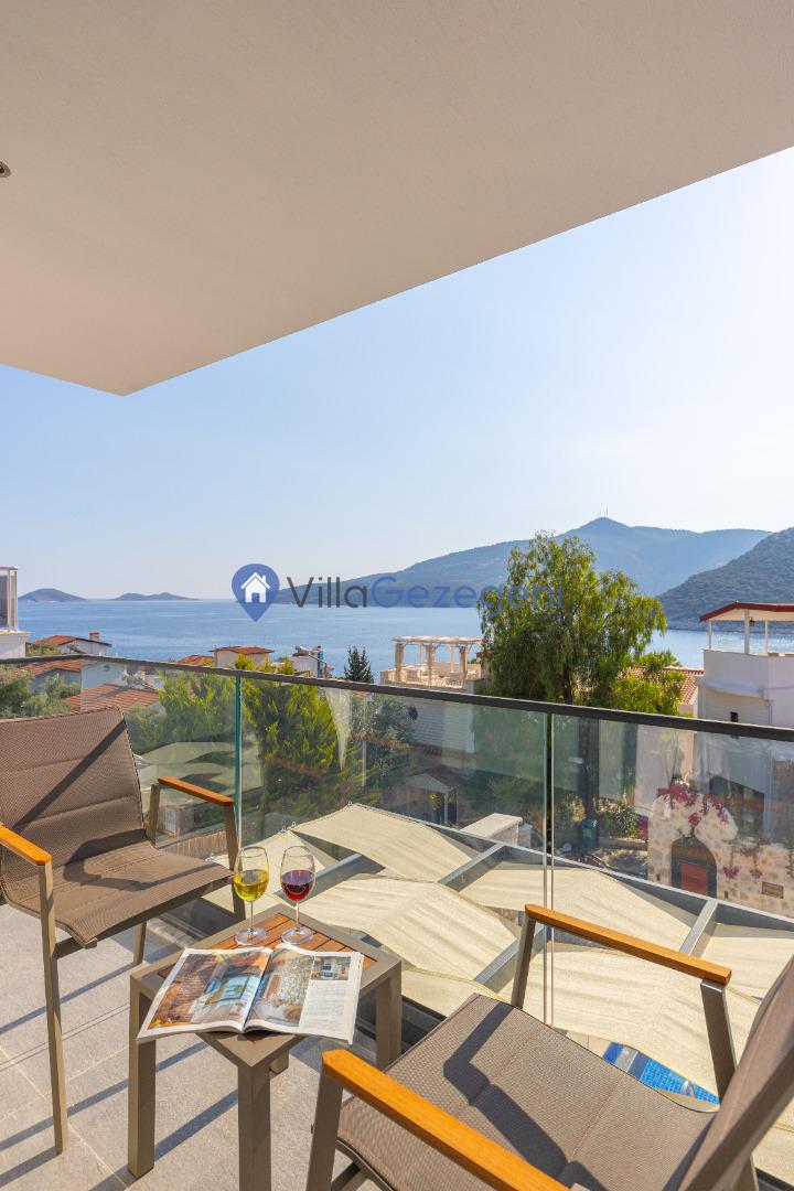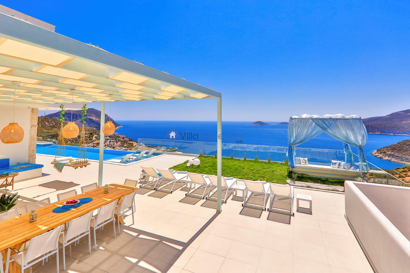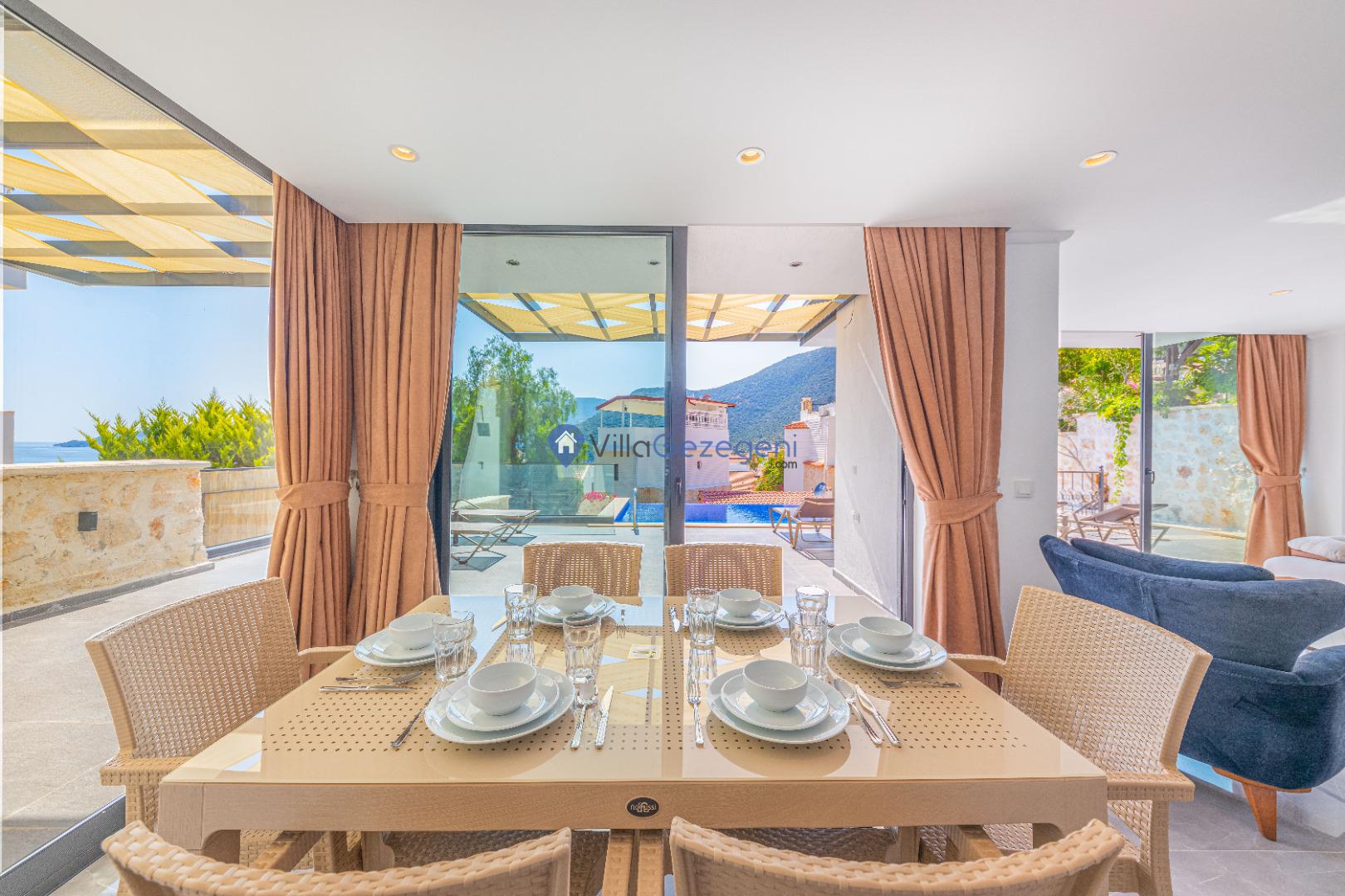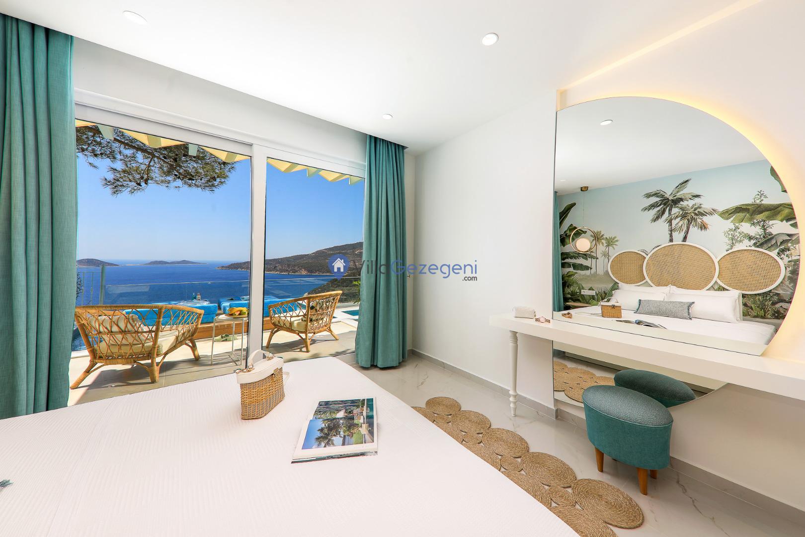 Kalkan Kalamar Mevkiinde yer alan 5 yatak odalı 10 kişi kapasiteli deniz manzaralı geniş aile ve arkadaş grupları için uygun kiralık tatil villası.