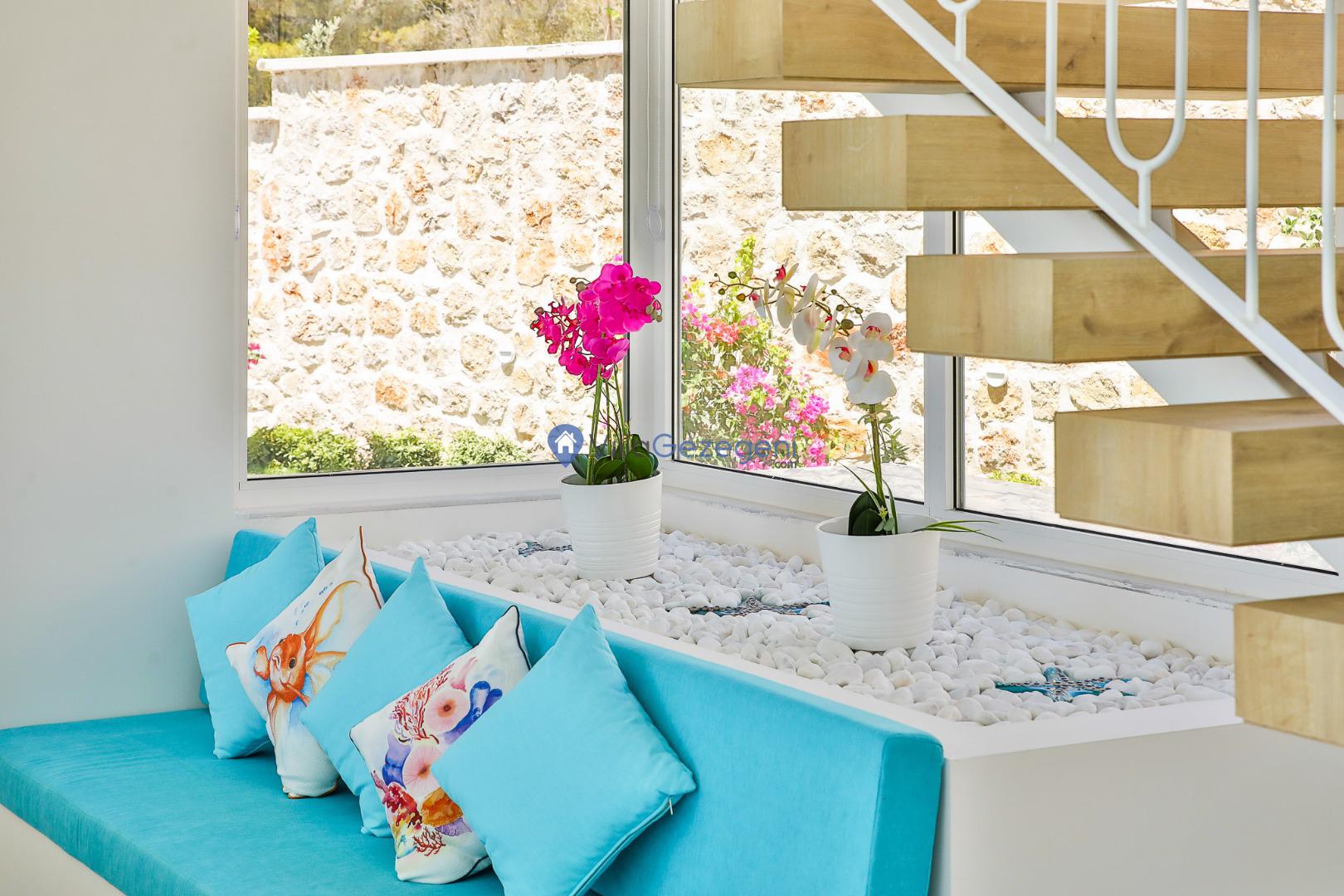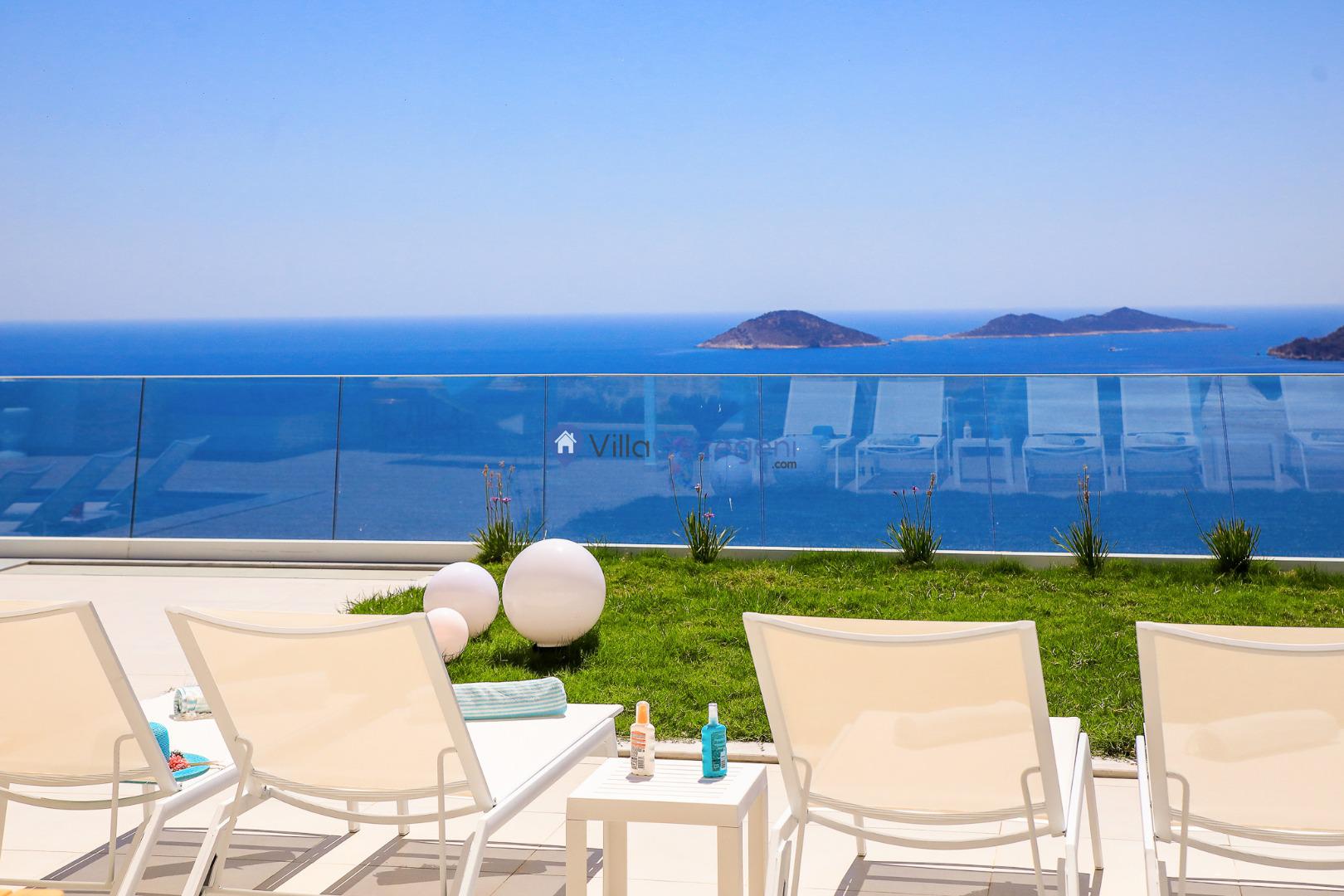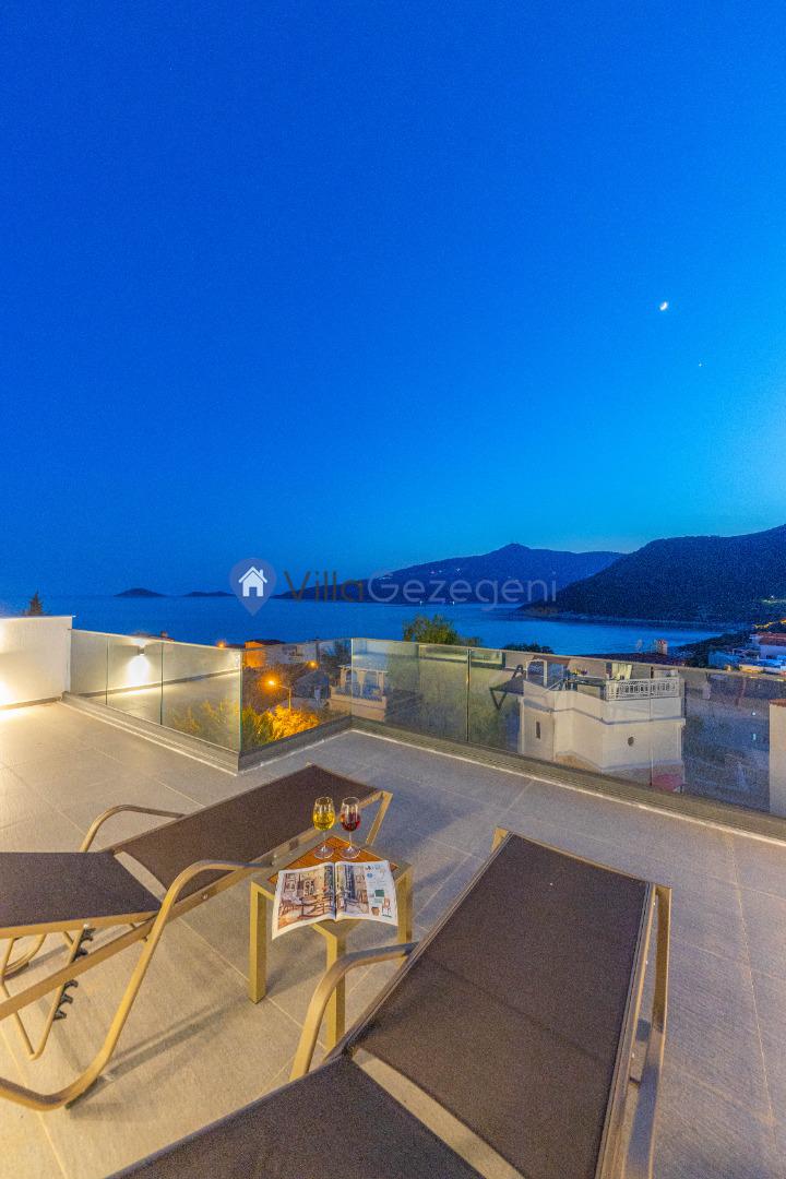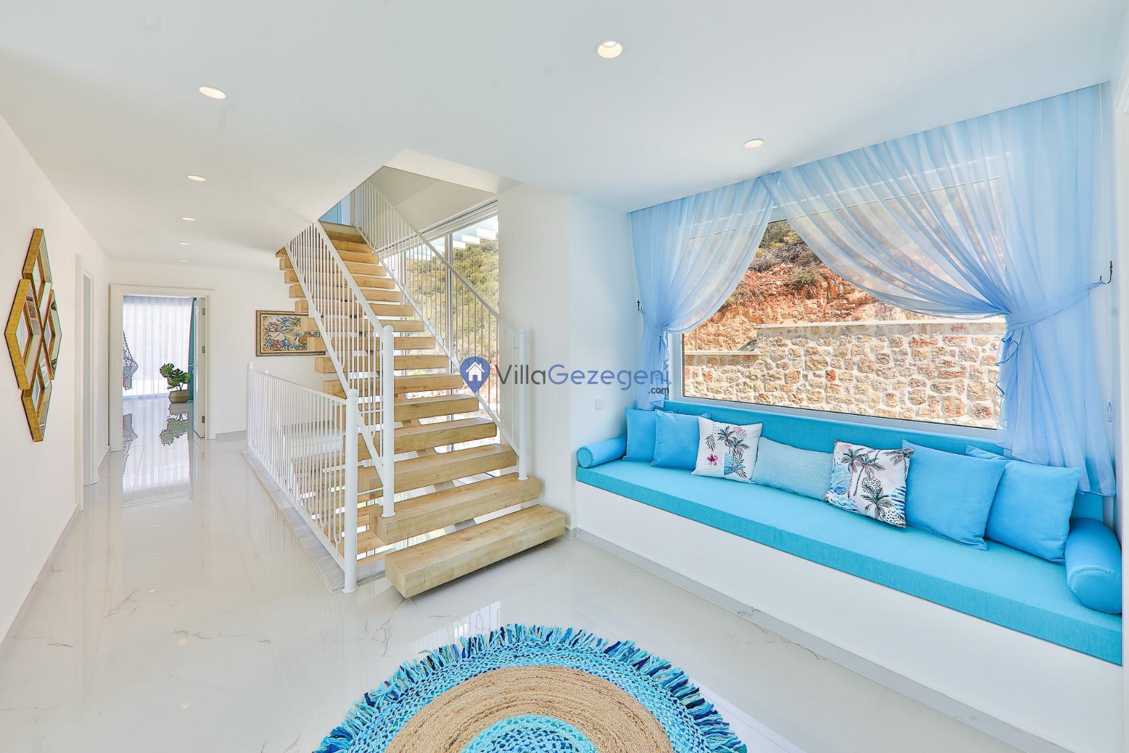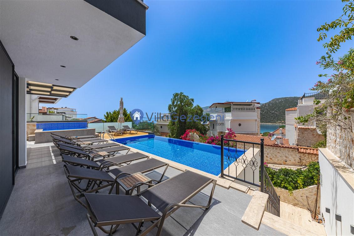 Kalkan Kalamar Mevkiinde yer alan 5 yatak odalı 10 kişi kapasiteli deniz manzaralı geniş aile ve arkadaş grupları için uygun kiralık tatil villası.