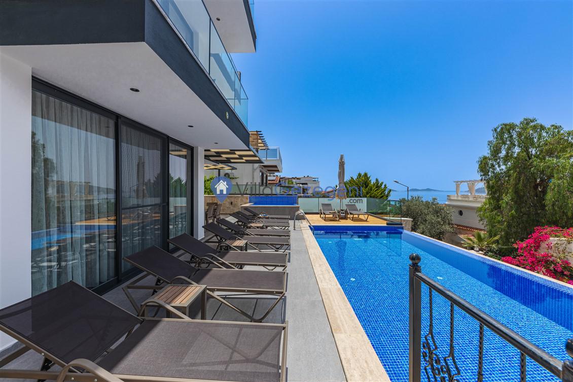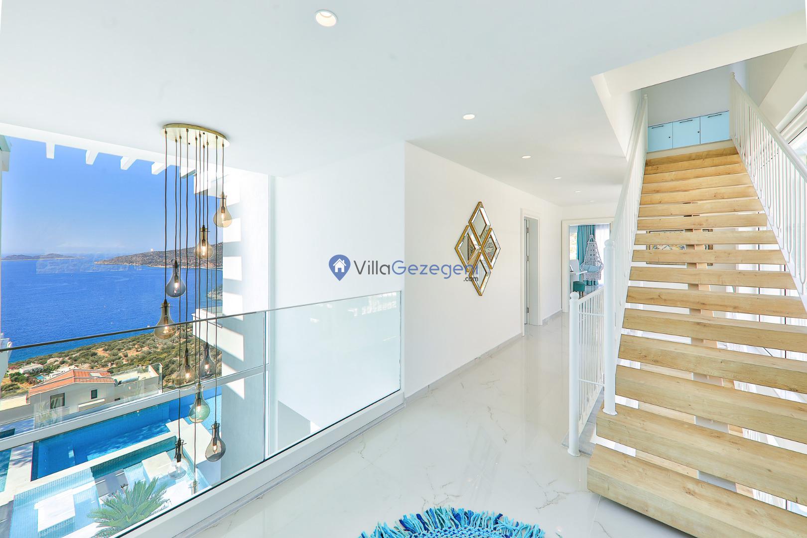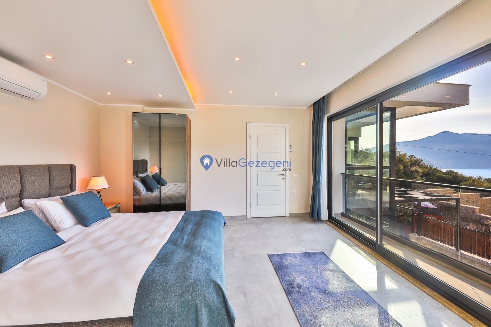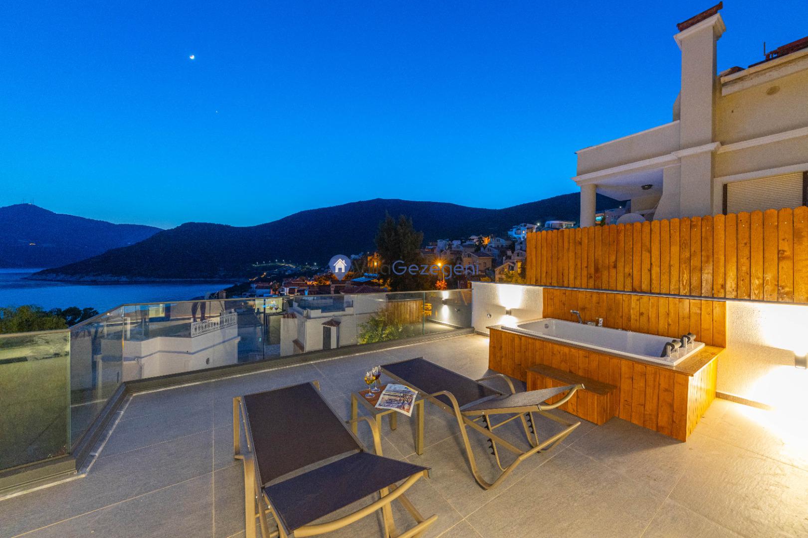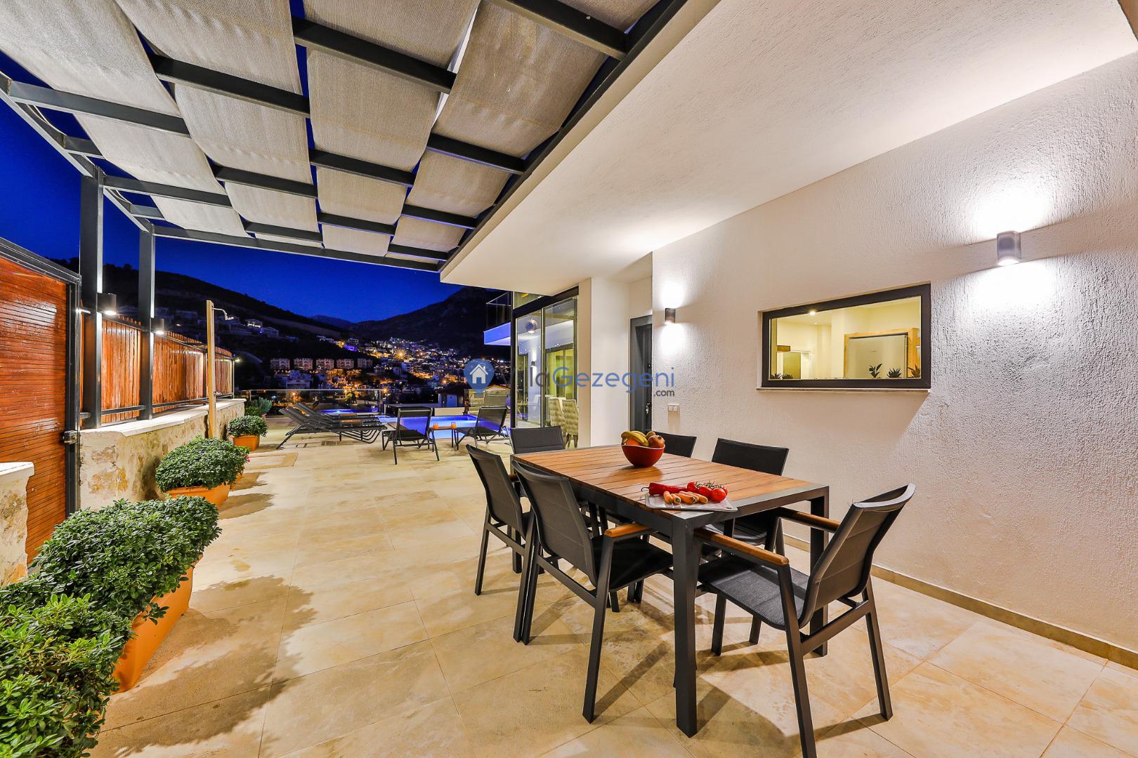 Kalkan Kalamar Mevkiinde yer alan 5 yatak odalı 10 kişi kapasiteli deniz manzaralı geniş aile ve arkadaş grupları için uygun kiralık tatil villası.