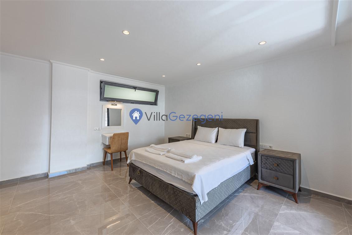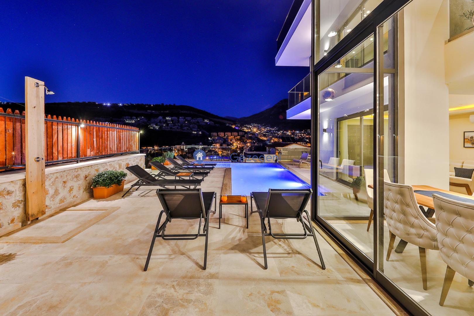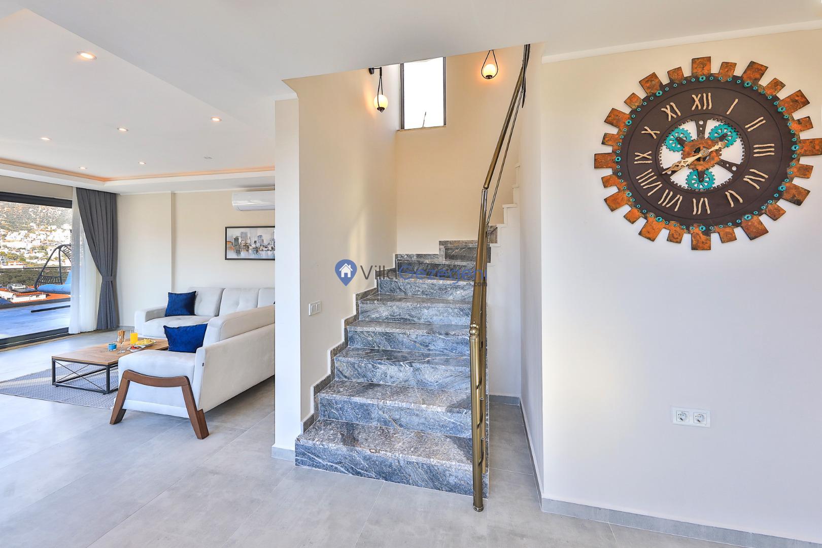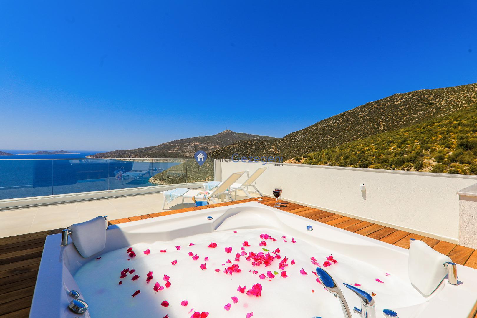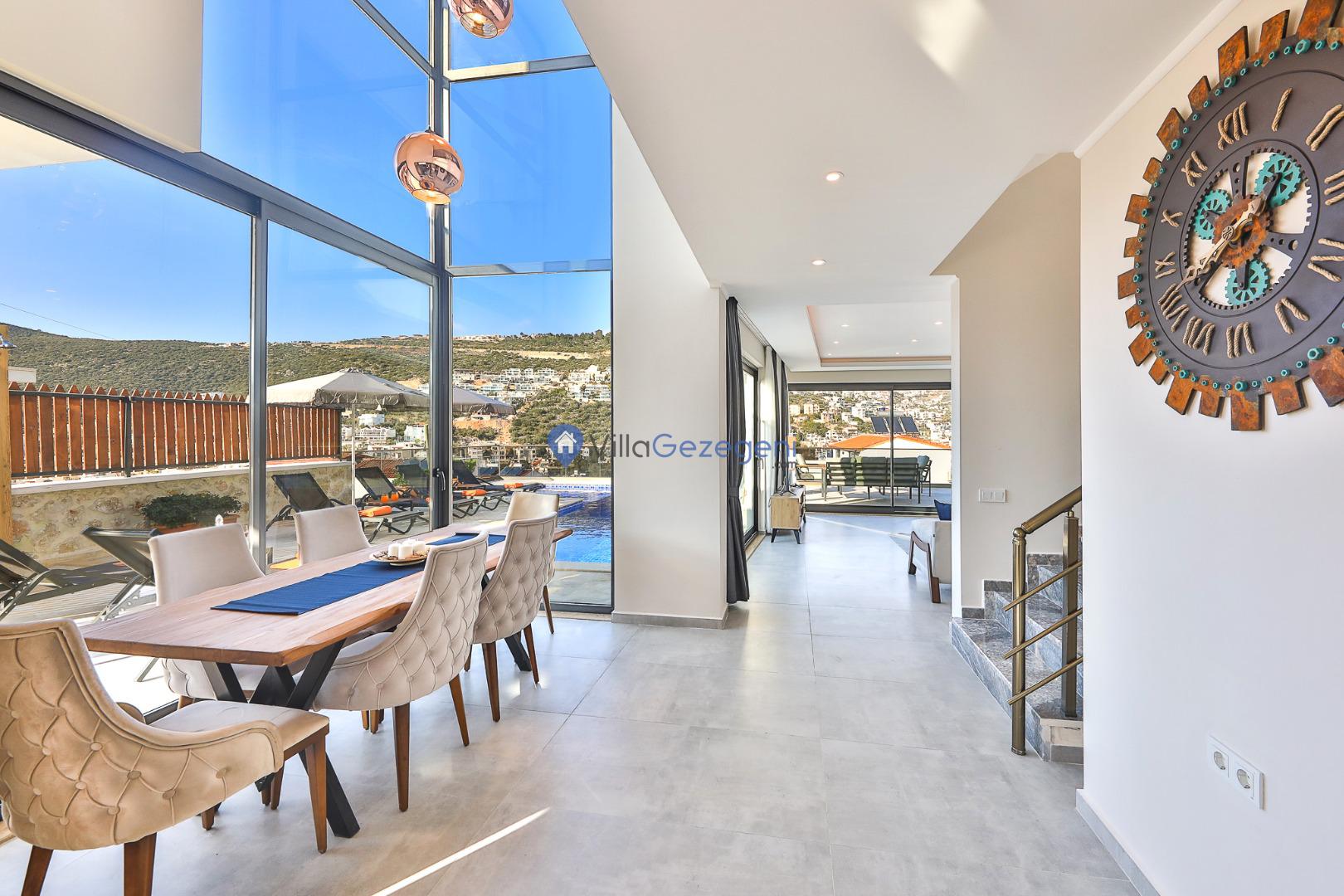 Kalkan Kalamar Mevkiinde yer alan 5 yatak odalı 10 kişi kapasiteli deniz manzaralı geniş aile ve arkadaş grupları için uygun kiralık tatil villası.