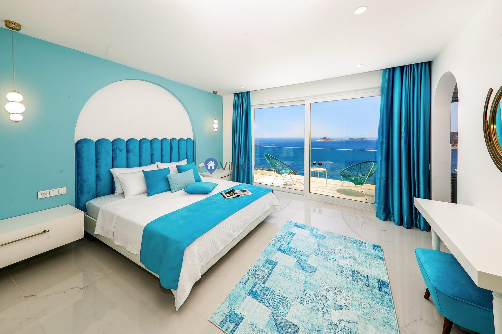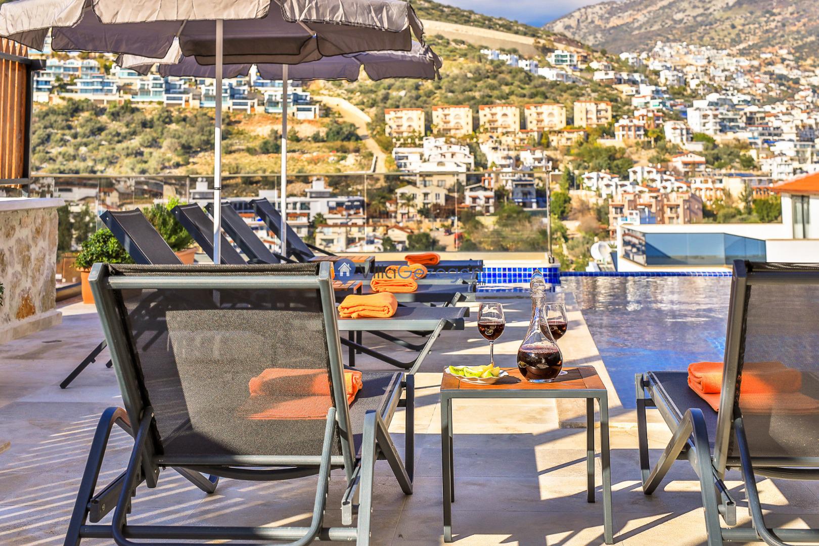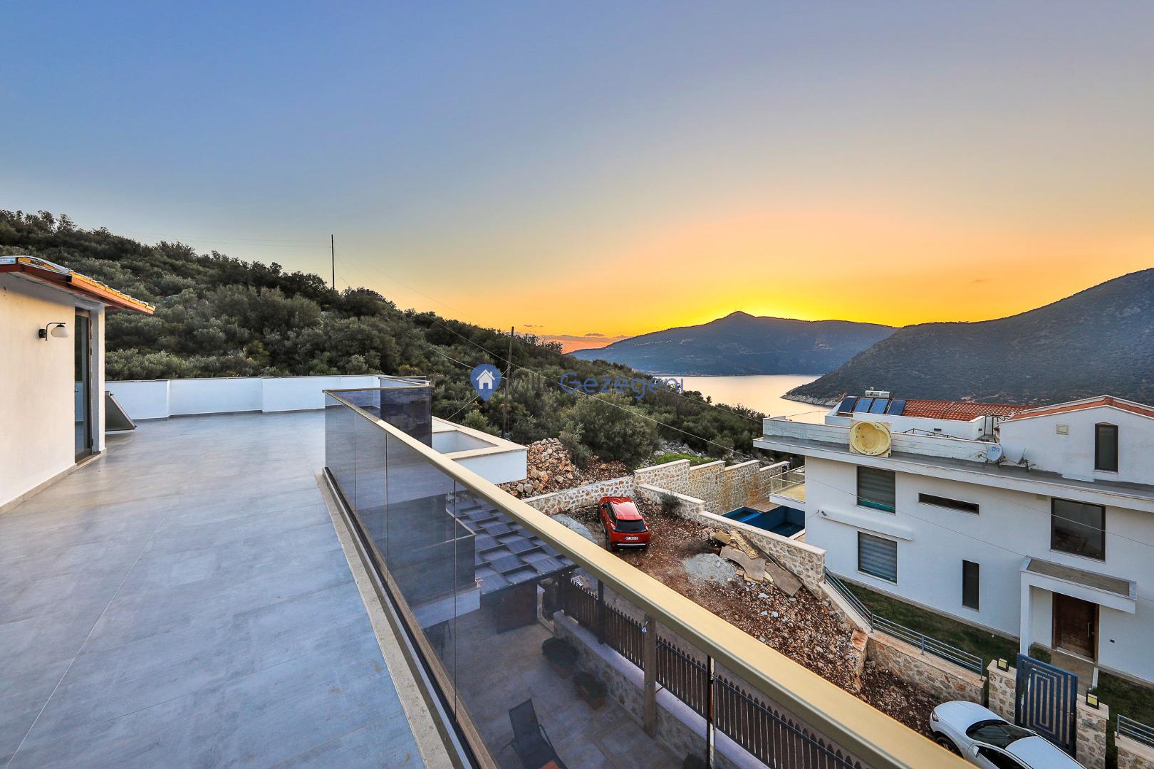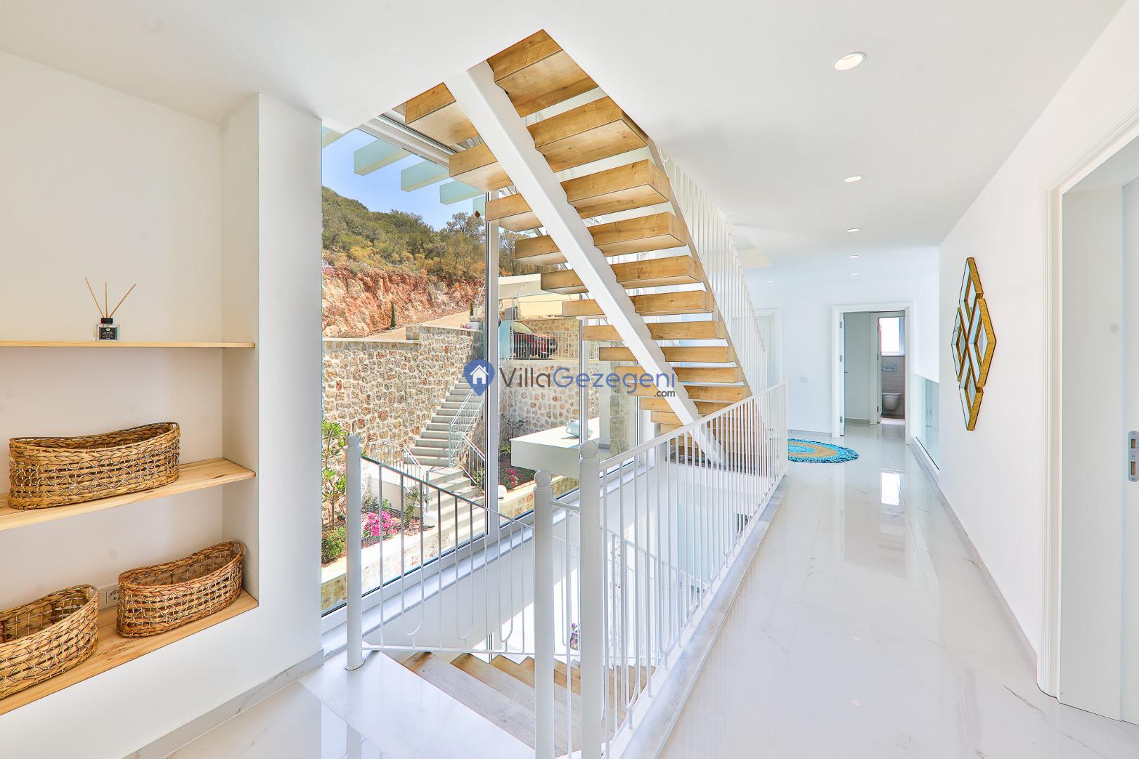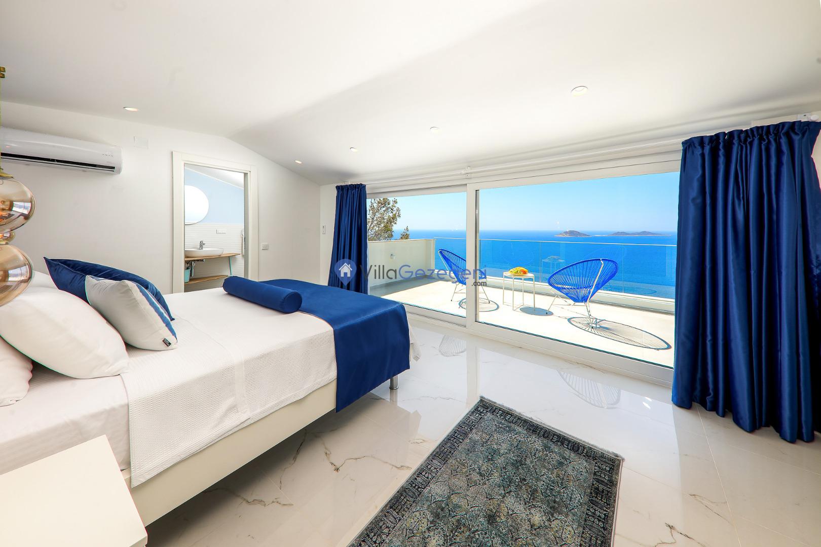Kalkan Kalamar Mevkiinde yer alan 5 yatak odalı 10 kişi kapasiteli deniz manzaralı geniş aile ve arkadaş grupları için uygun kiralık tatil villası.