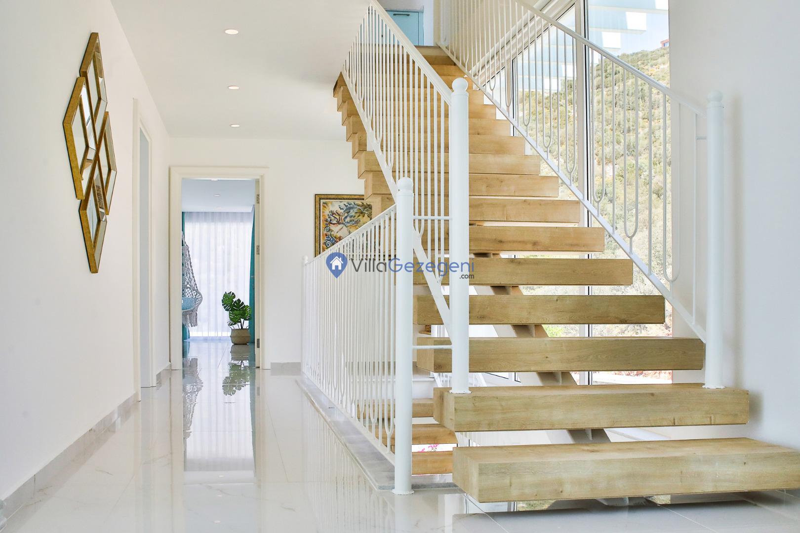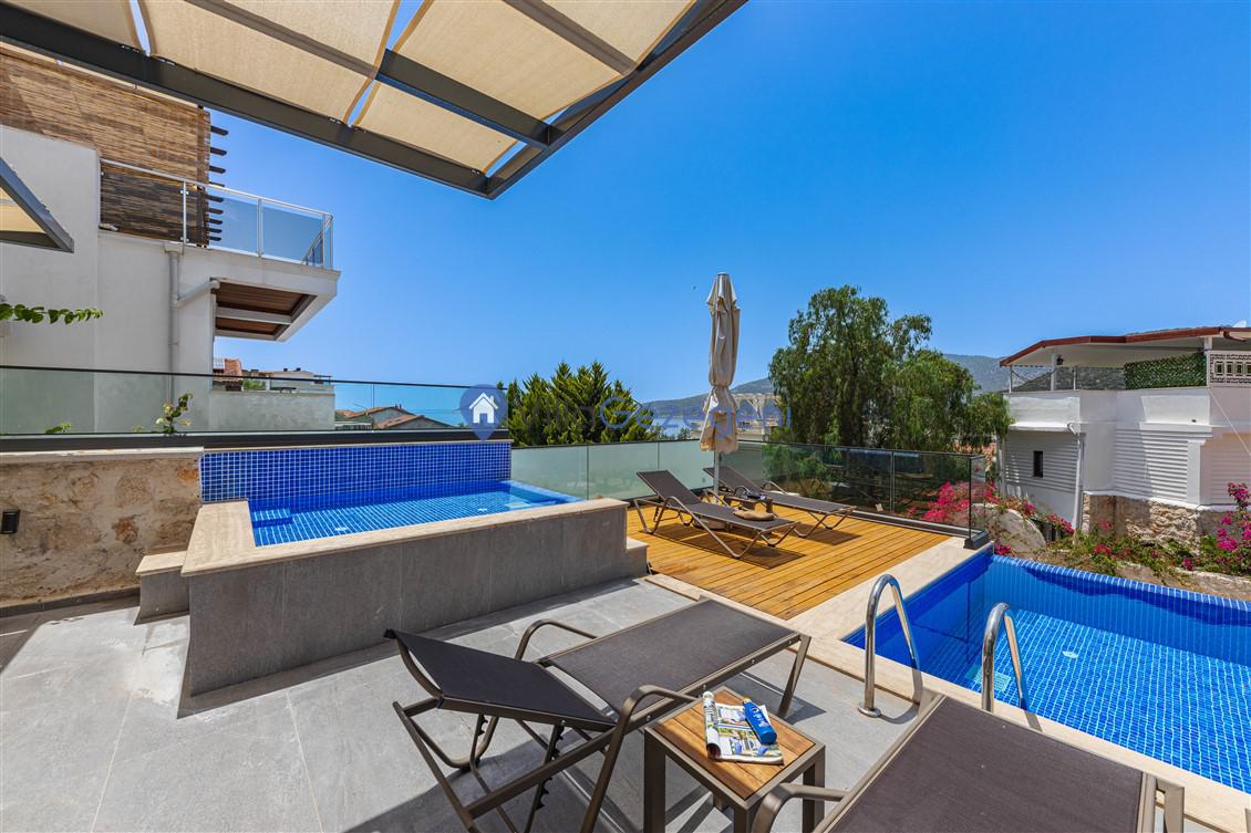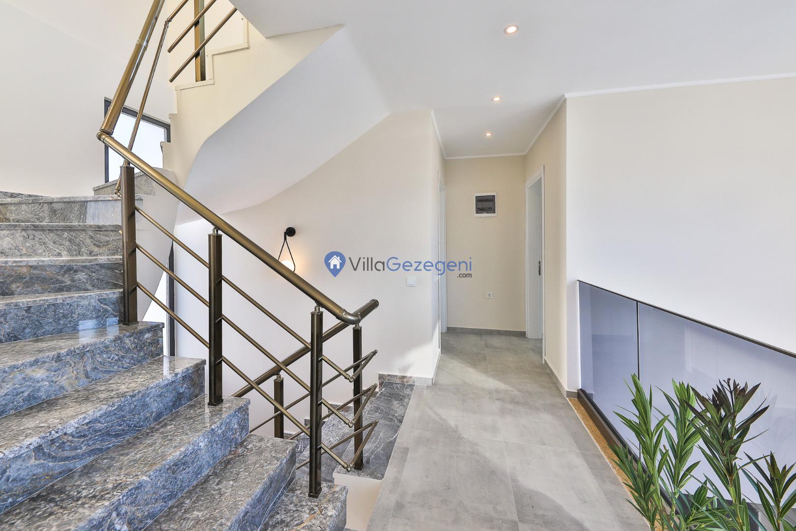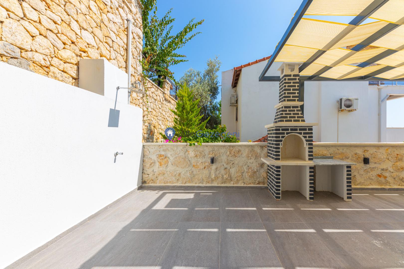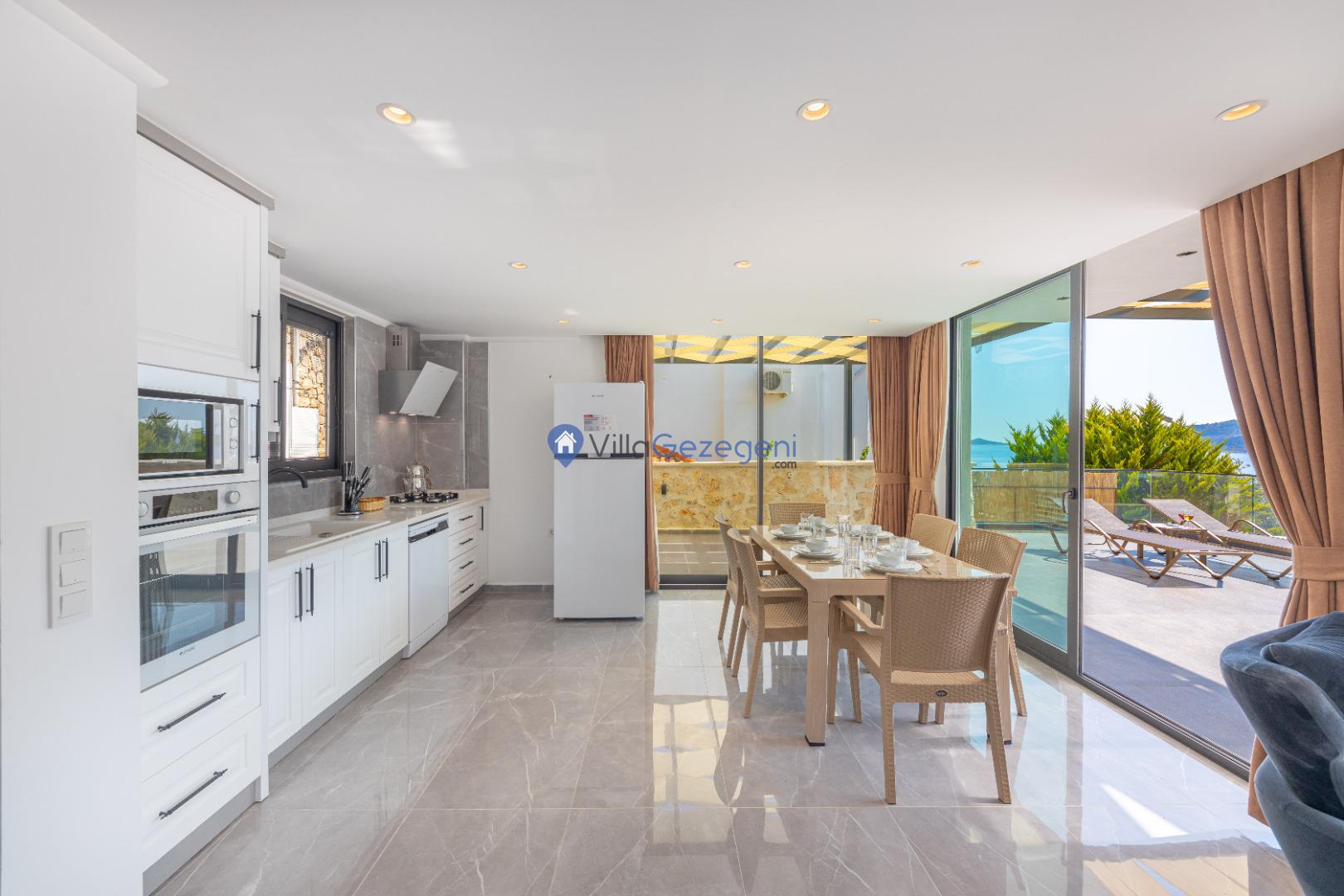 Kalkan Kalamar Mevkiinde yer alan 5 yatak odalı 10 kişi kapasiteli deniz manzaralı geniş aile ve arkadaş grupları için uygun kiralık tatil villası.